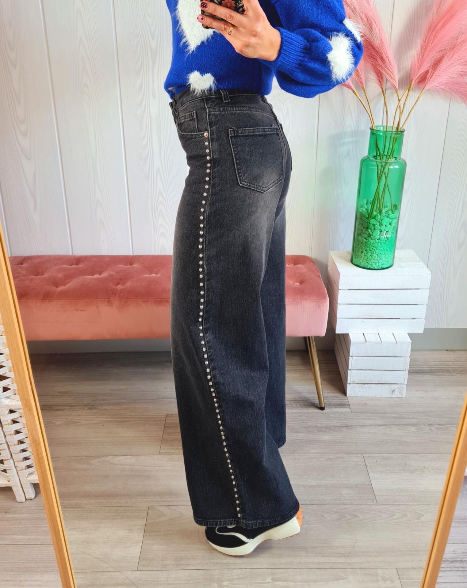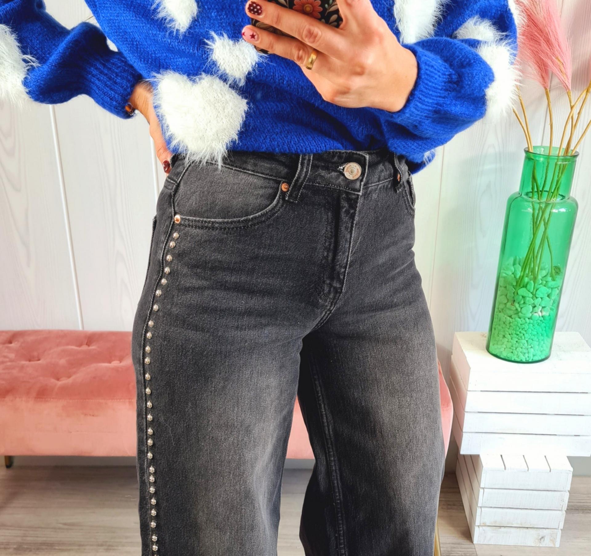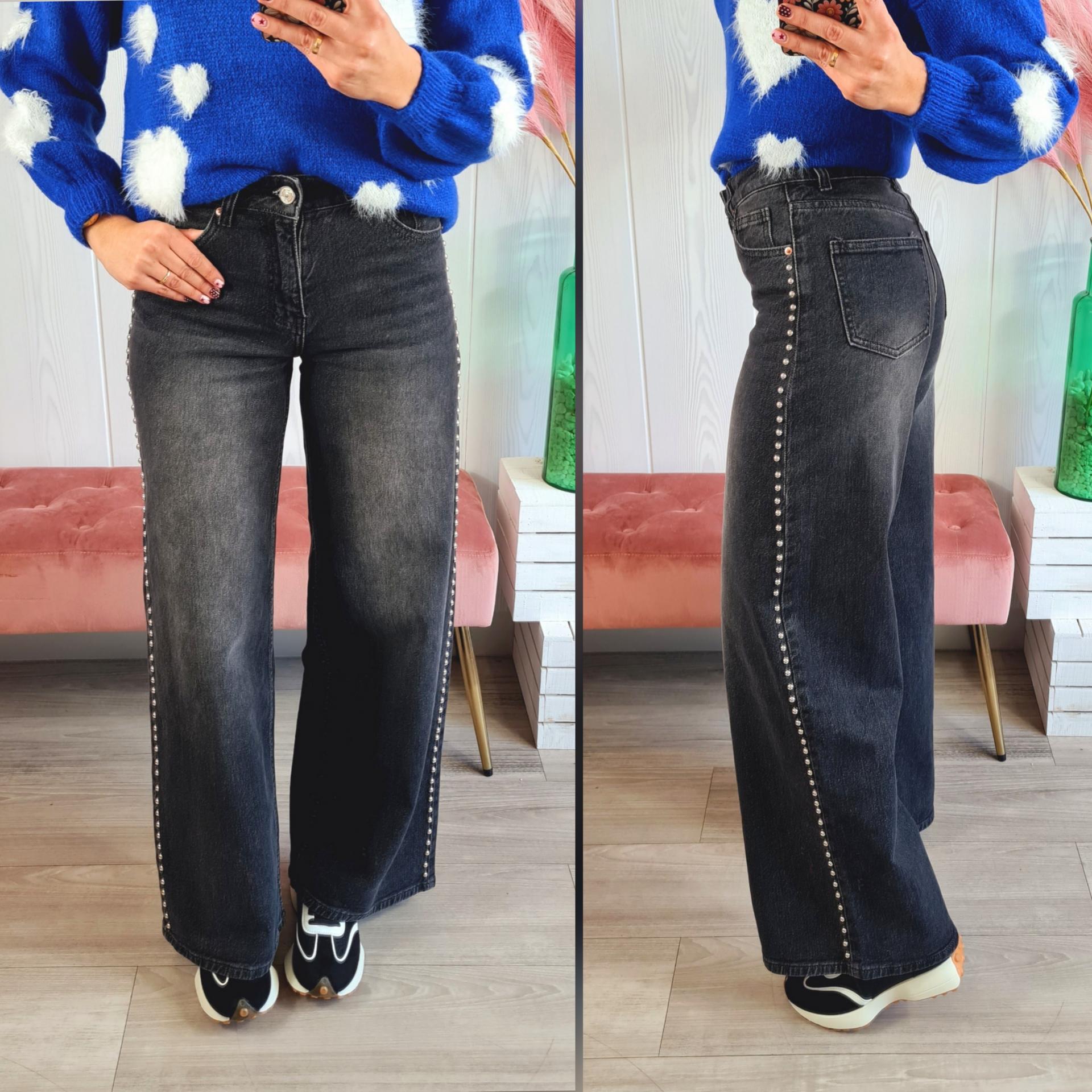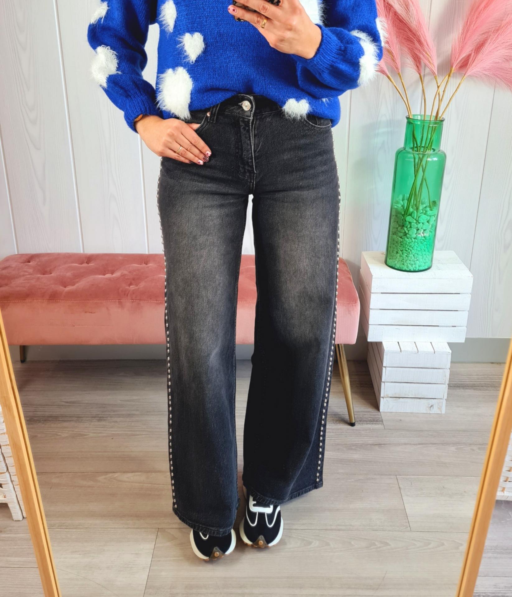 Pantalón vaquero en color gris oscuro, de corte recto y con tachas plateadas de adorno en los laterales. Tiene cierre con botón y cremallera y bajo desflecado.