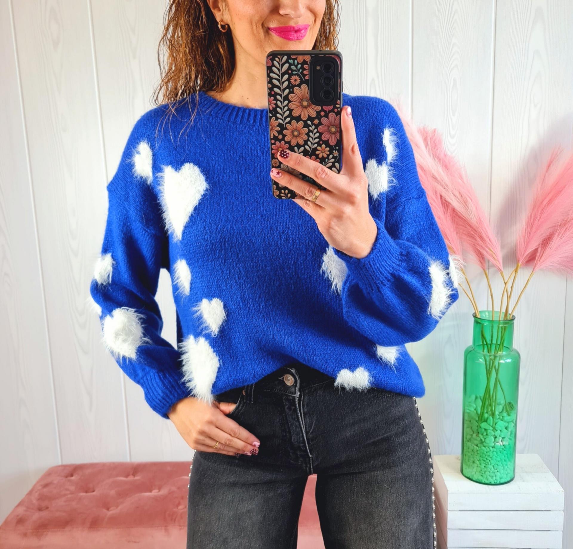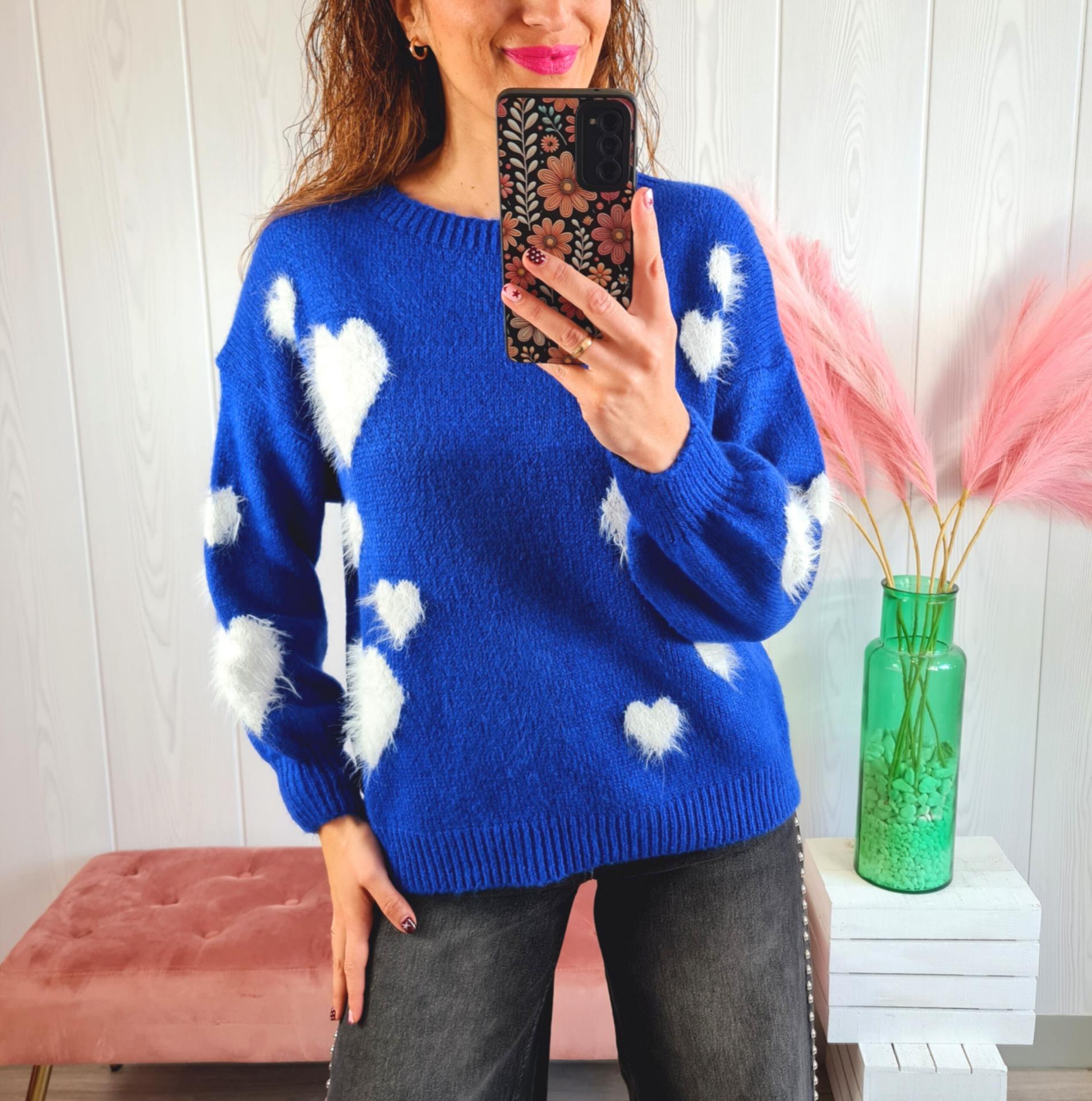 Jersey de color azul klein con corazones grandes de pelito blanco, cuello redondo y manga larga.