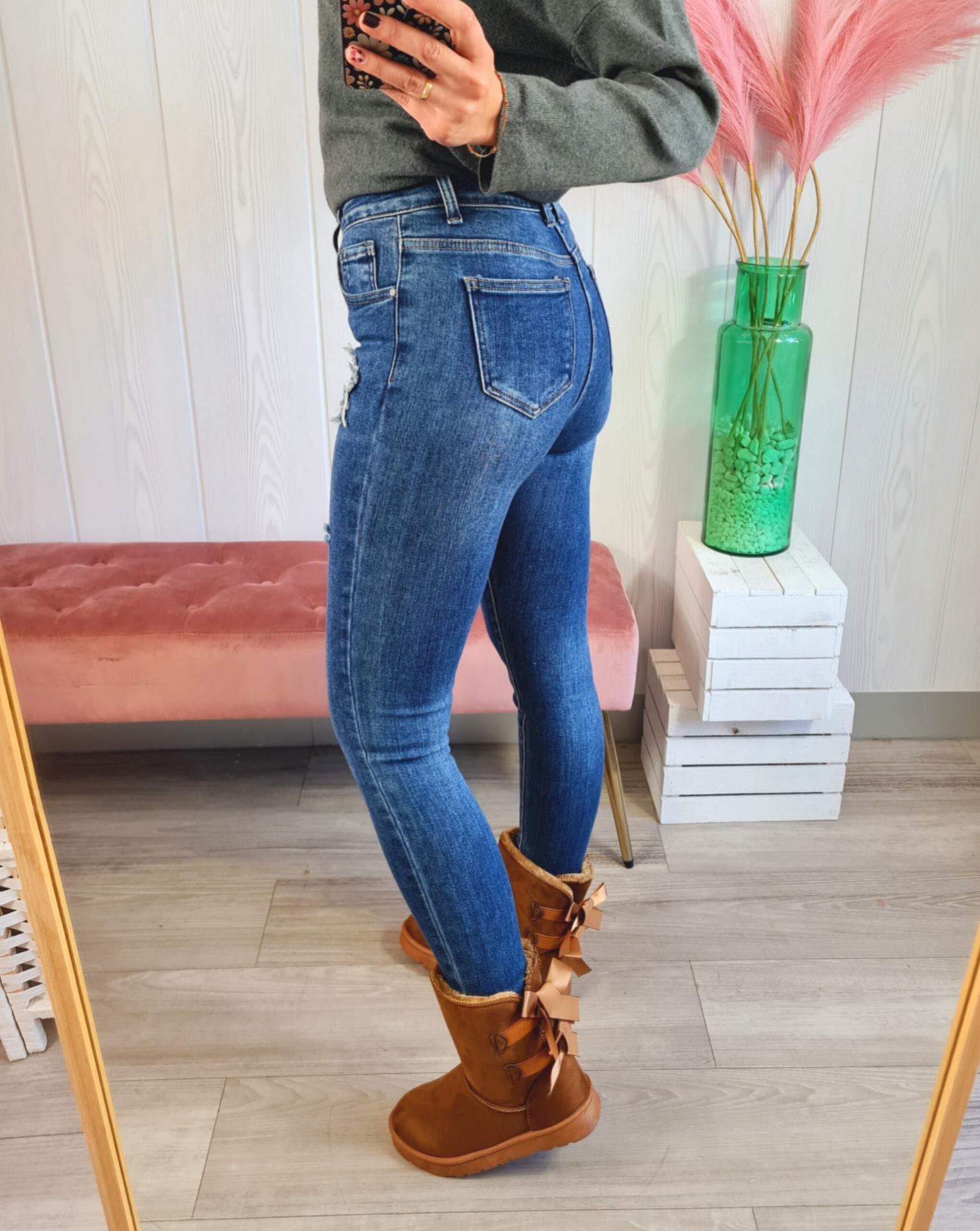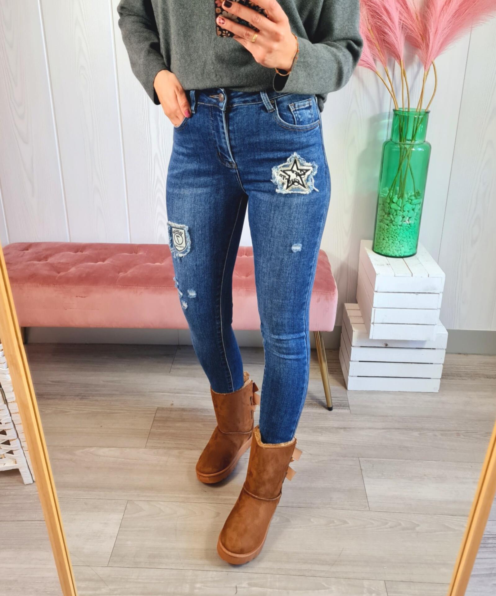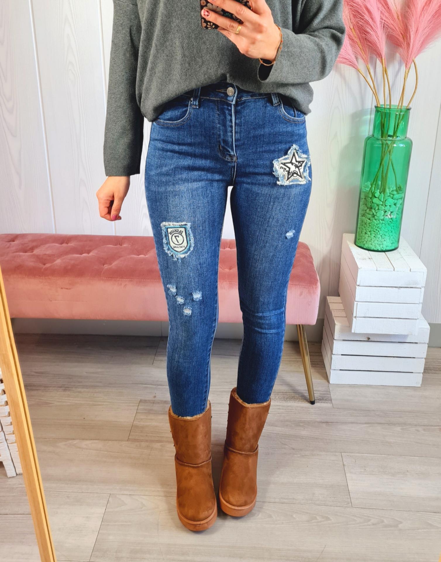 Pantalón vaquero de tono medio, pitillo, y con adorno en la parte delantera de parches. Tiene cierre con botón y cremallera.