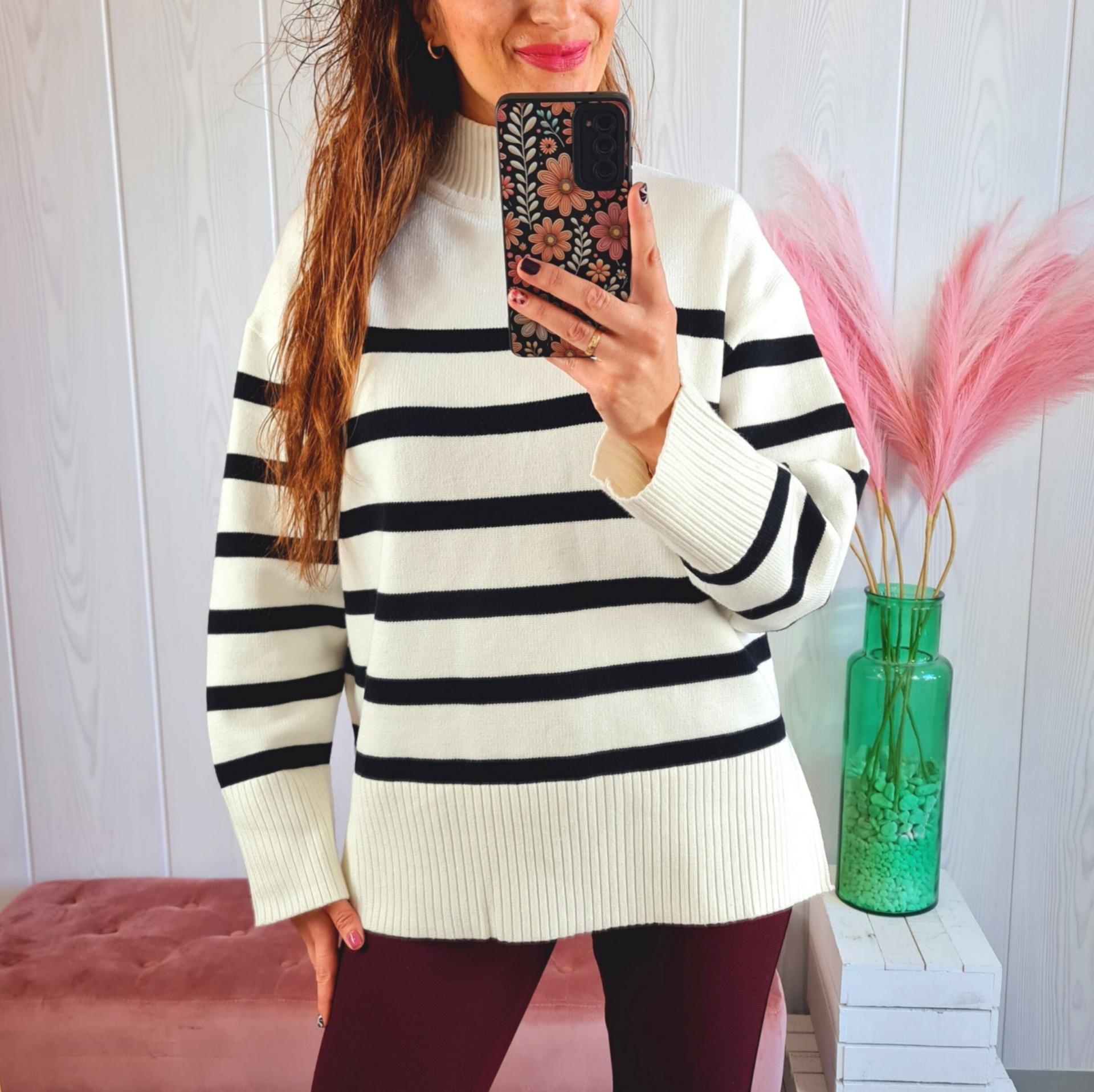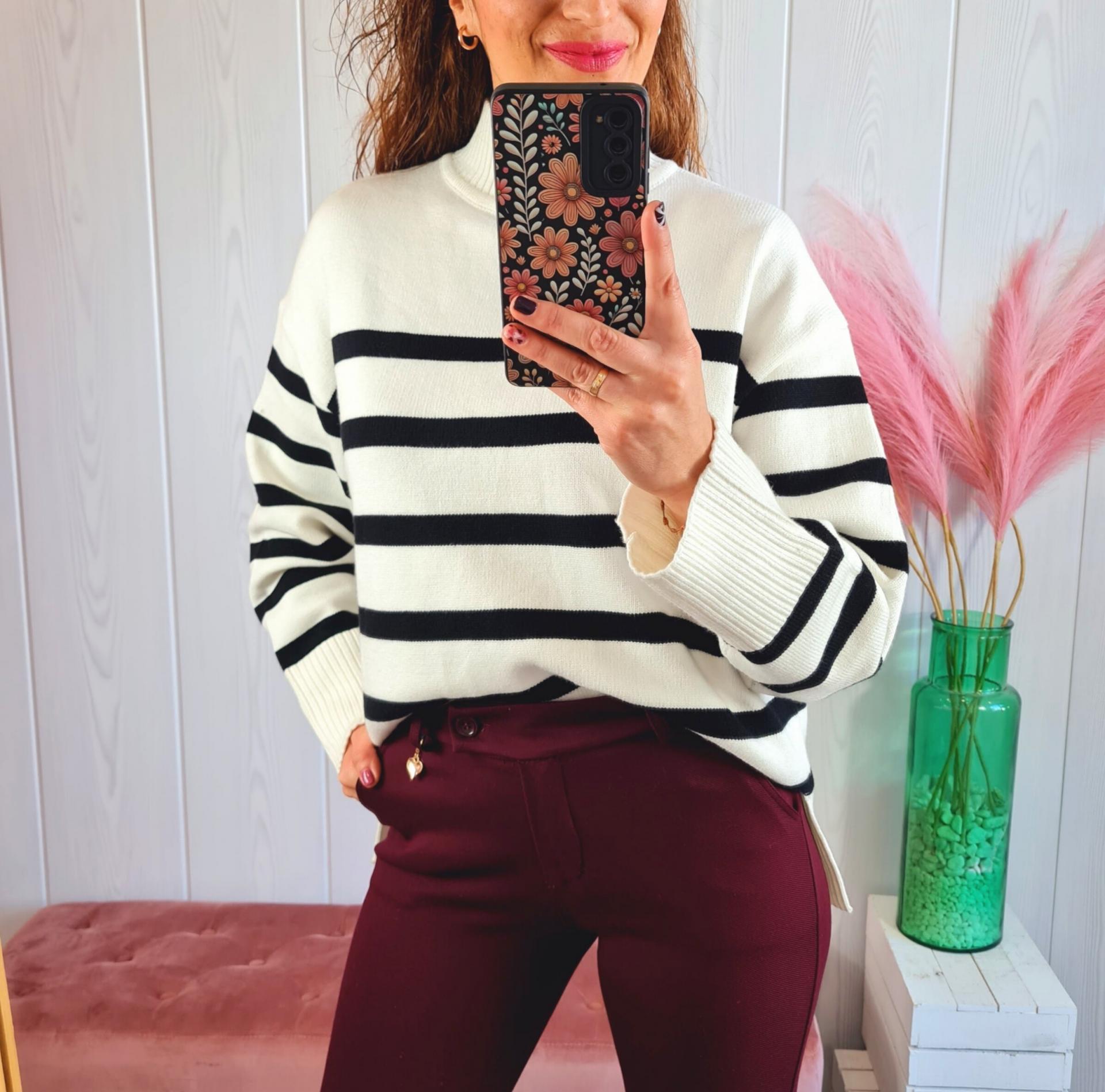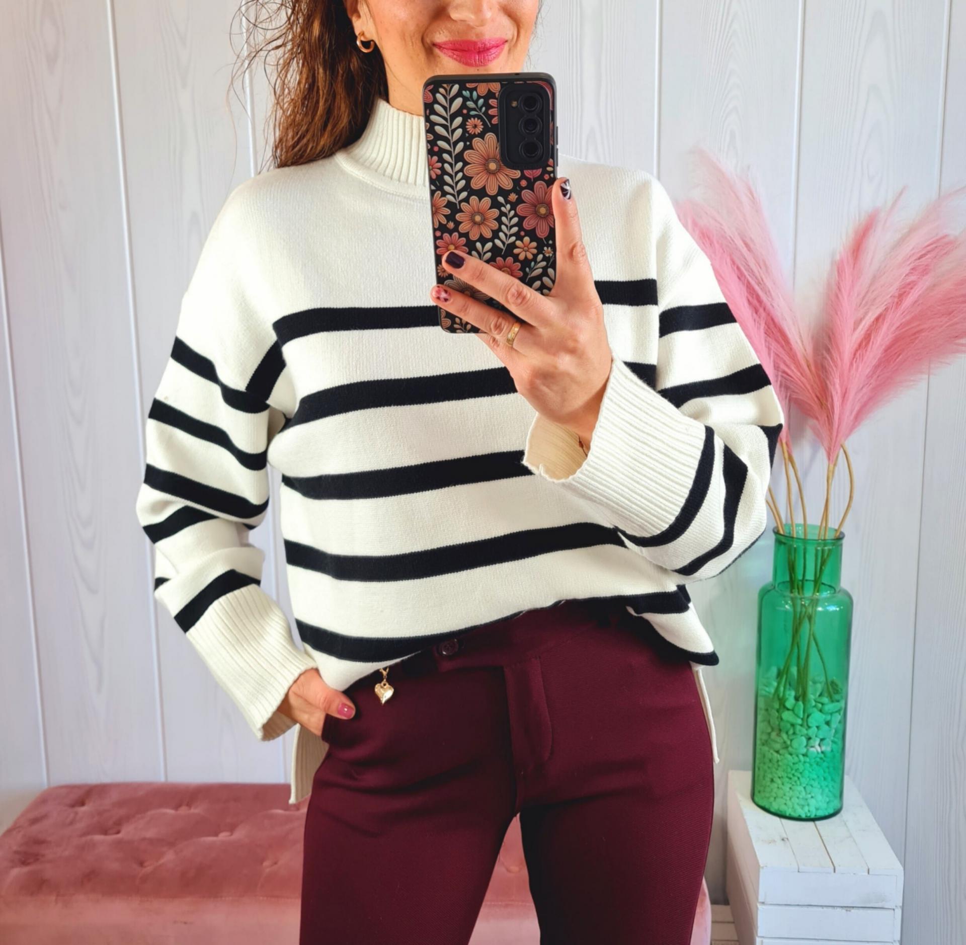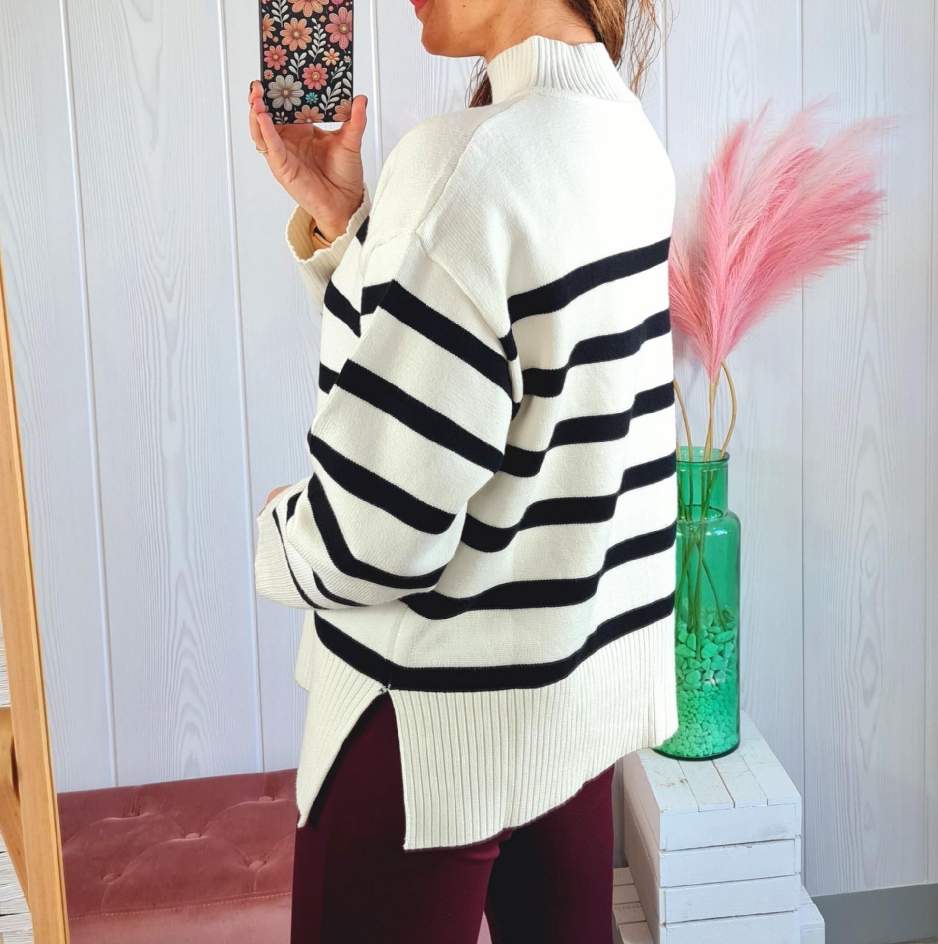 Jersey de color blanco con rayas negras. Tiene cuello redondo y manga larga.