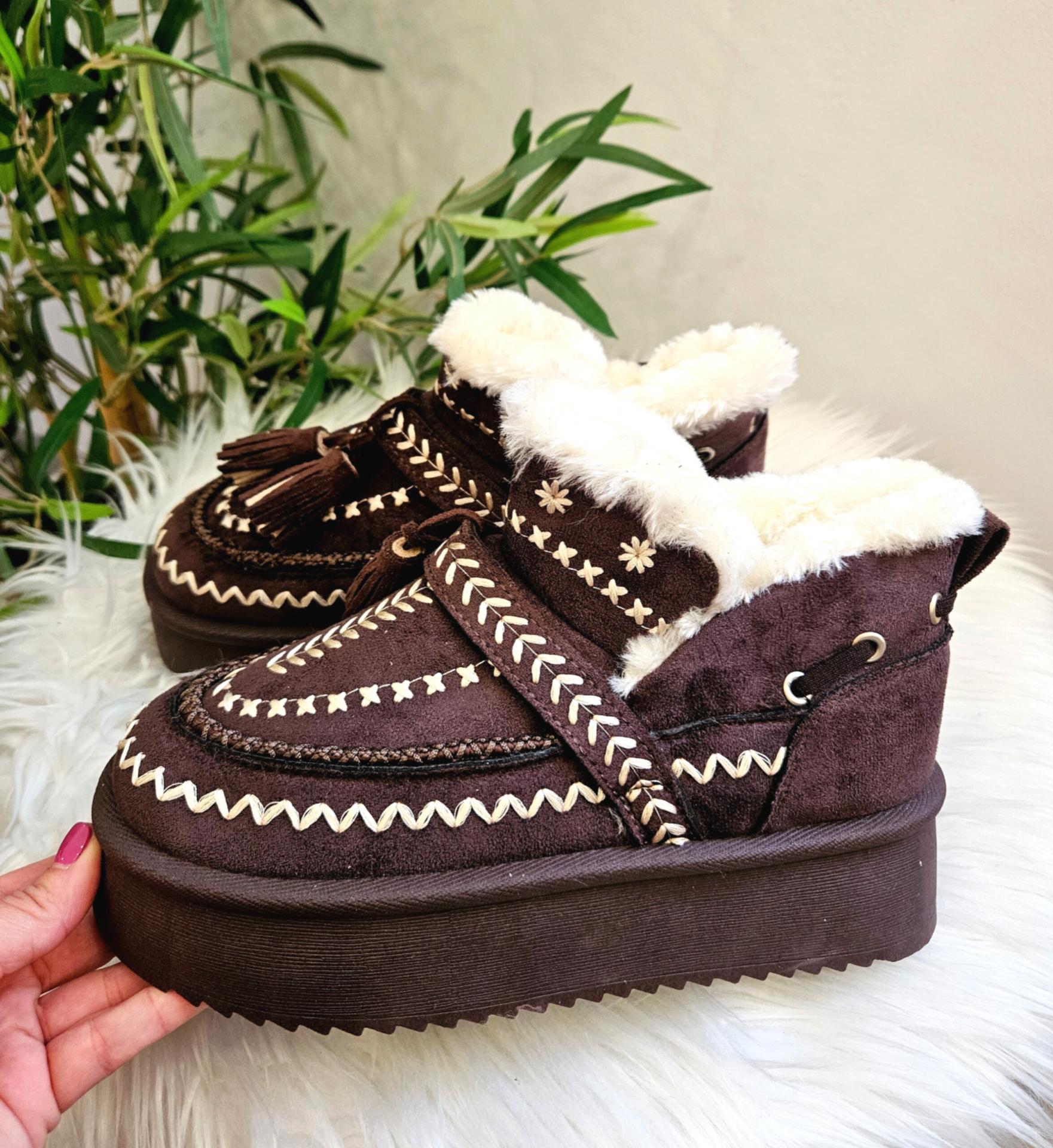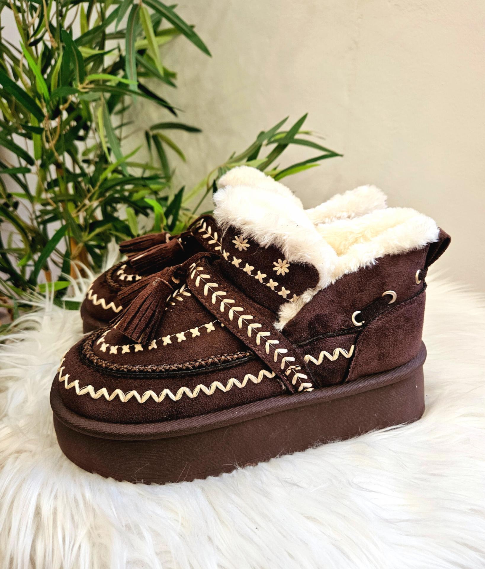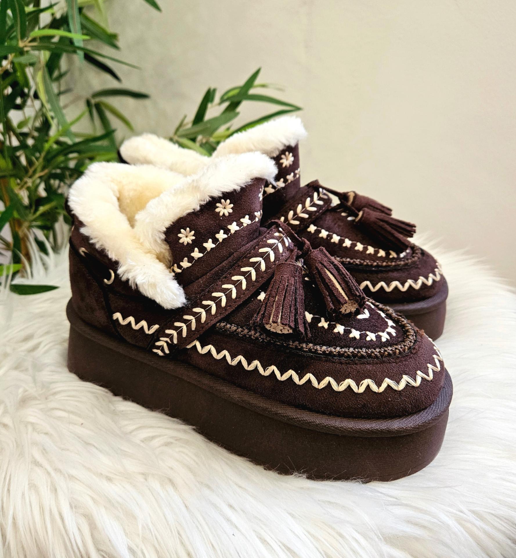 Botines de plataforma en color marrón chocolate, forrados de pelito blanco, costura en blanco y florecitas bordadas de adorno.
