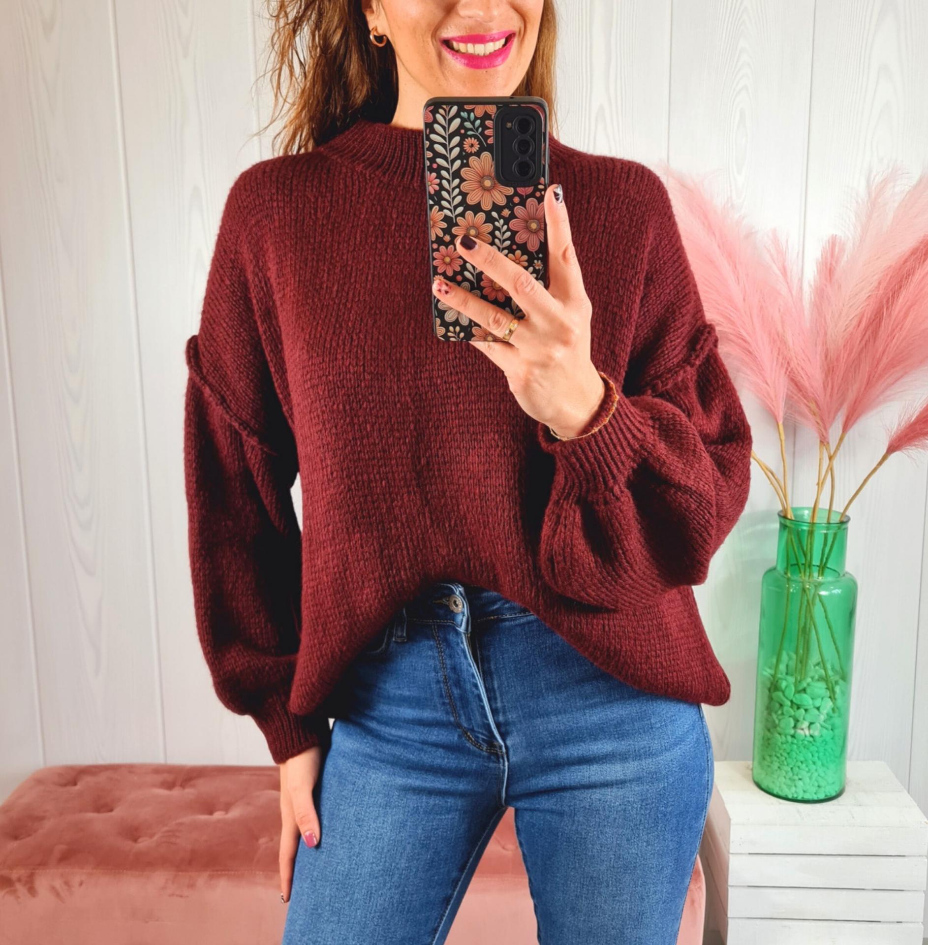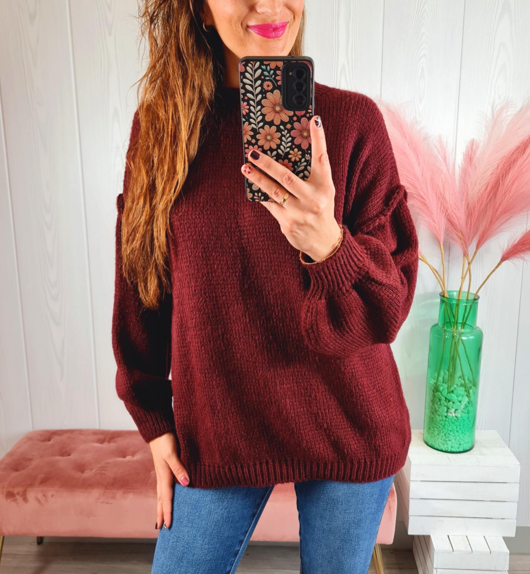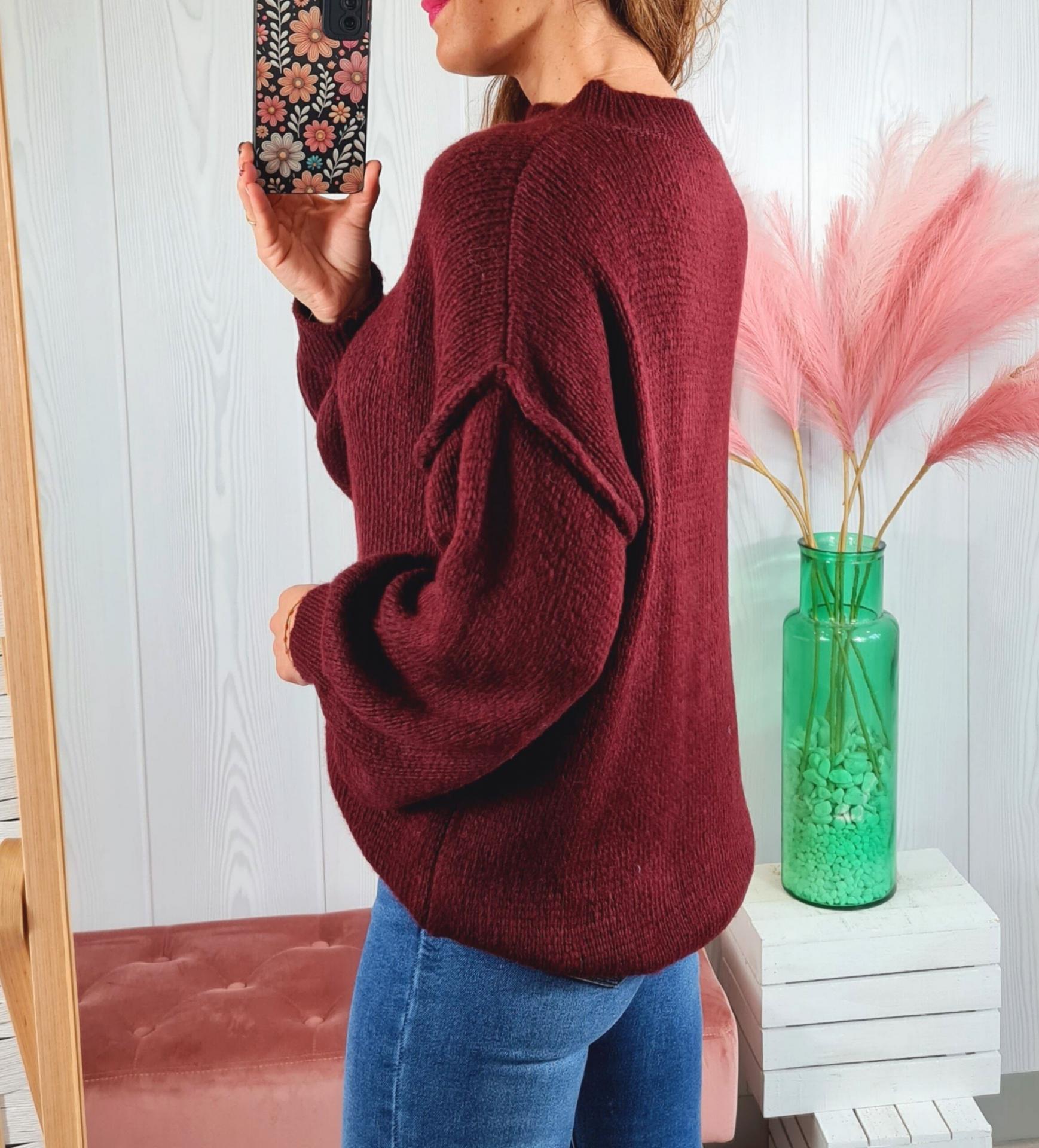 Maxi jersey de color granate, cuello redondo y manga larga.