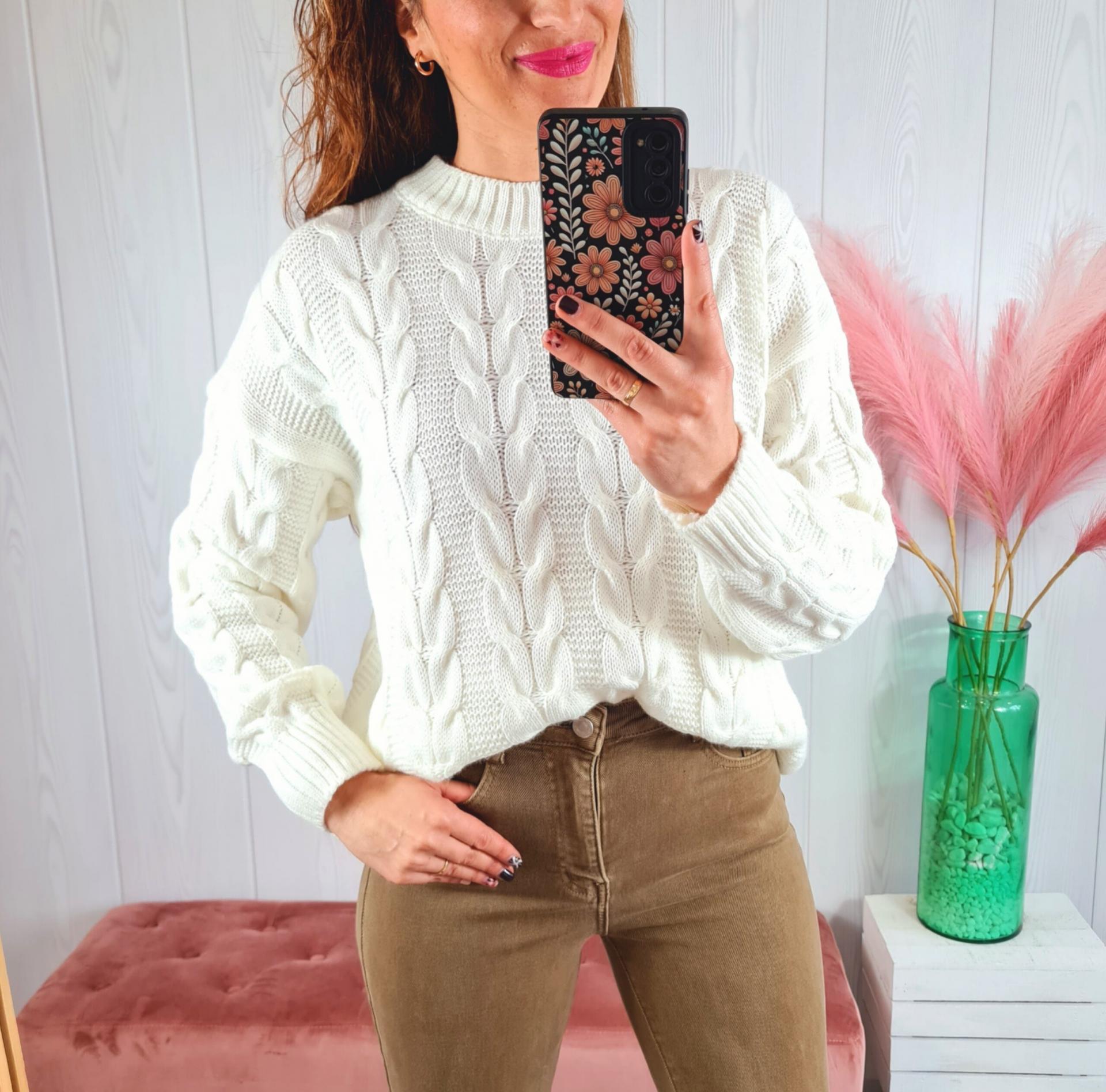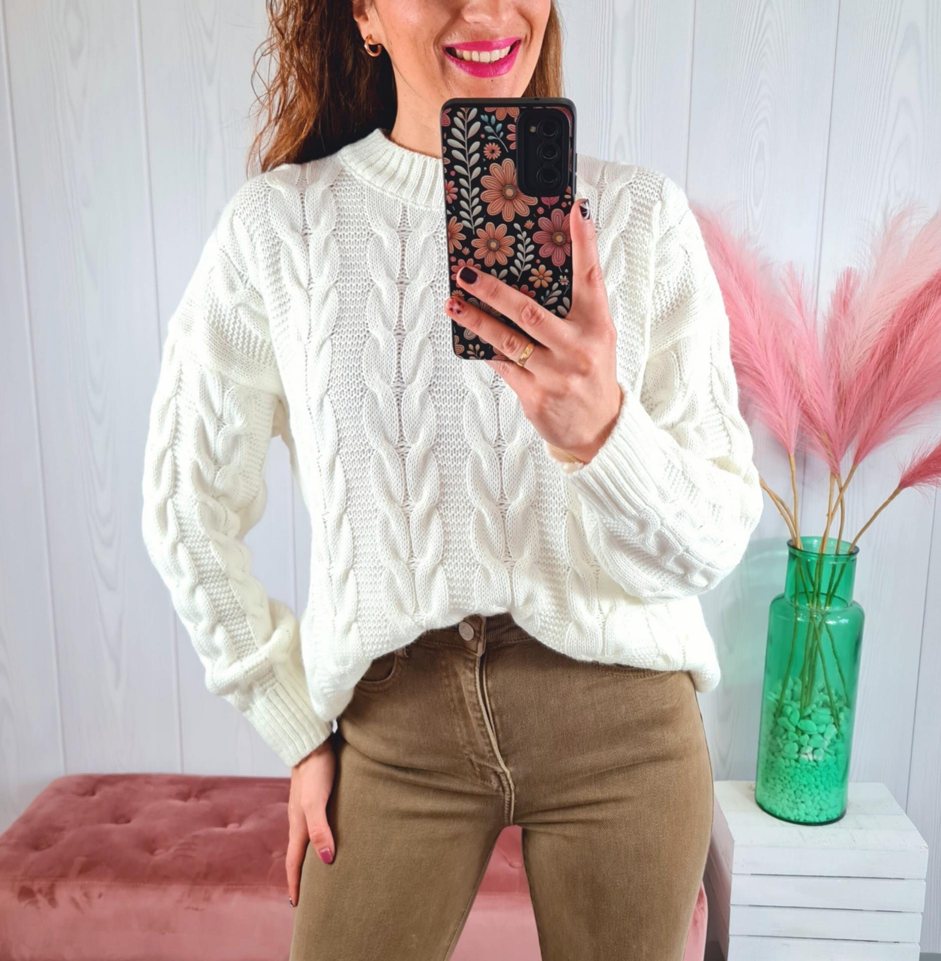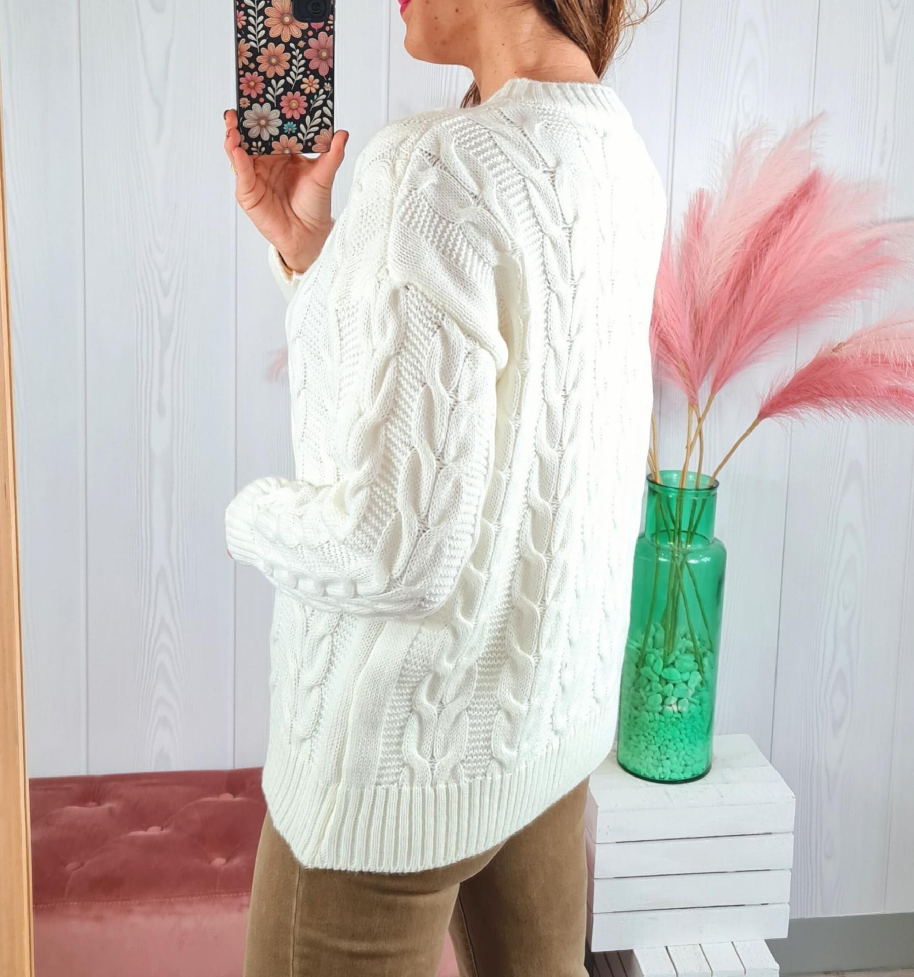 Jersey blanco con punto trenzado. Tiene cuello redondo y manga larga.