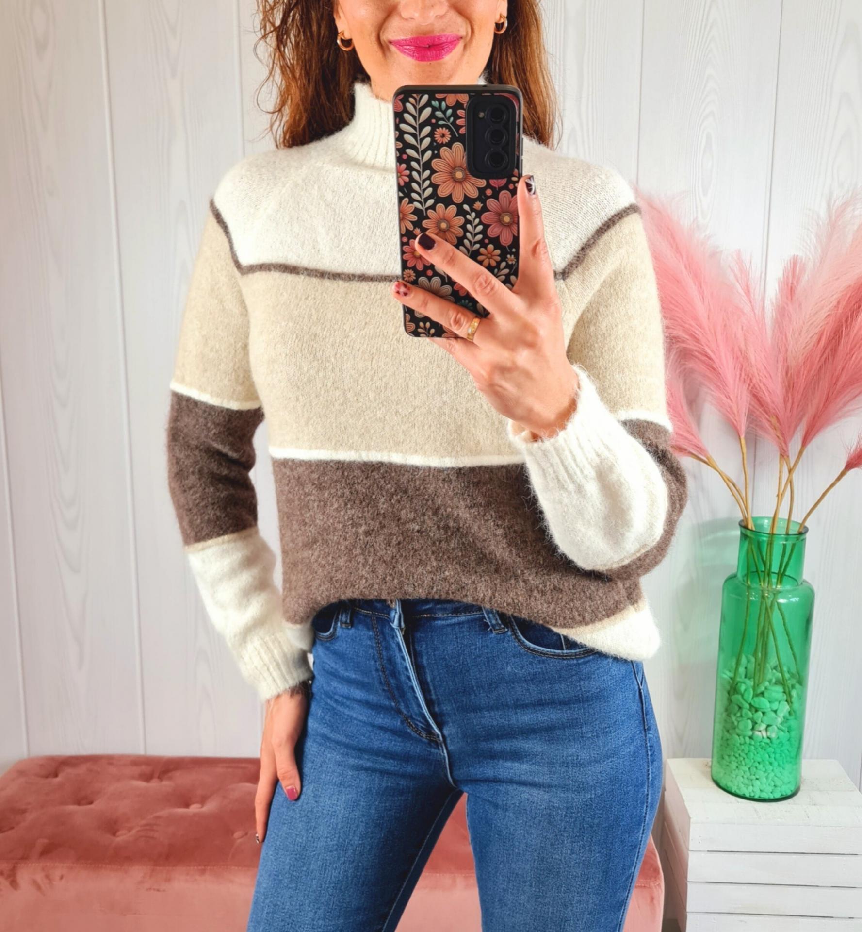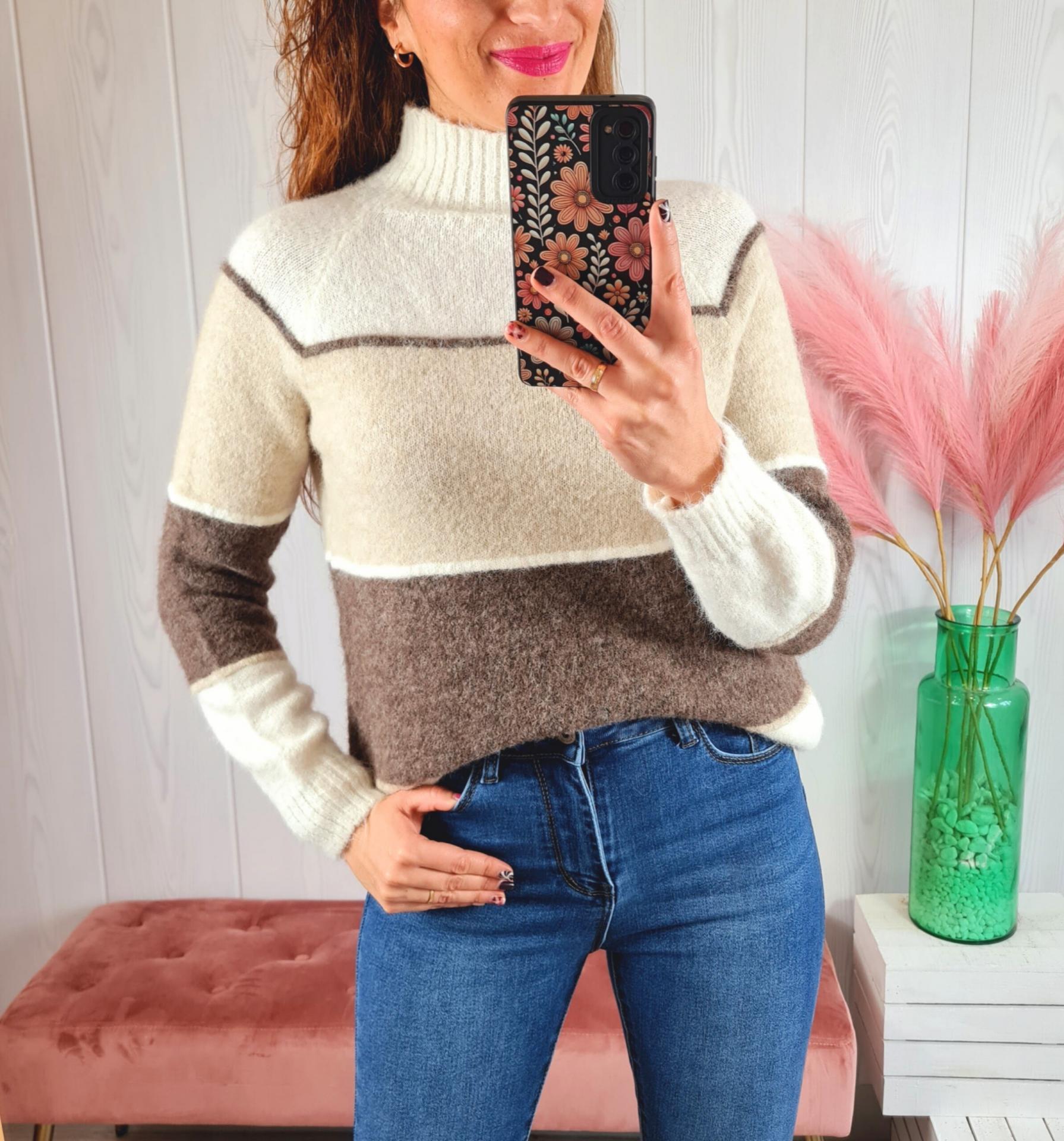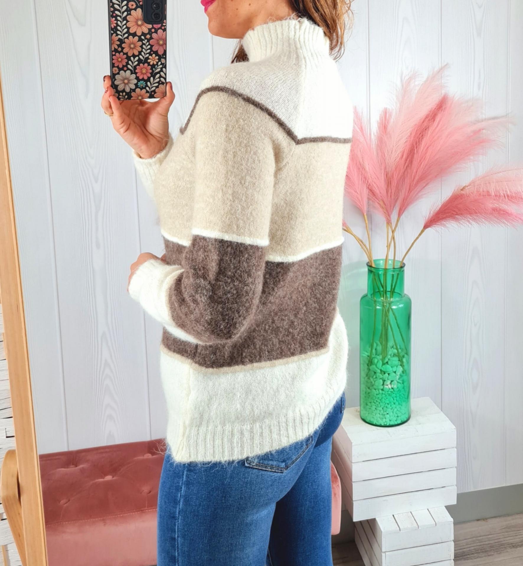 Jersey tricolor en tonos beige. Tiene cuello subido y manga larga.