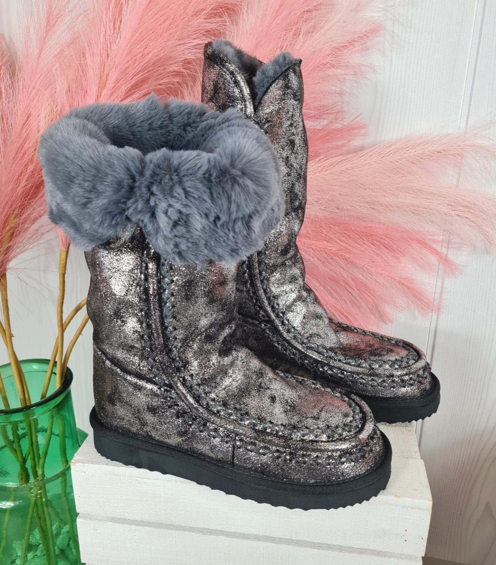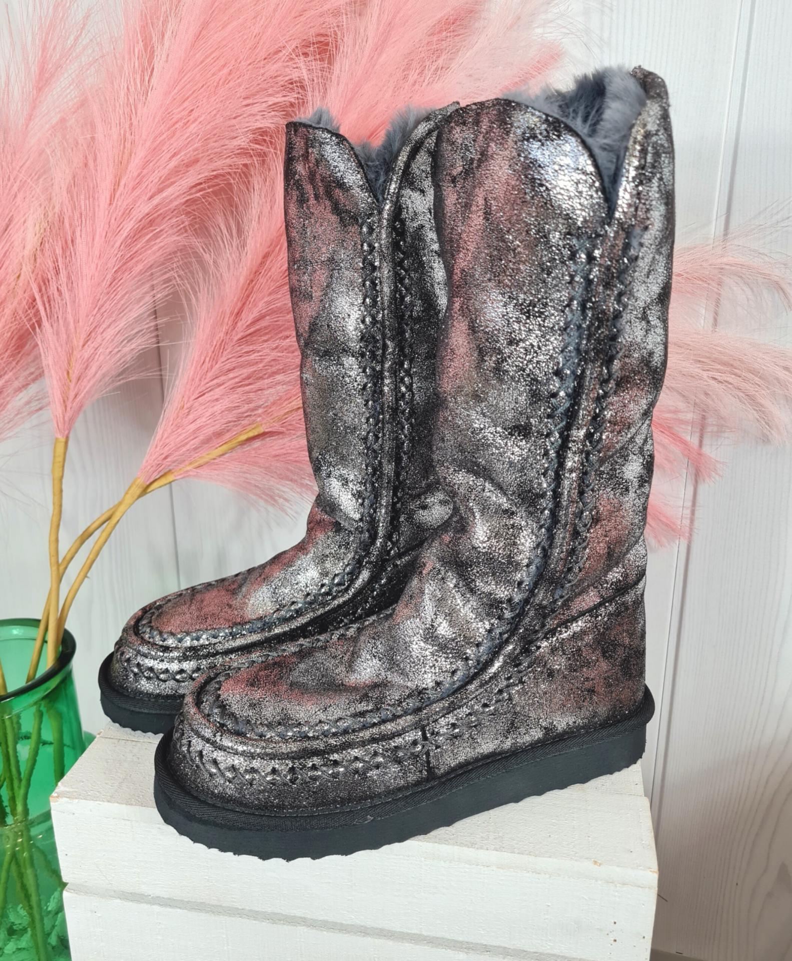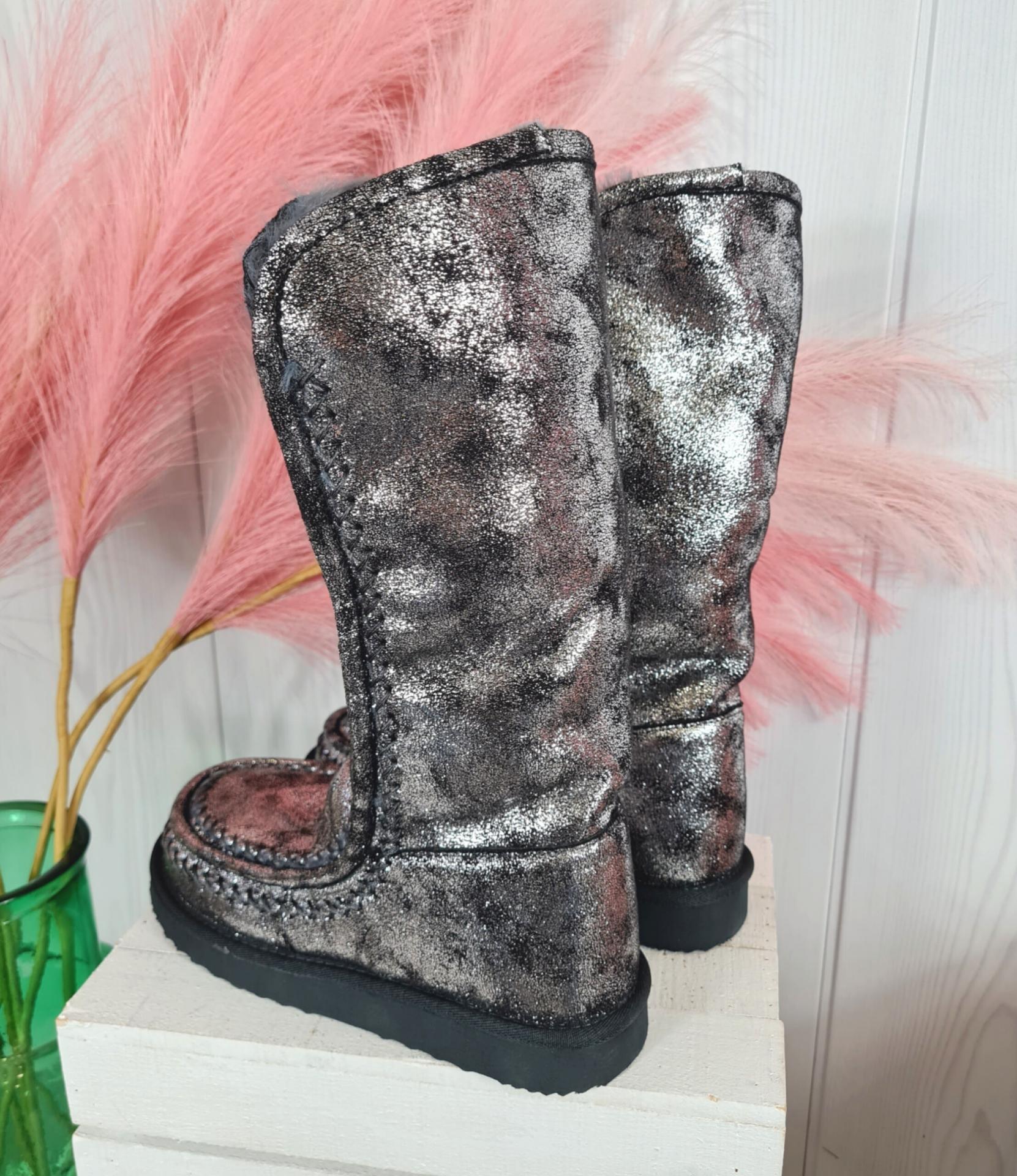 Botas color plateado, forradas por dentro y se pueden poner estiradas o dobladas para fuera.
