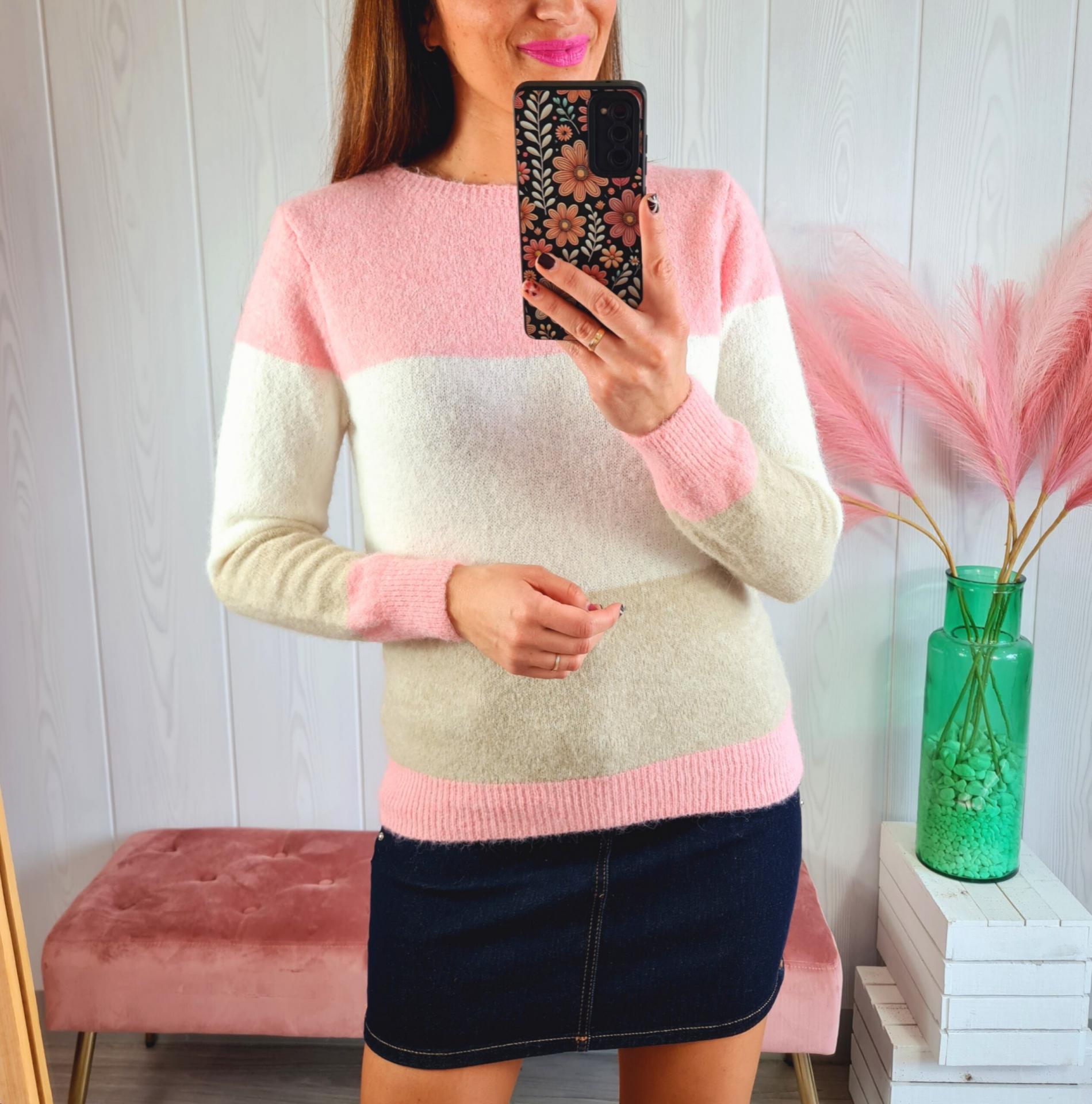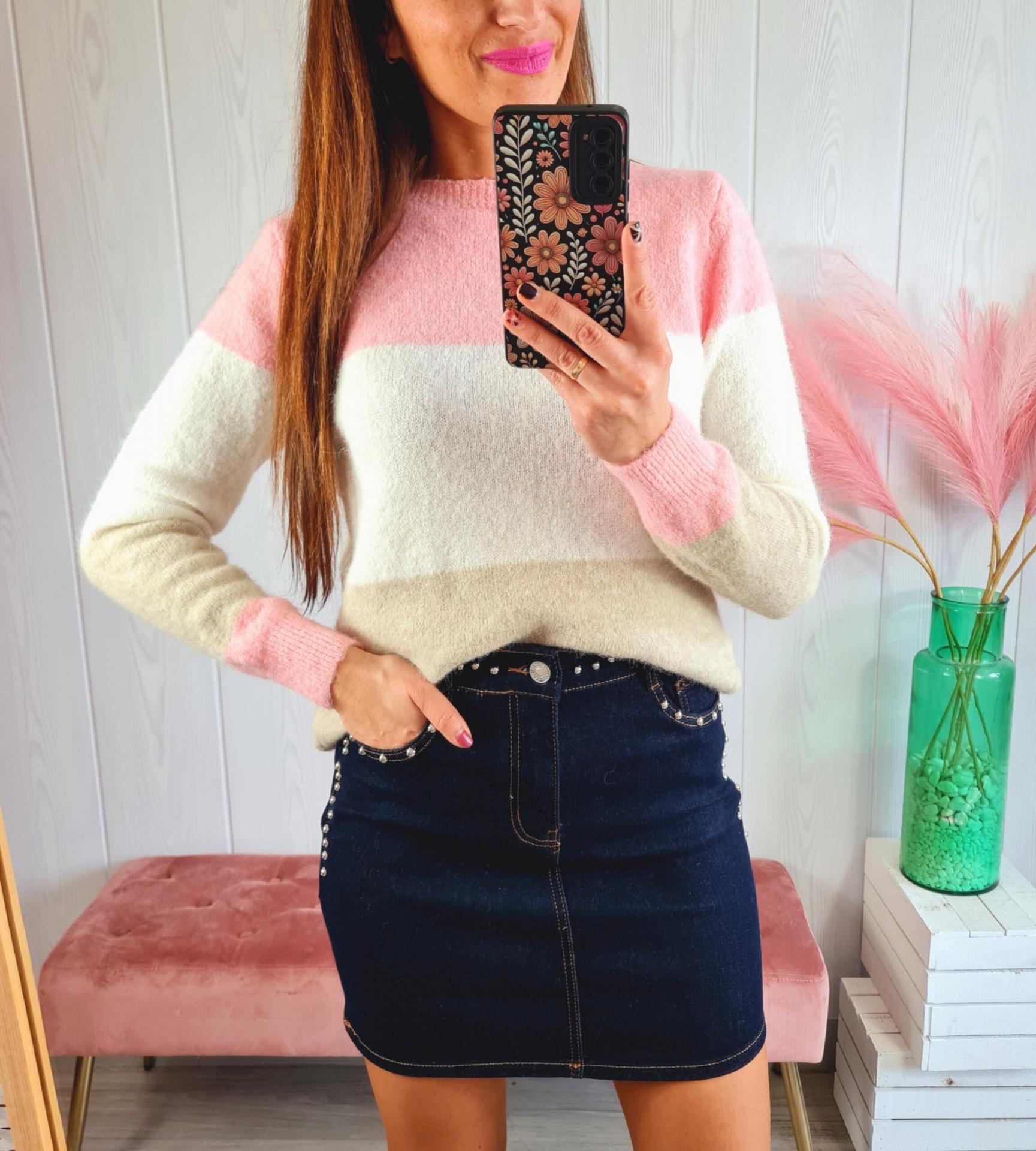 Jersey tricolor en tonos rosa, blanco y beige. Tiene cuello redondo y manga larga.