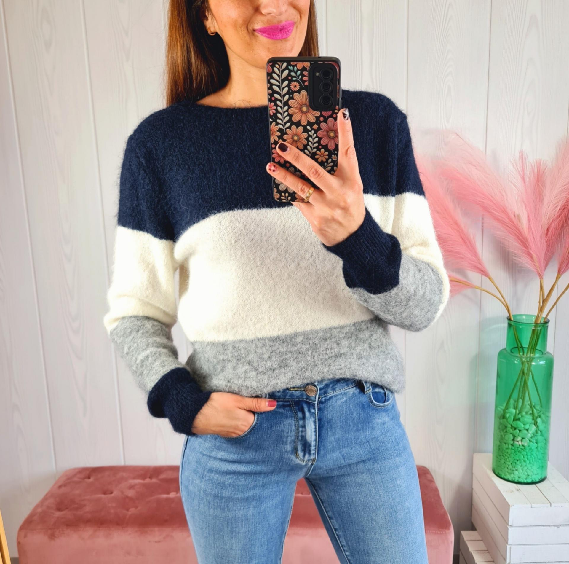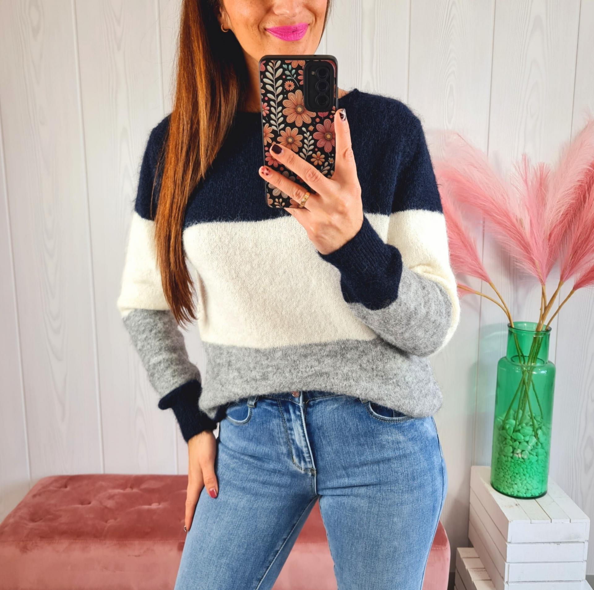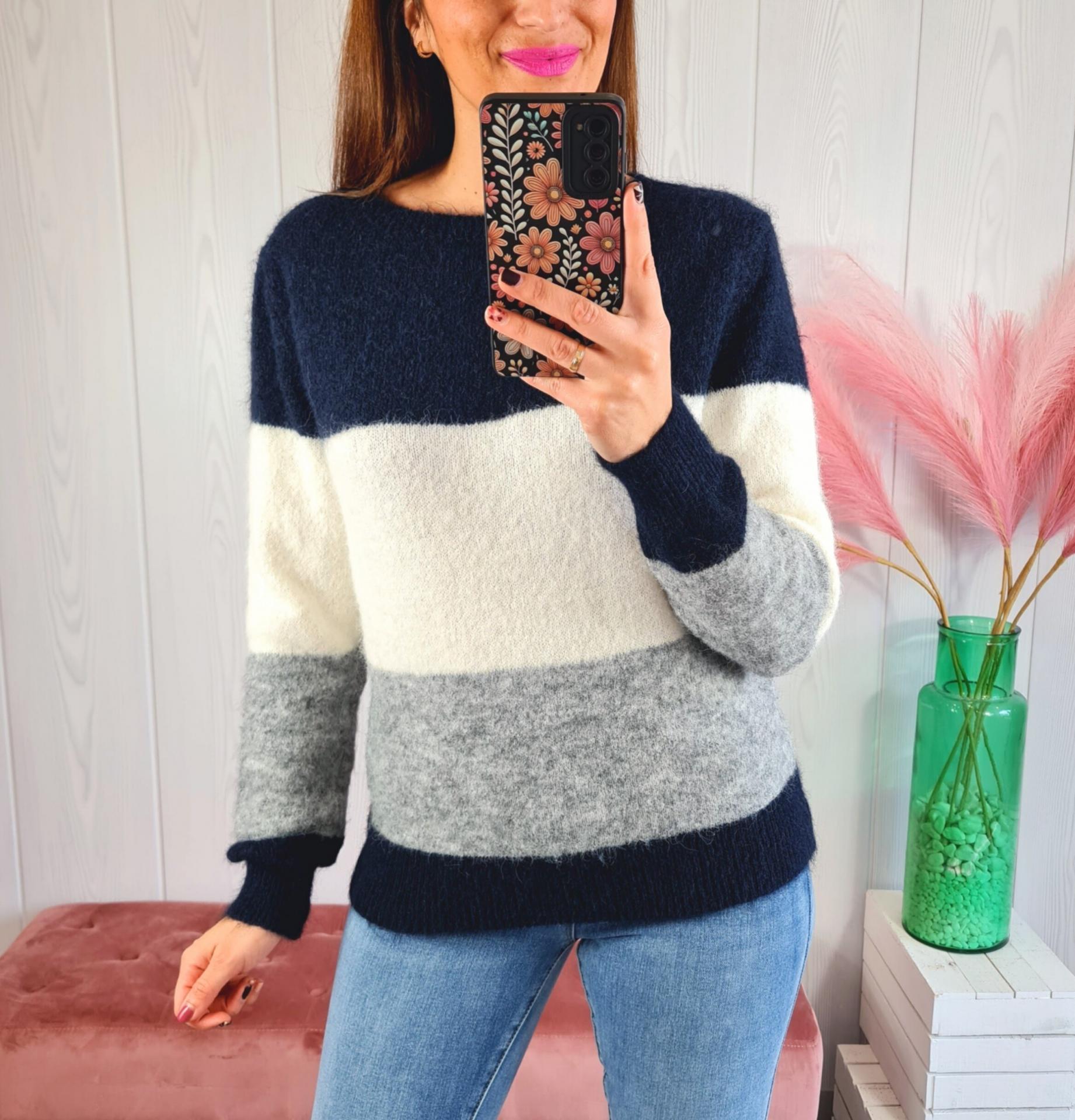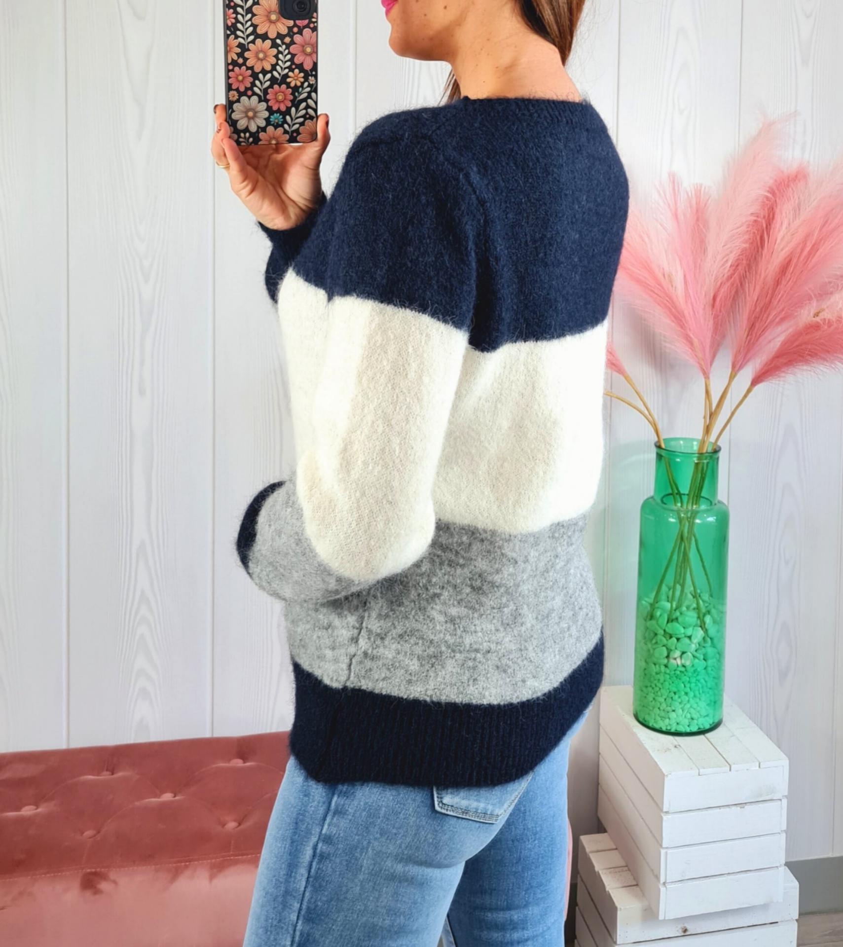 Jersey tricolor en tonos azul, blanco y gris. Tiene cuello redondo y manga larga.