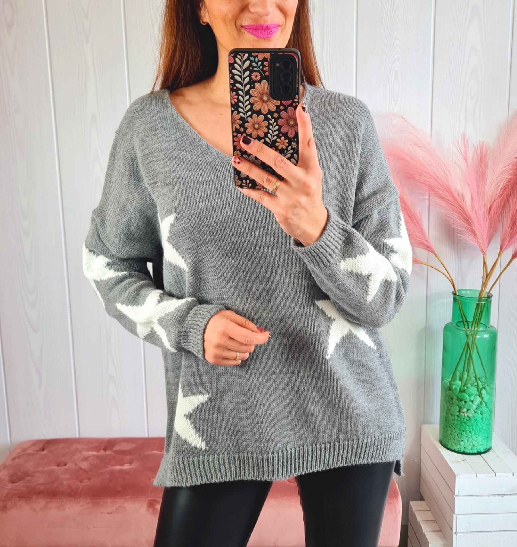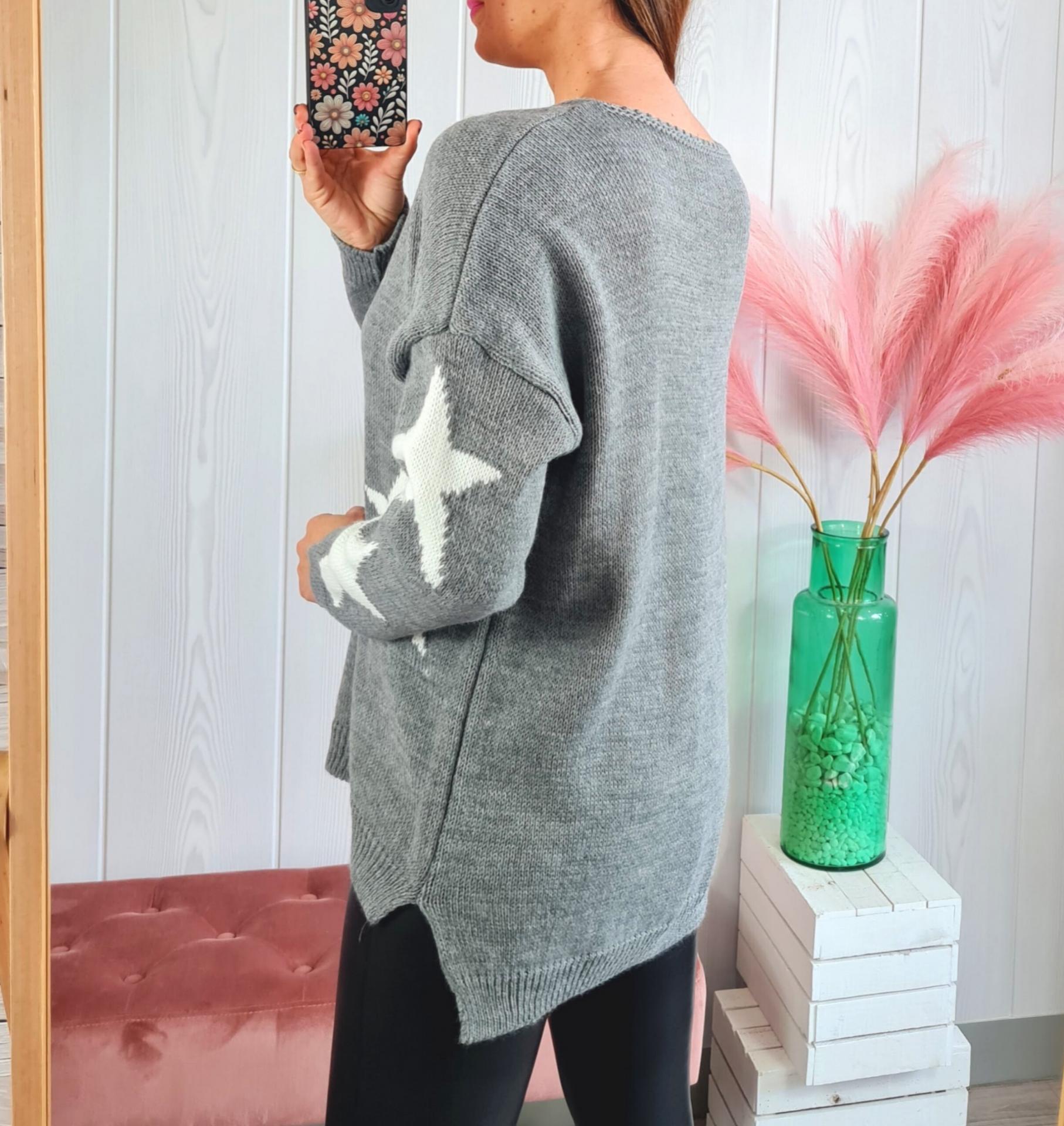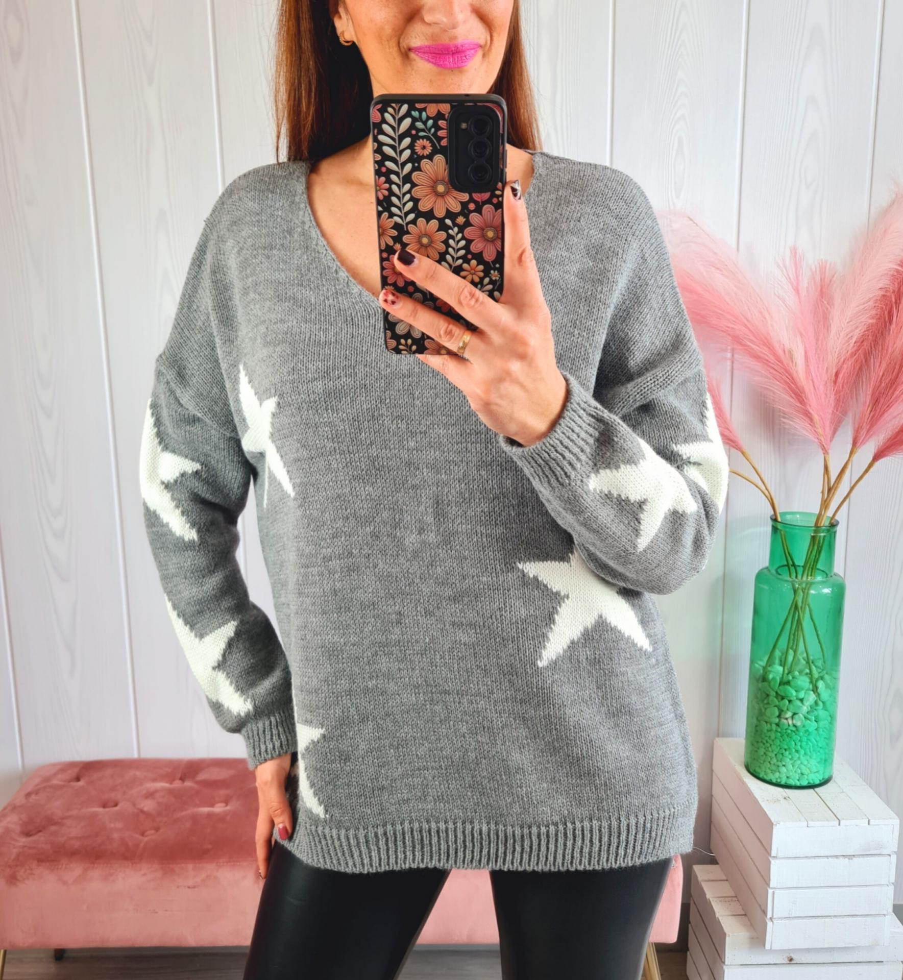 Jersey de color gris con estrellas en color blancas, cuello de pico y manga larga.