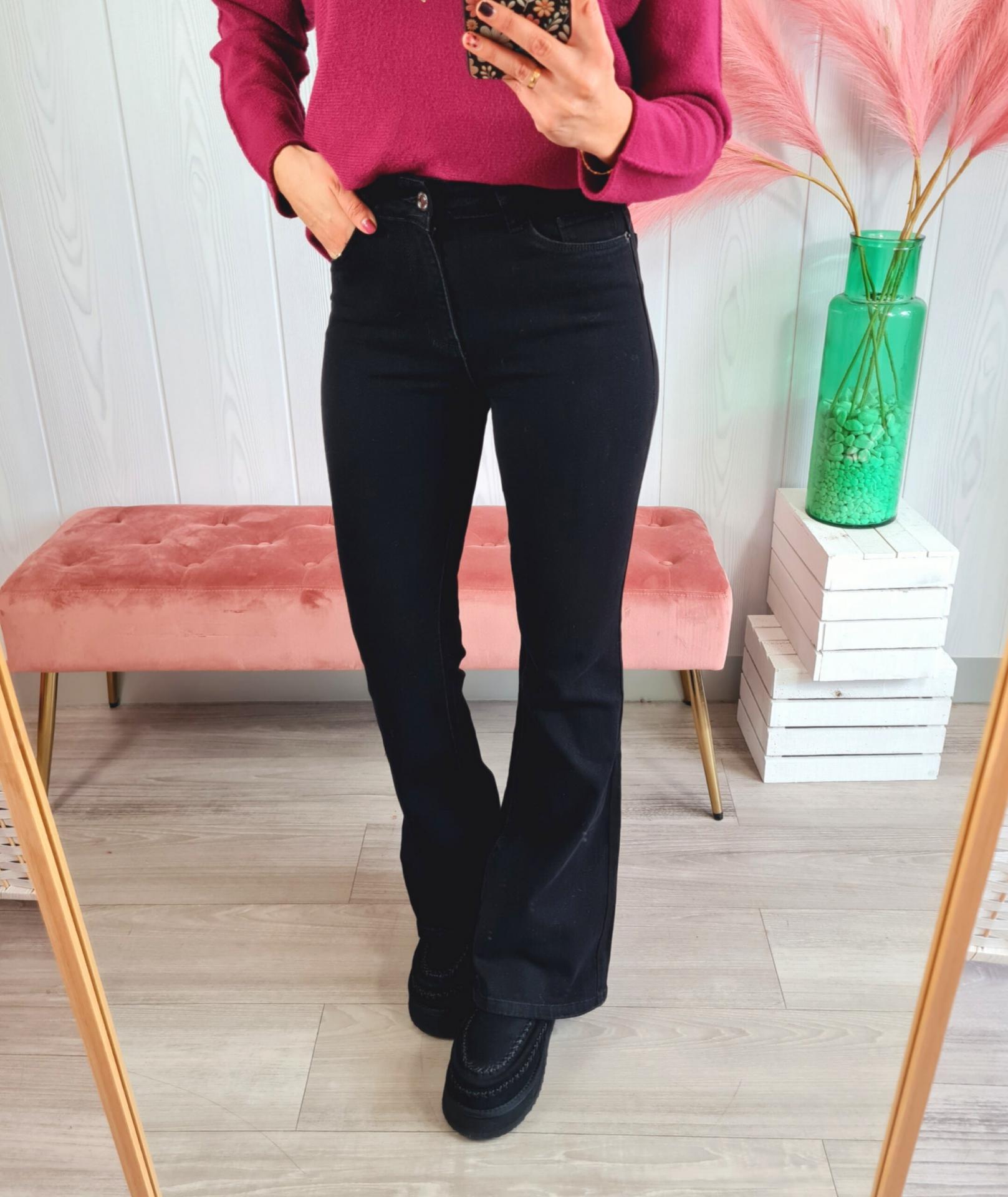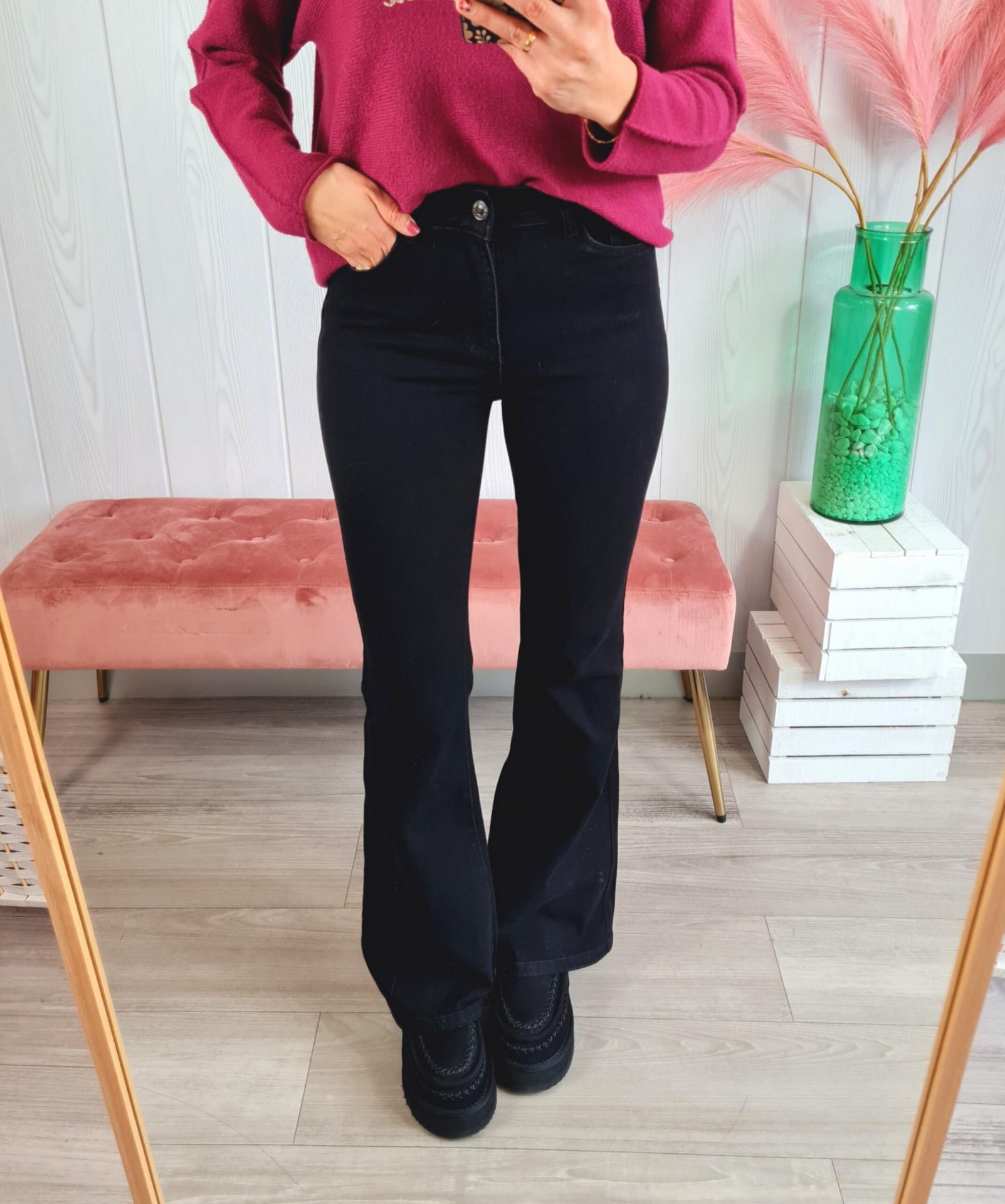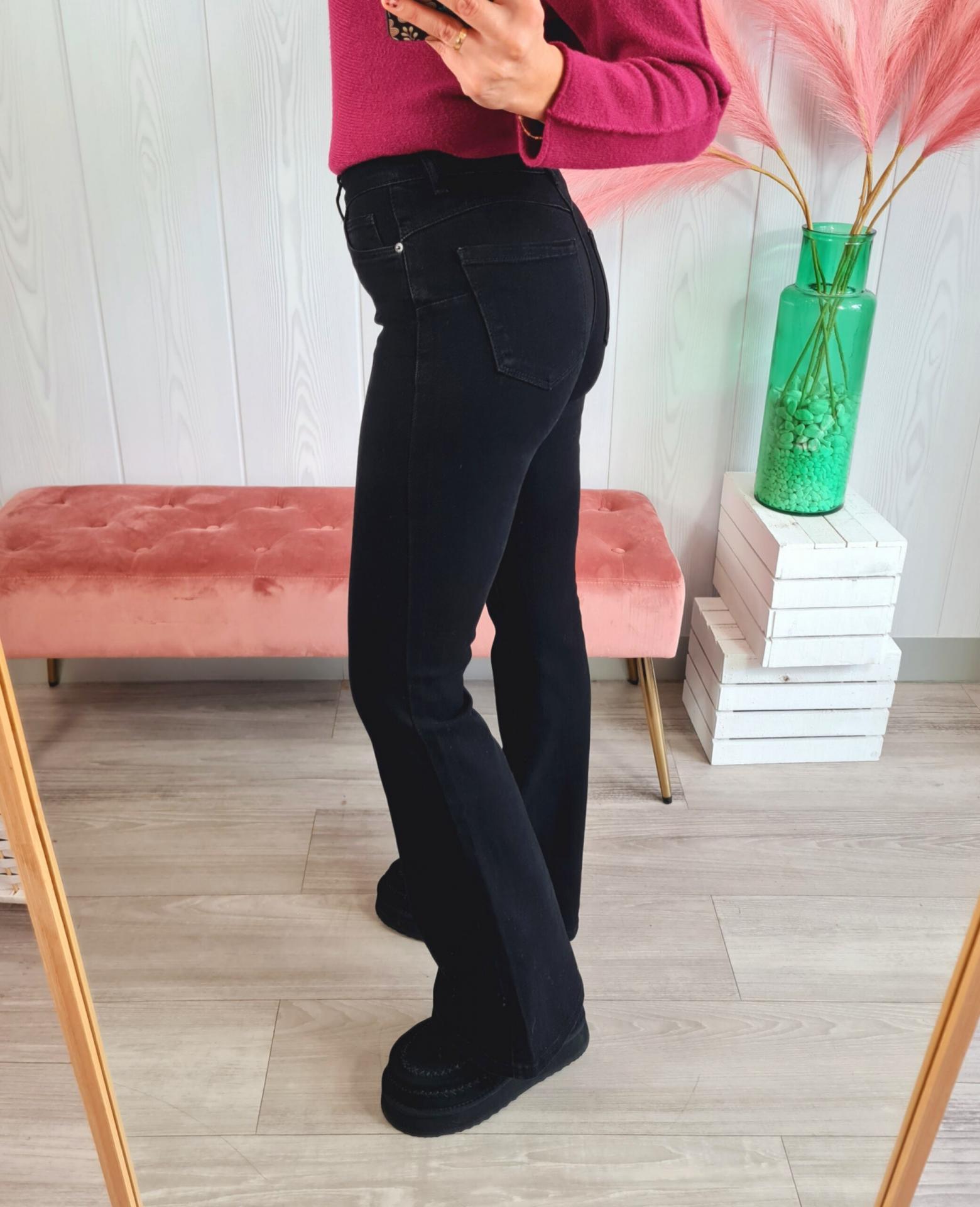 Pantalón vaquero de estilo flare en color negro. Tiene cierre con botón y cremallera y bolsillos laterales.