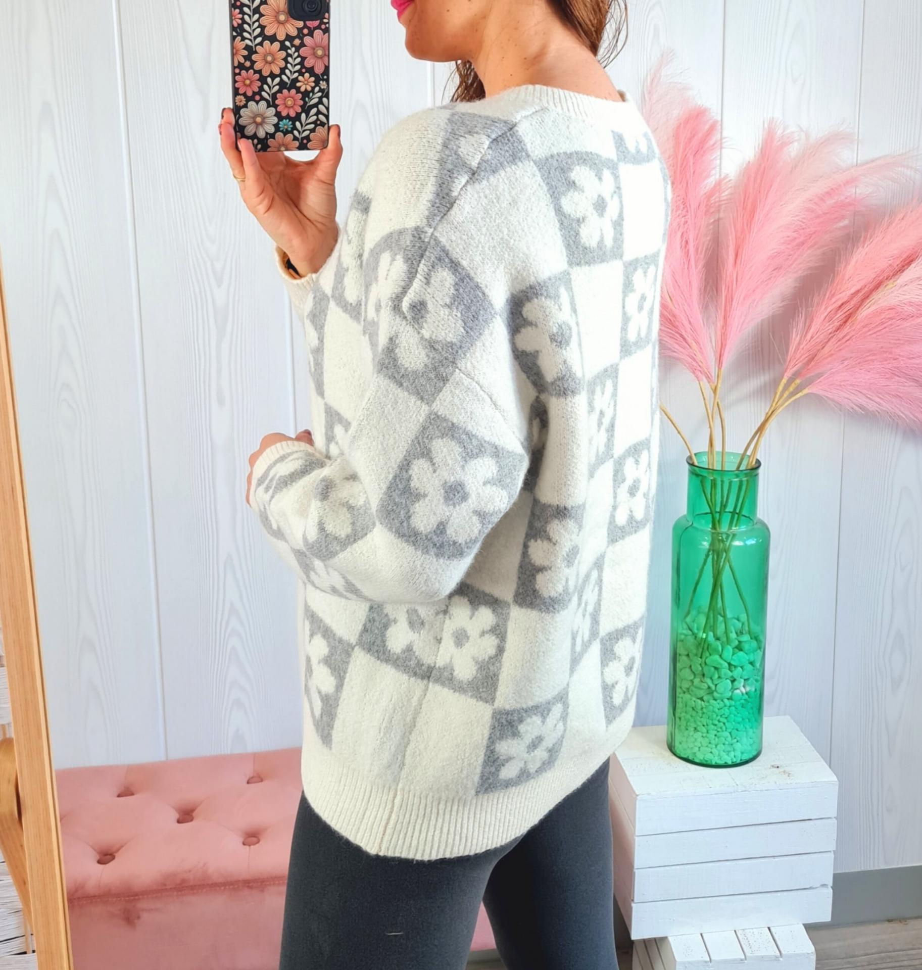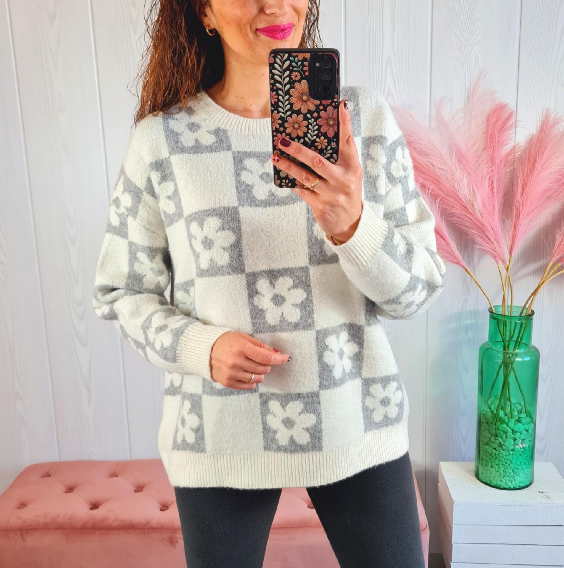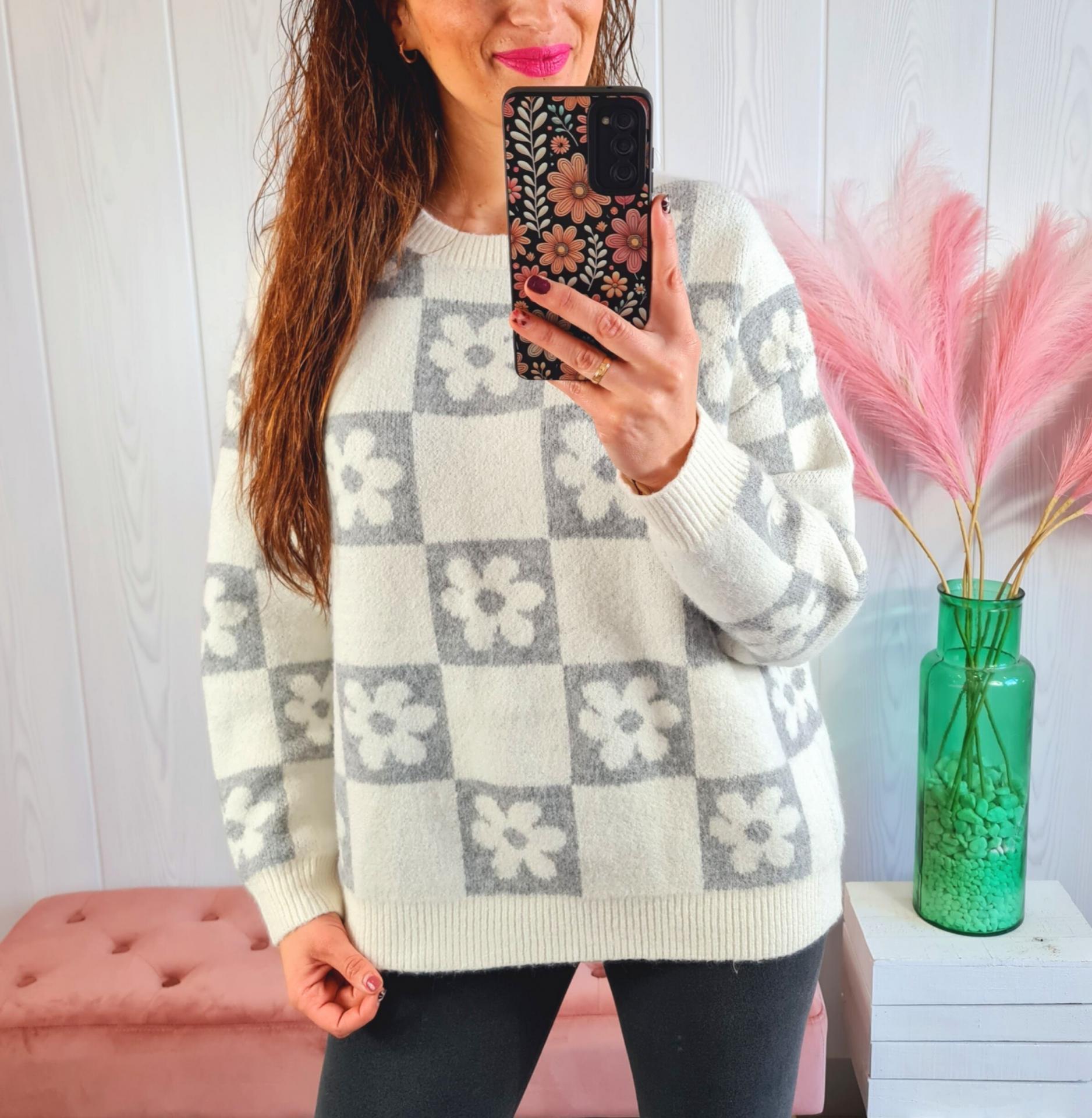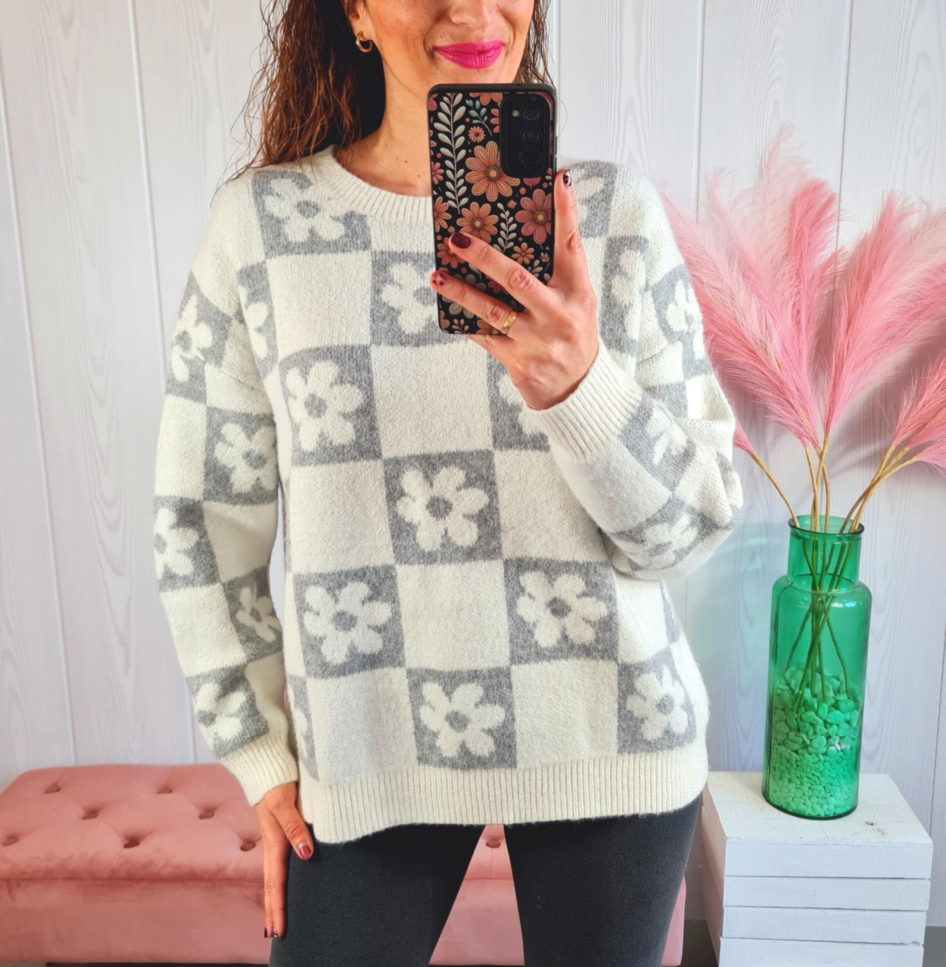 Jersey de color blanco estampado con cuadros y margaritas grises, tiene cuello redondo y manga larga.