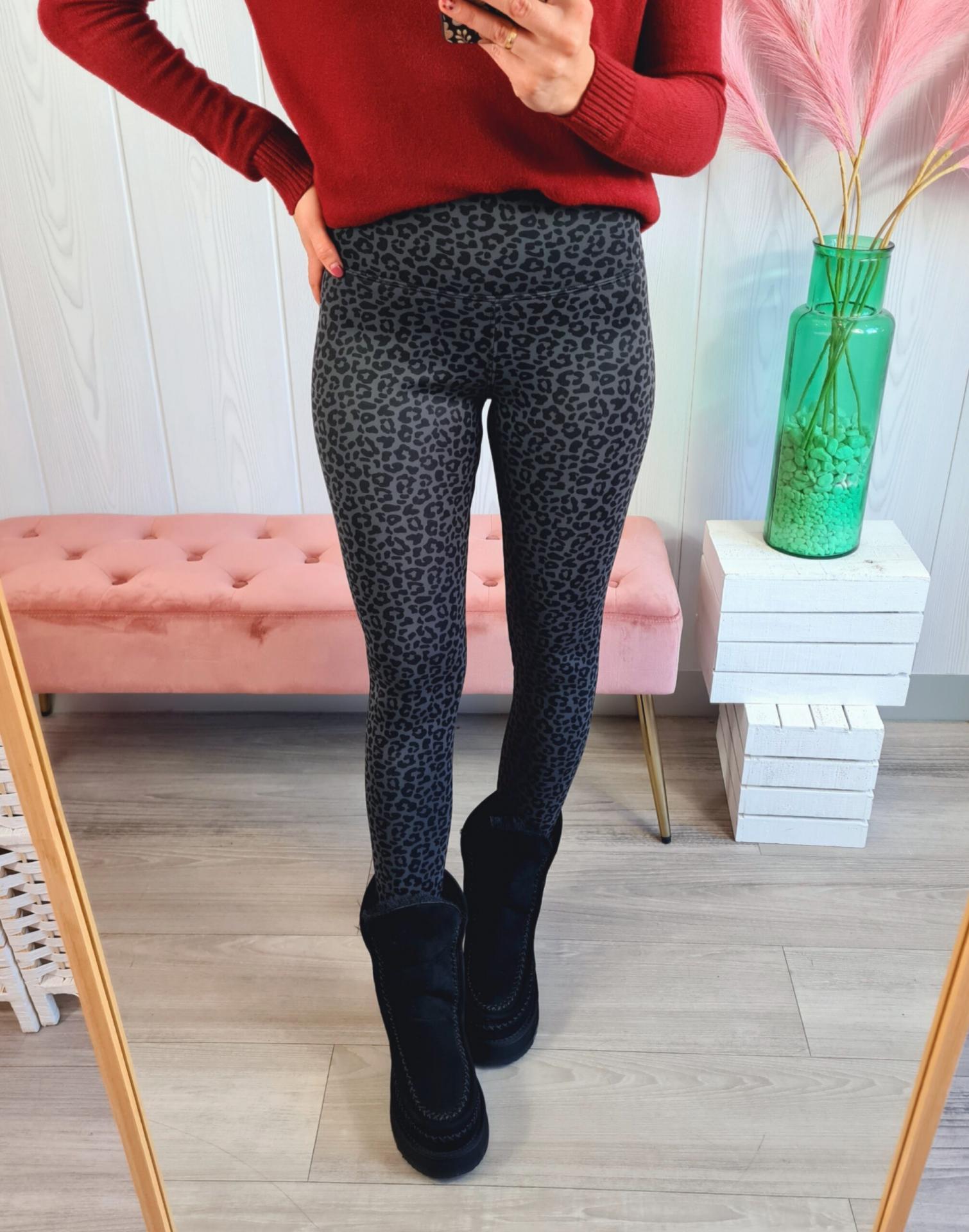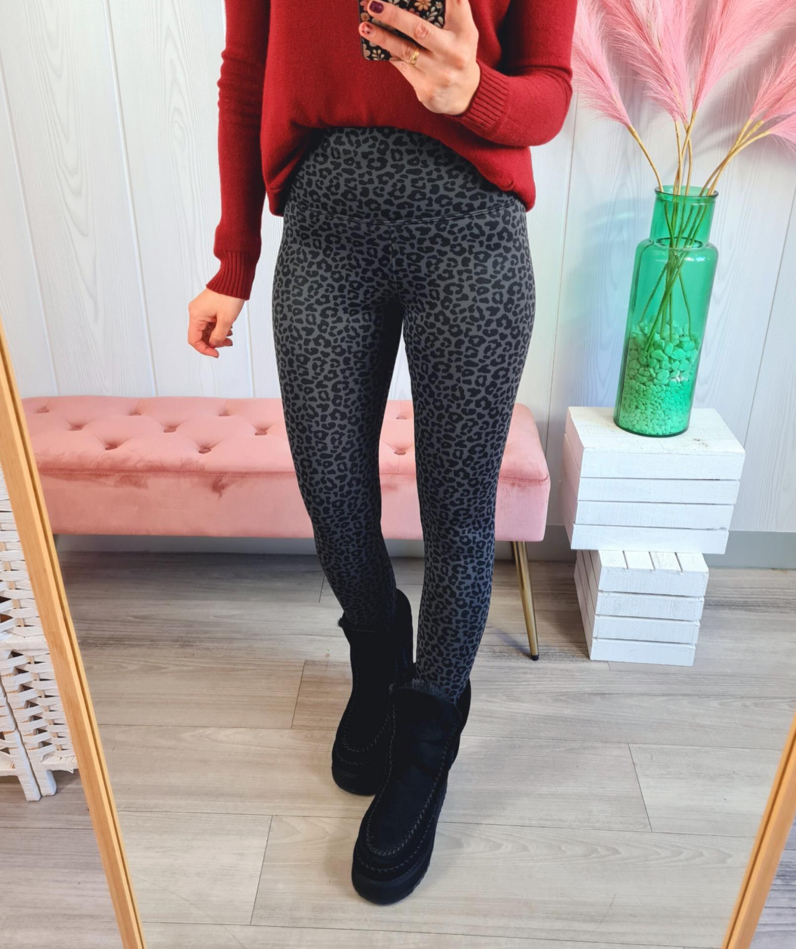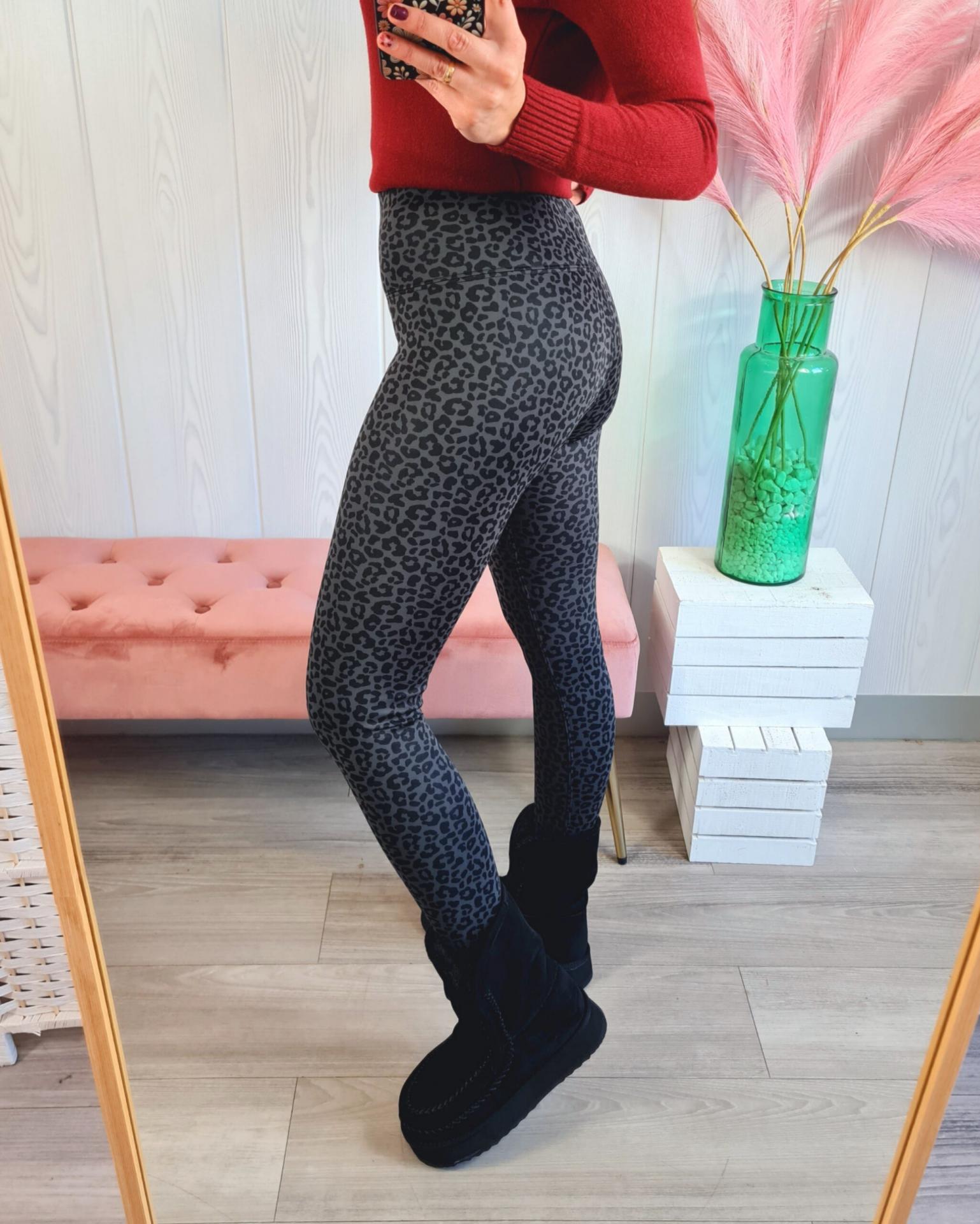 Leggins de color gris con estampado print. Tienen el interior forradito.