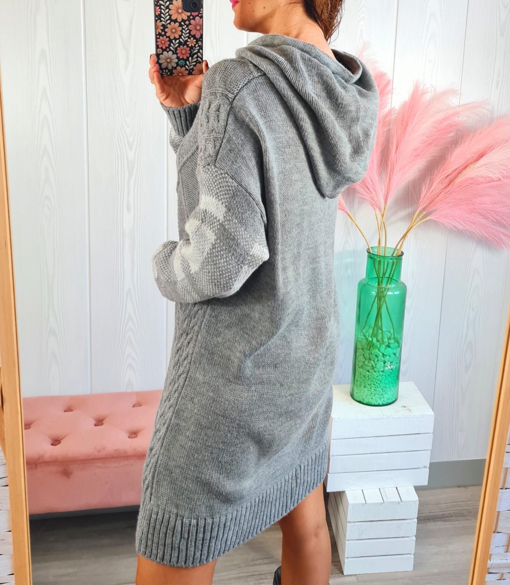 Vestido en color gris, con punto trenzado en la parte delantera. Tiene capucha y manga larga con estampado de cuadros.