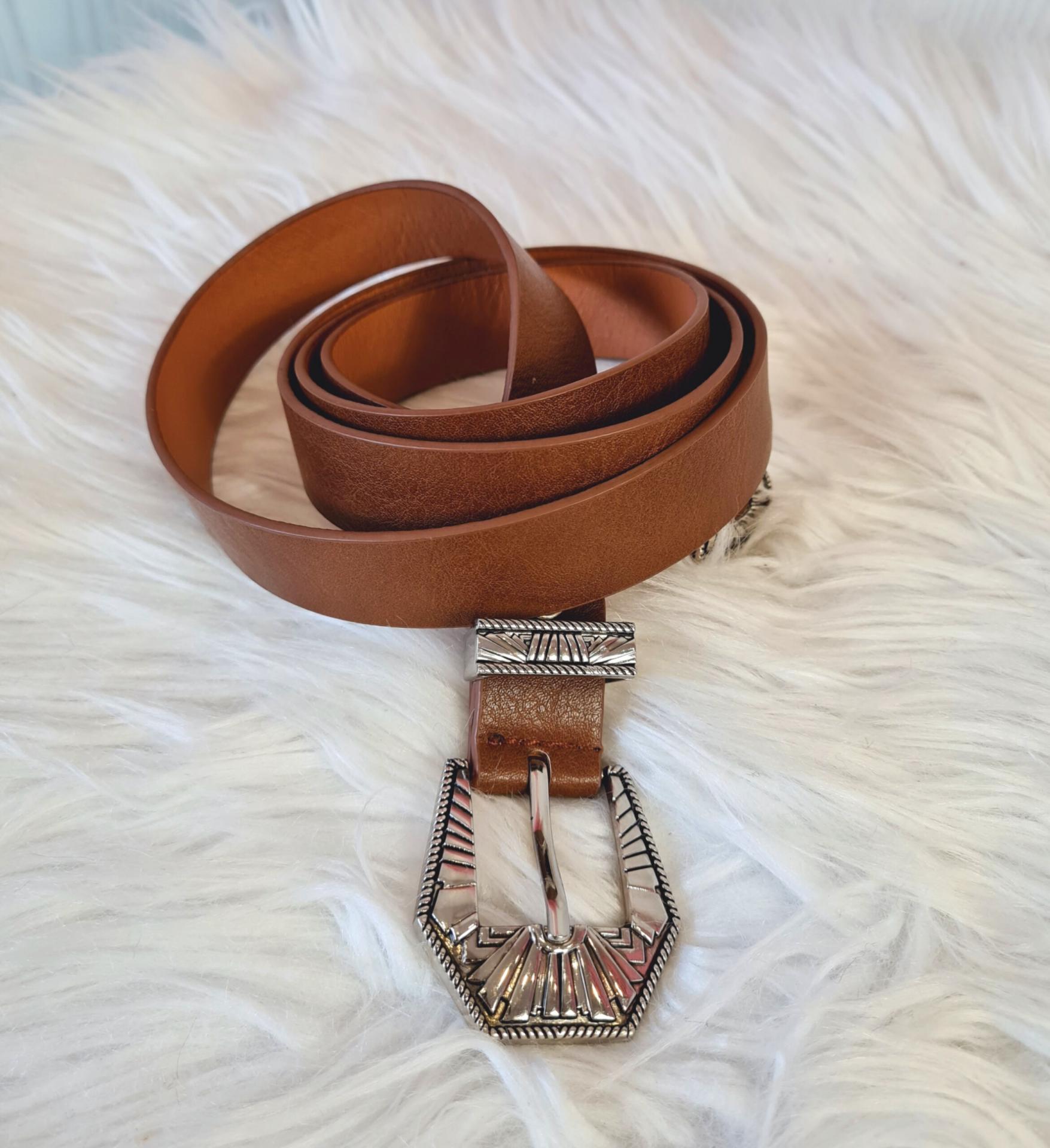 Cinturón de cuero marrón con apliques en color plateado.