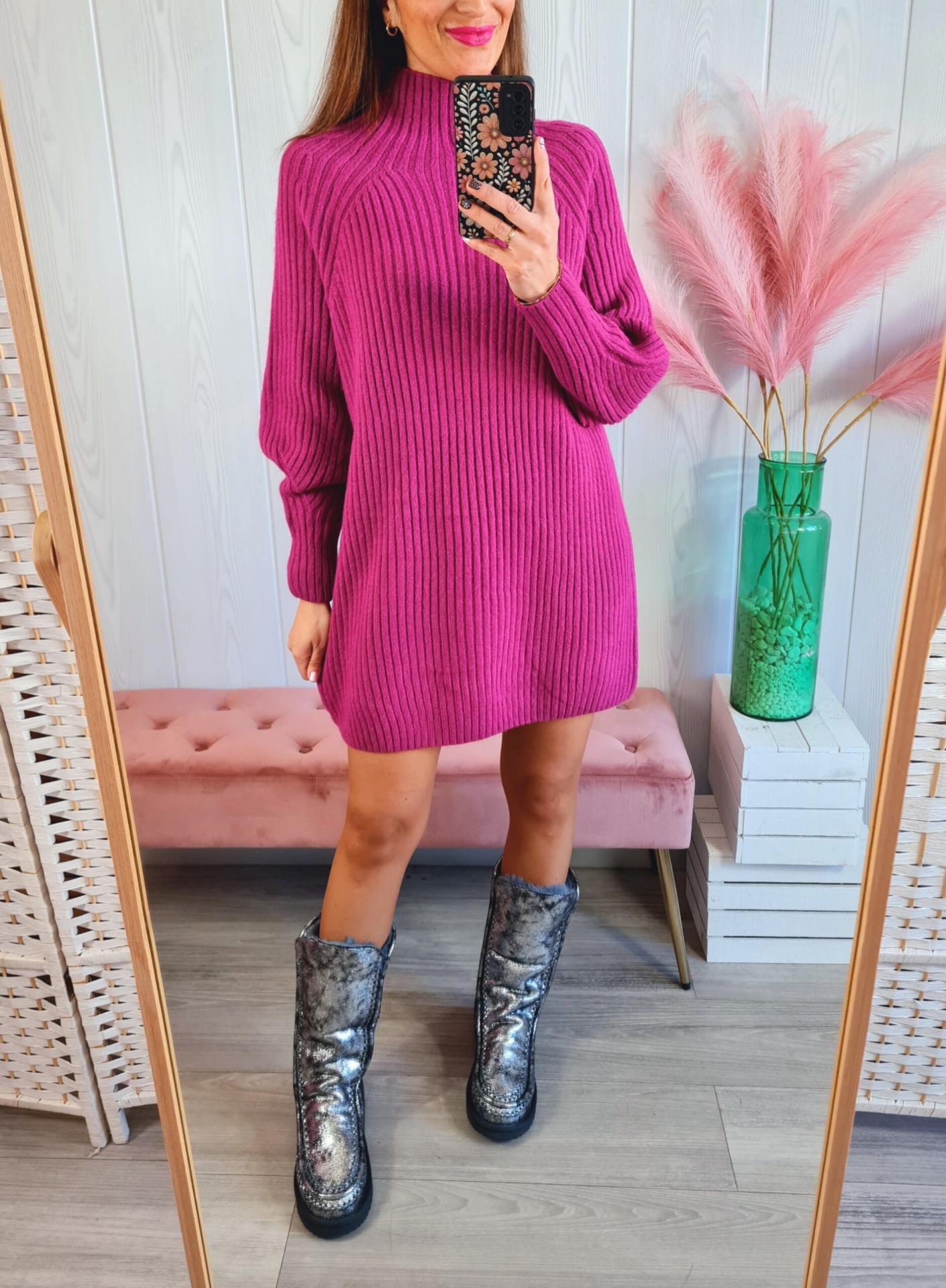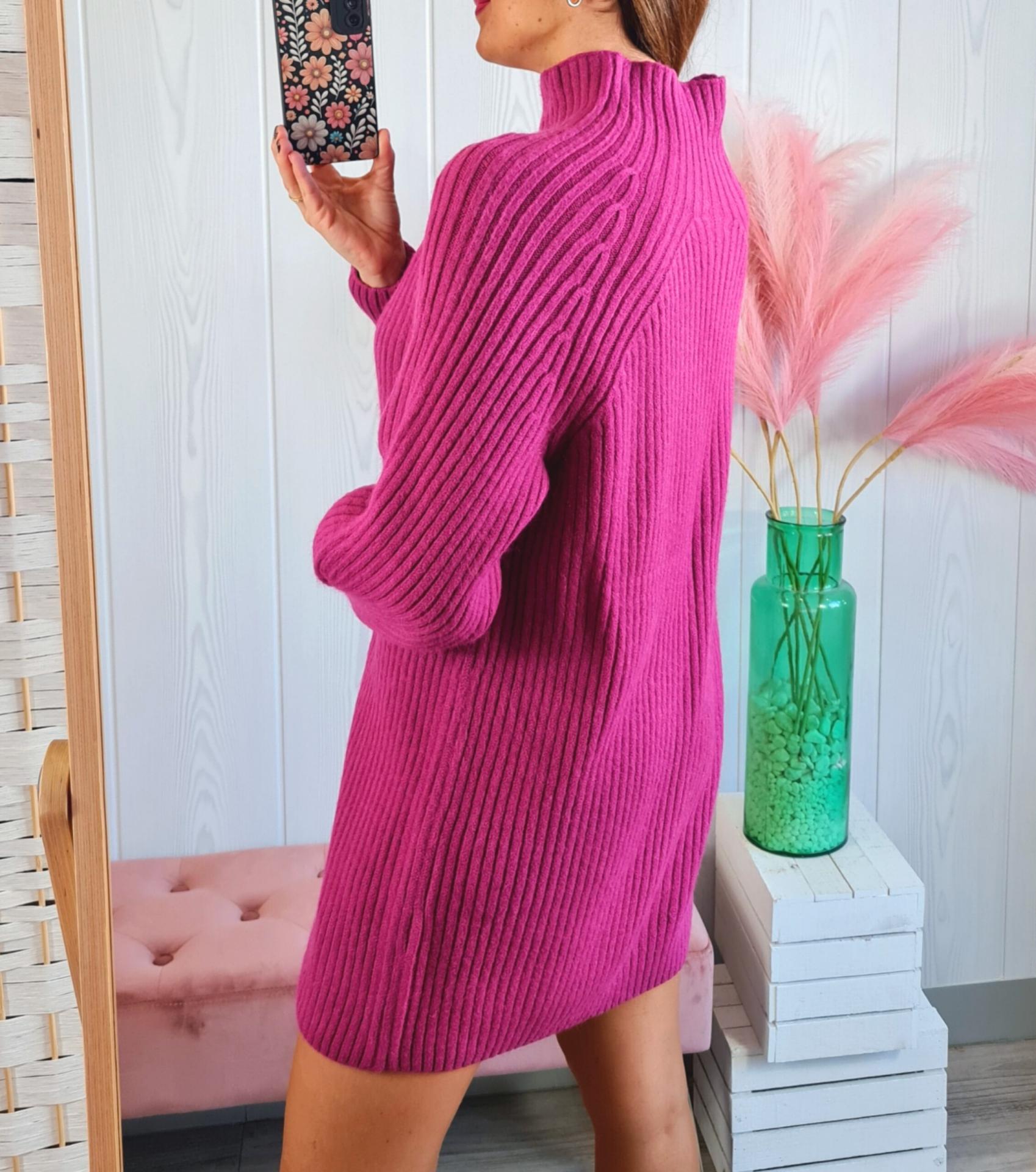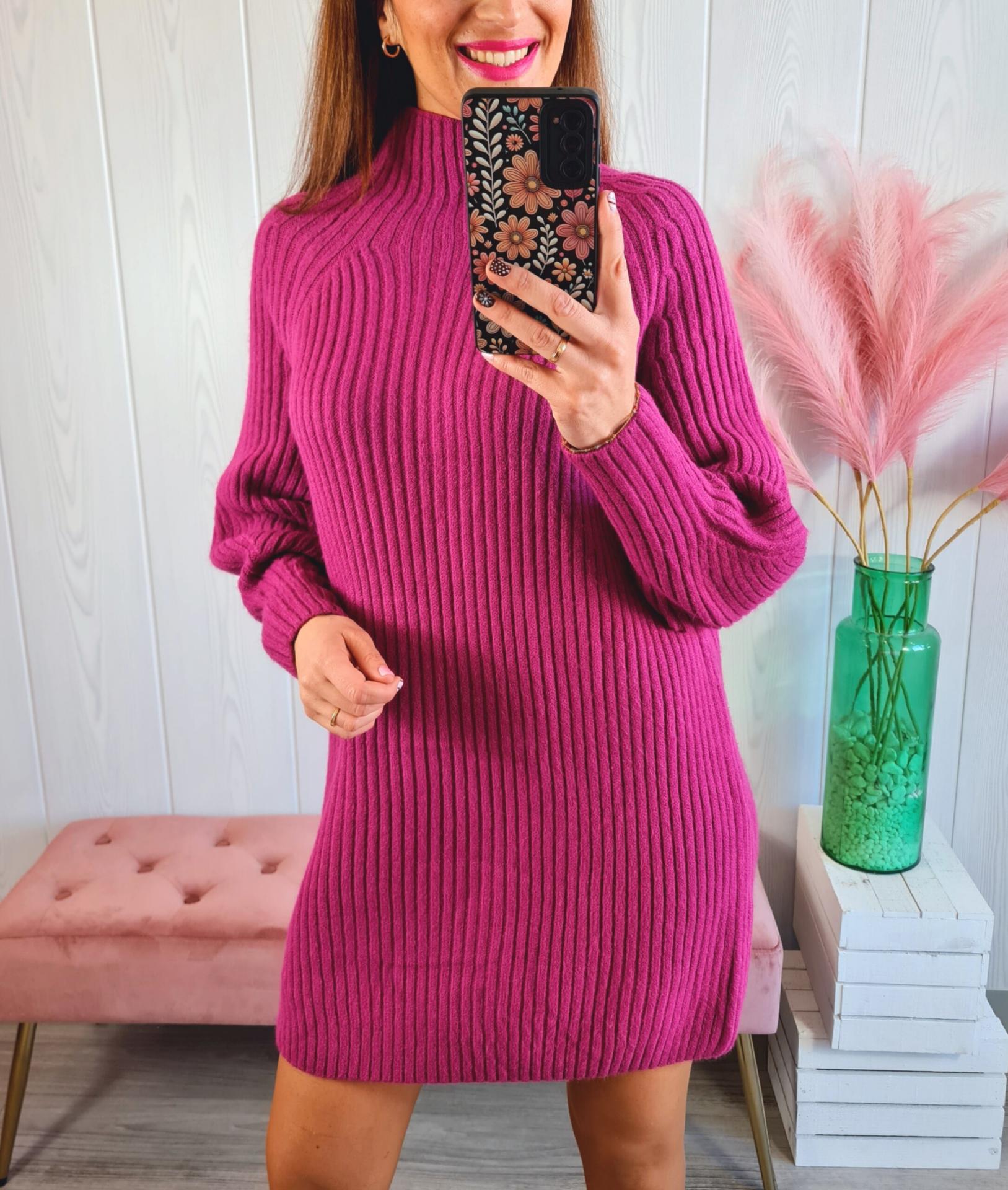 Vestido de punto en color buganvilla. Tiene cuello subido y manga larga.