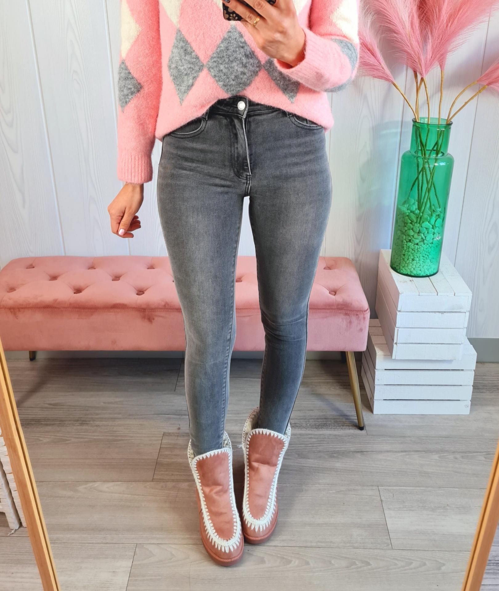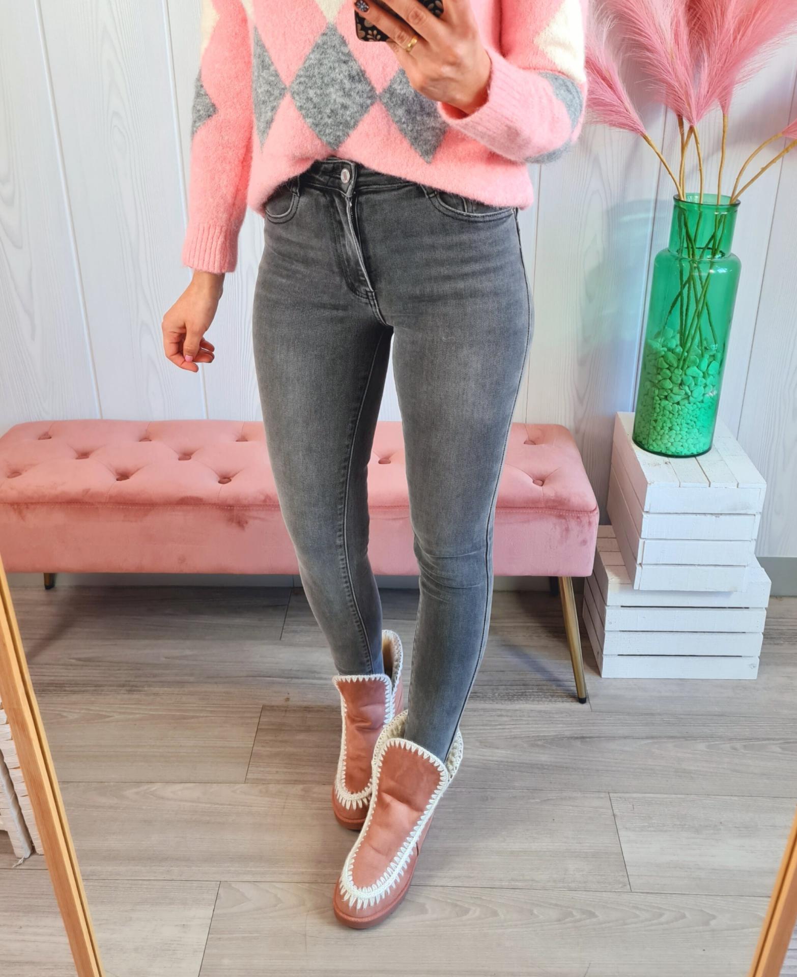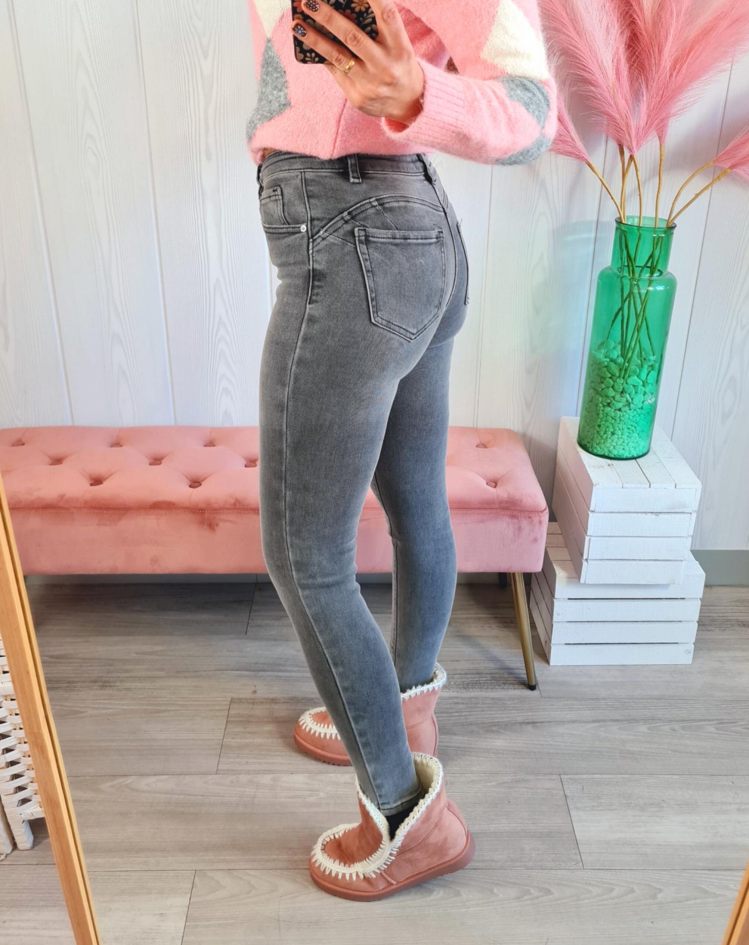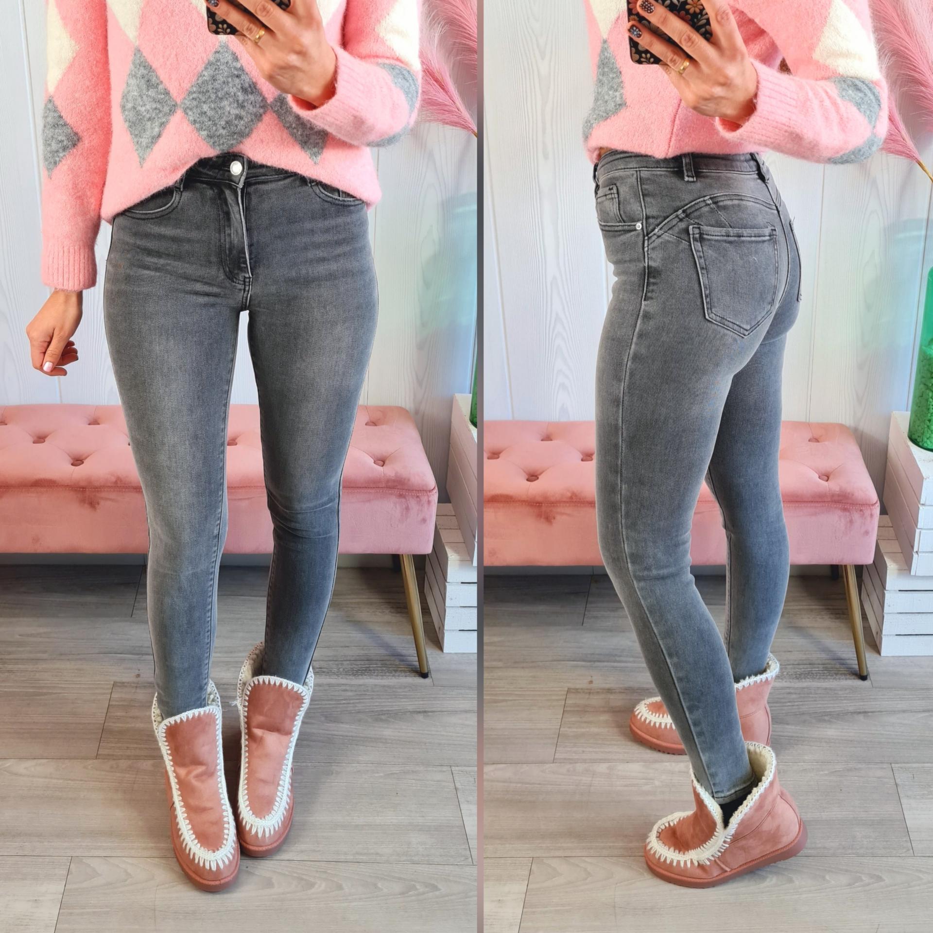 Pantalón pitillo en color gris oscuro. Tiene cierre con botón y cremallera y efecto push-up.