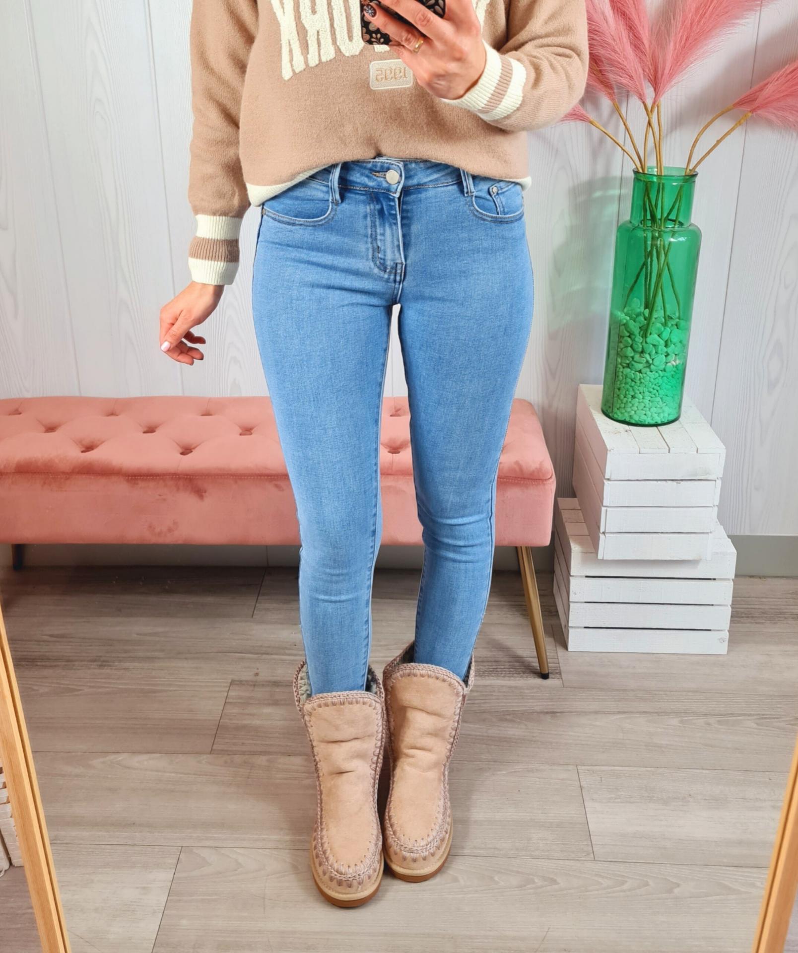 Pantalón vaquero pitillo en color medio. Tiene cierre con botón y cremallera y efecto push-up.