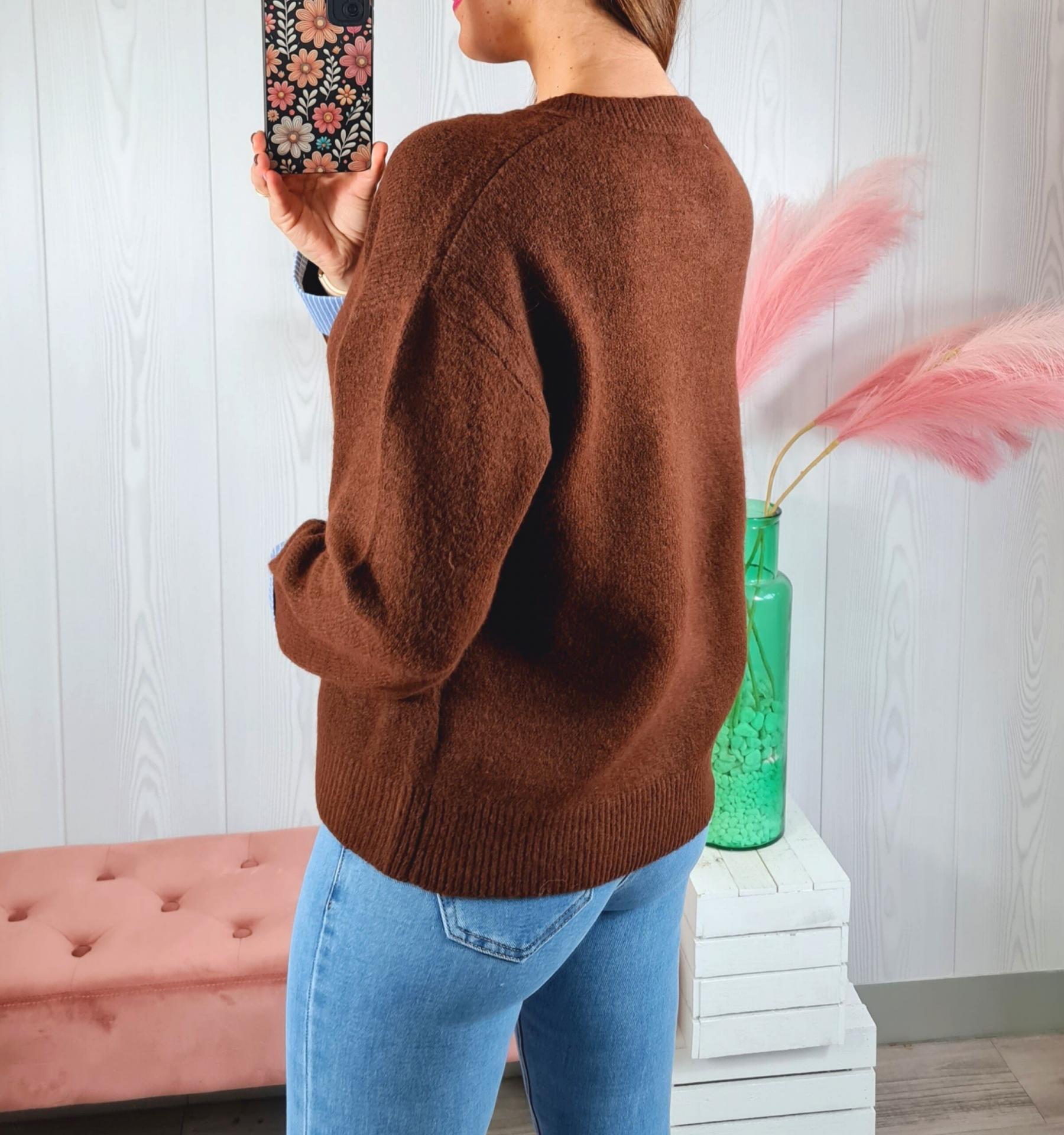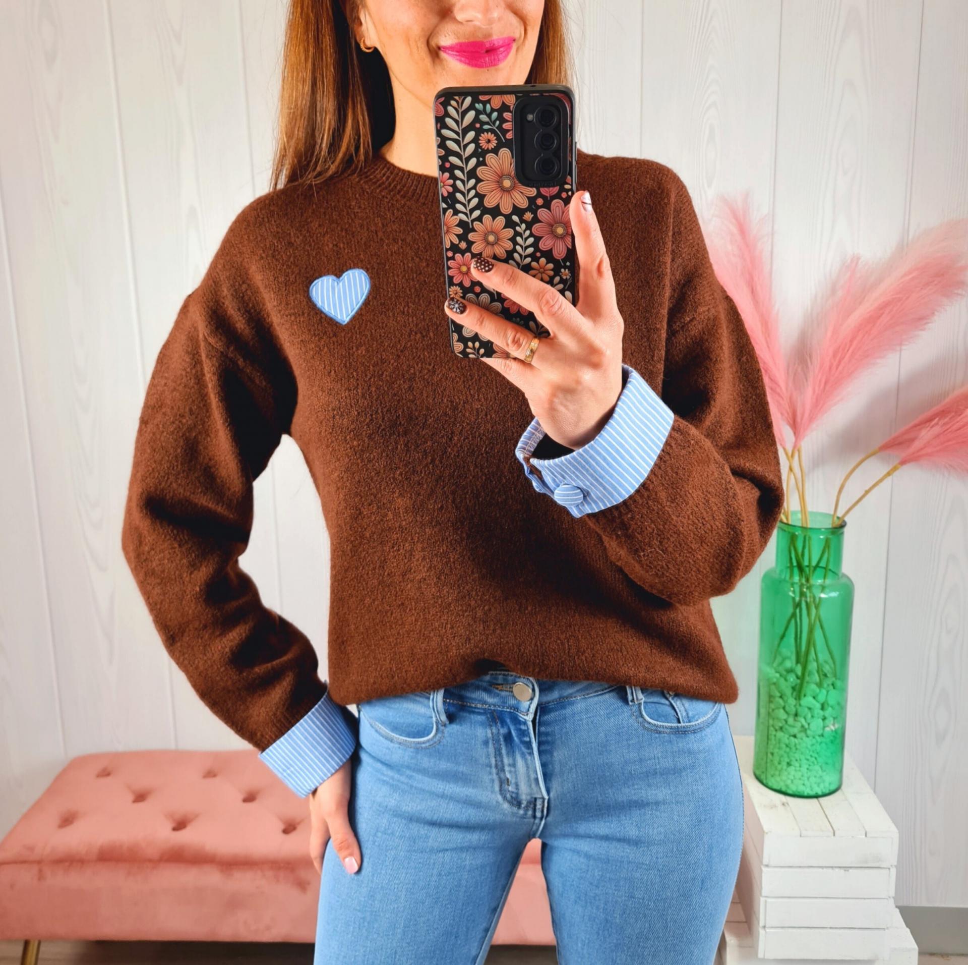 Jersey de color marrón chocolate con corazón azul de adorno en el pecho, manga larga con puños de camisa y cuello redondo.
