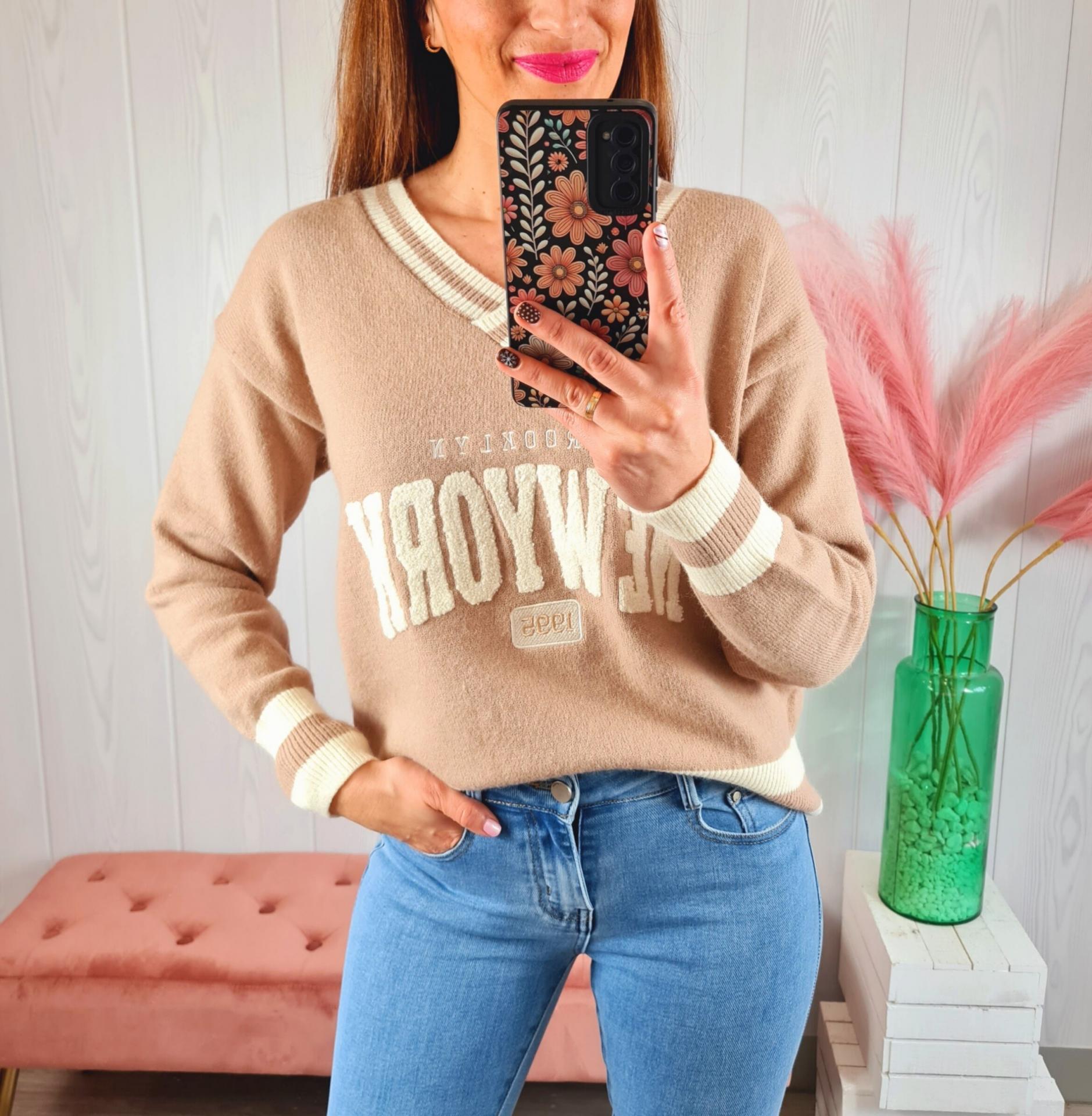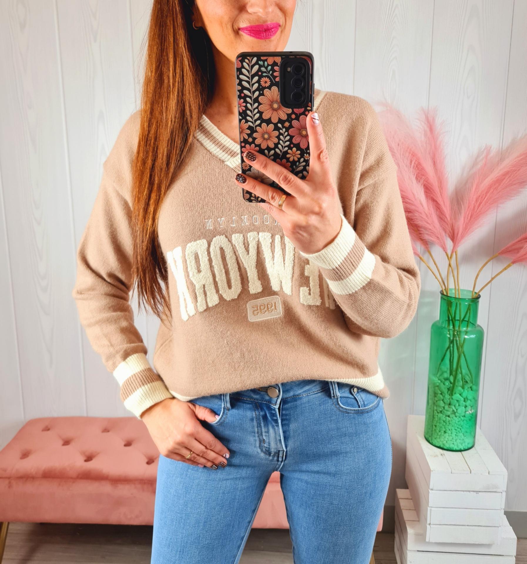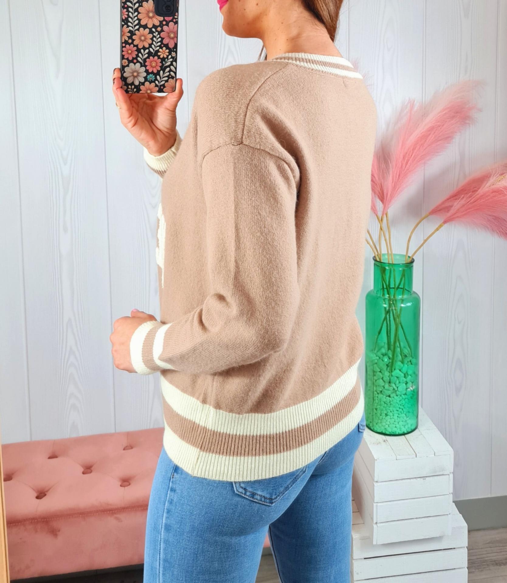 Jersey de color beige con estampado en el pecho en color blanco, cuello de pico y manga larga.