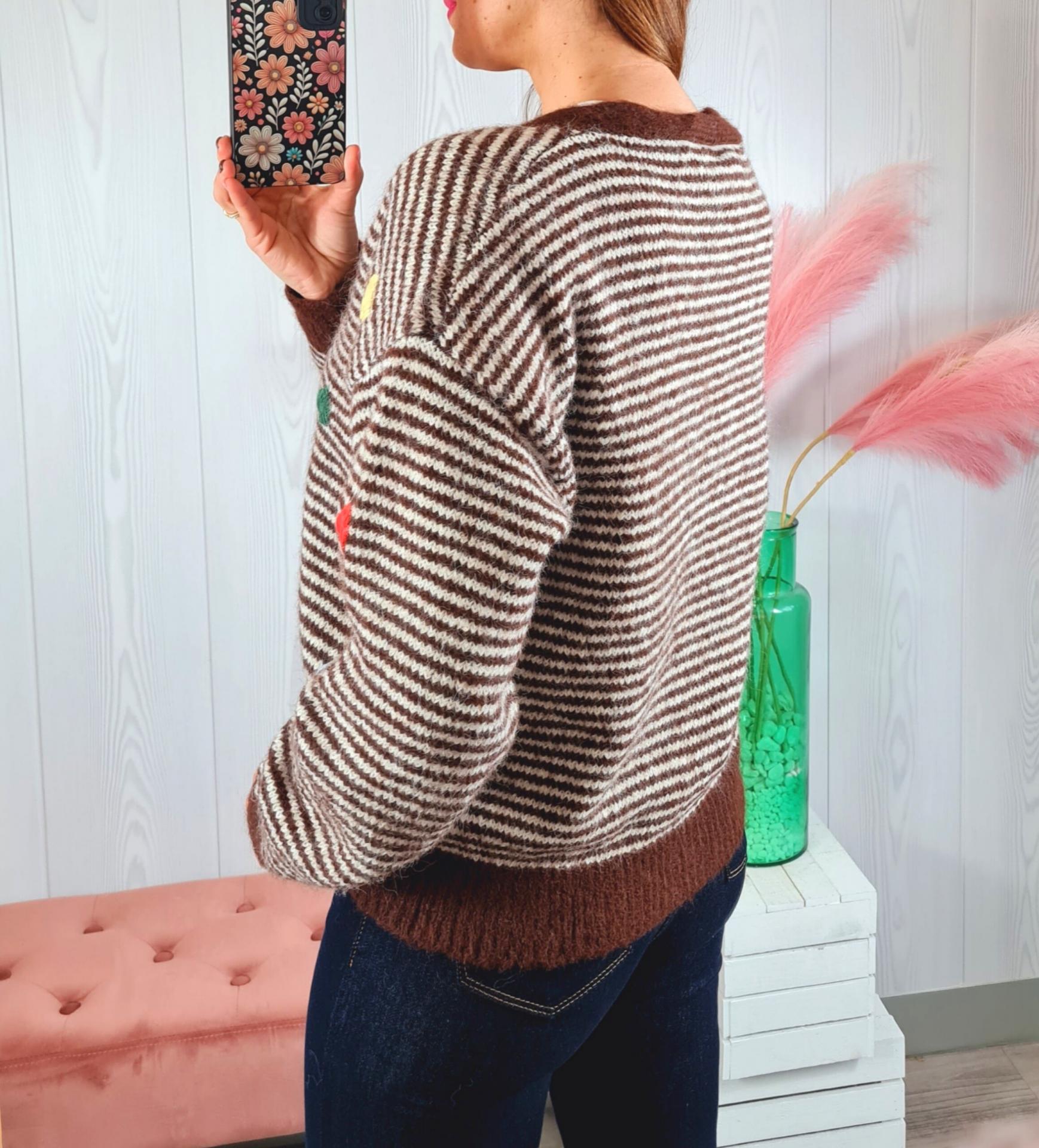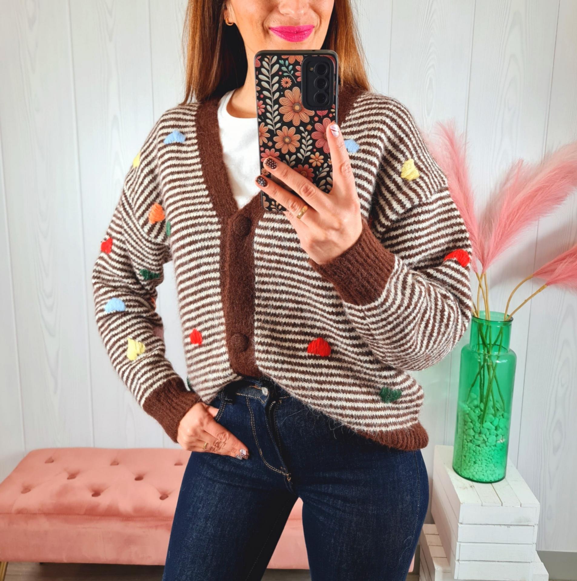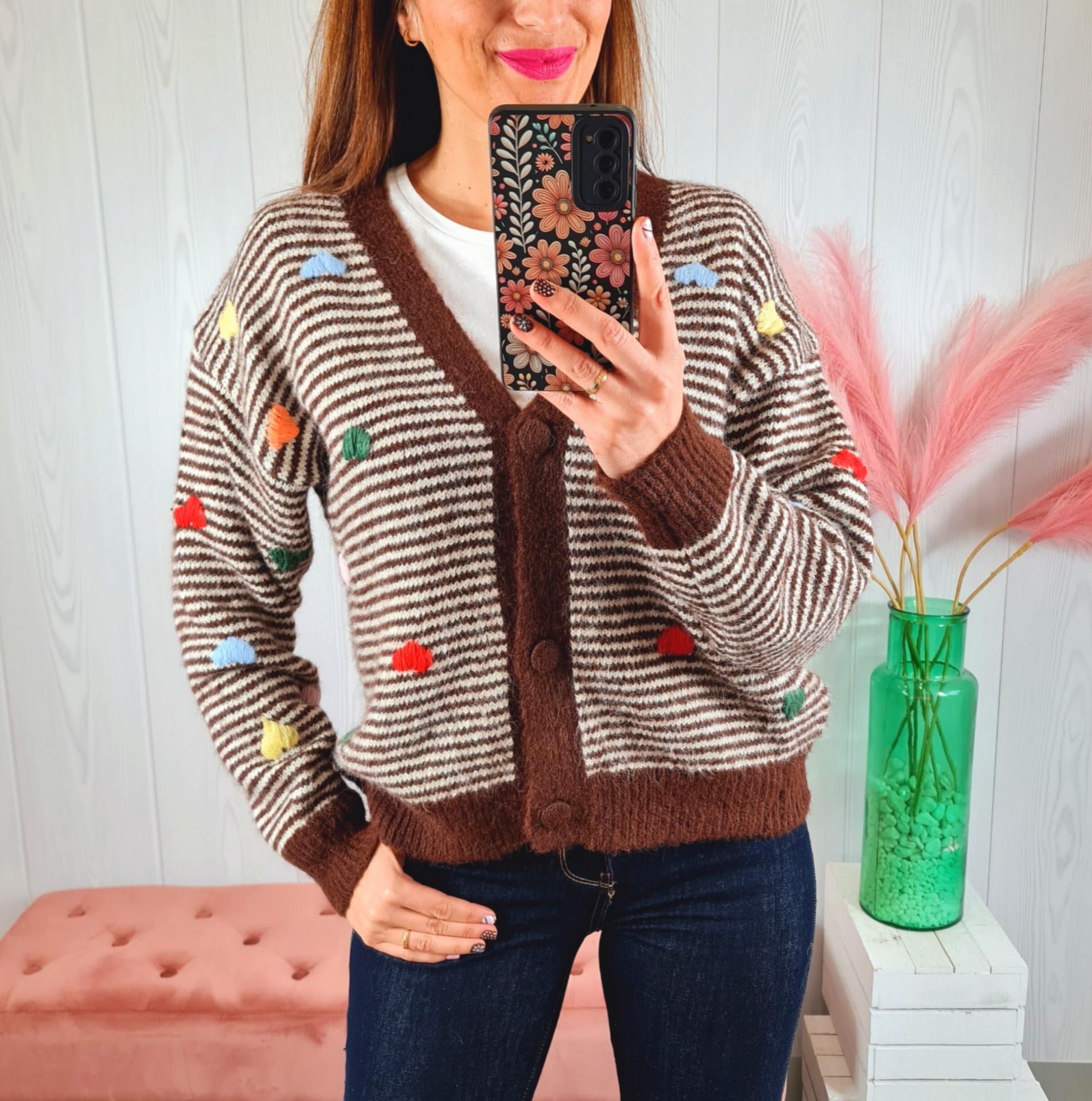 Rebeca de punto a rayas marrones y beige con corazones de colores de adorno. Tiene cuello de pico, manga larga y abotonadura delantera.