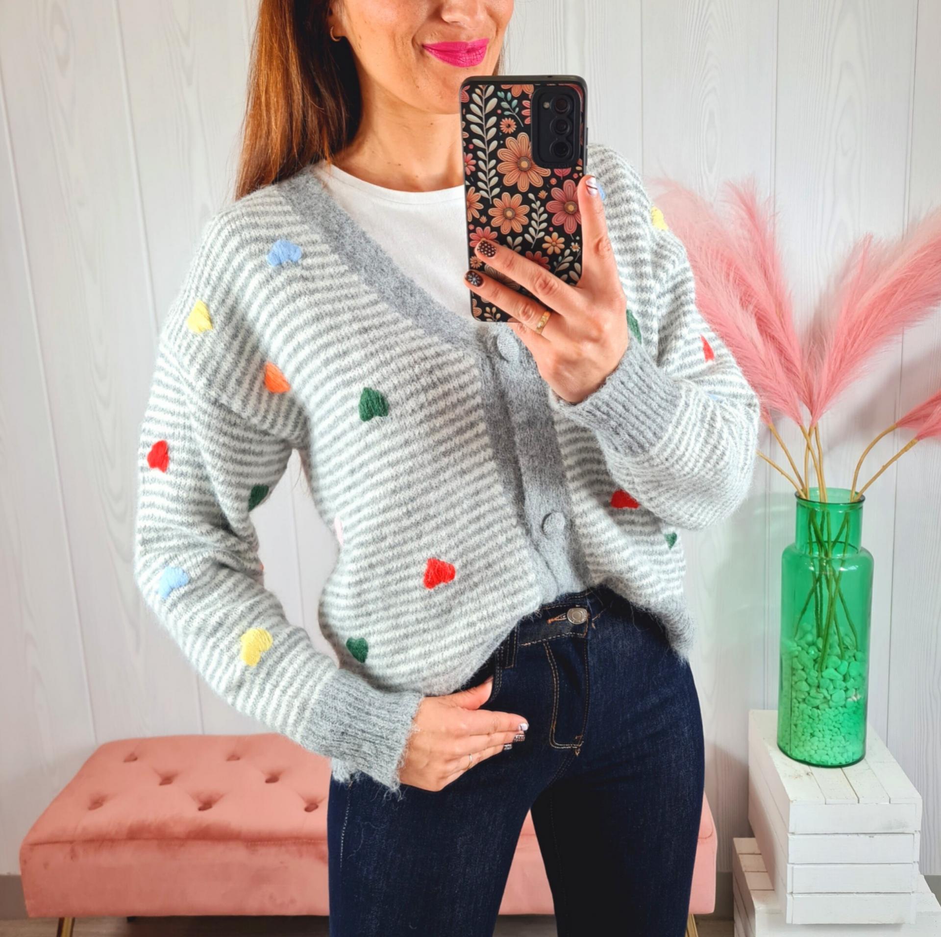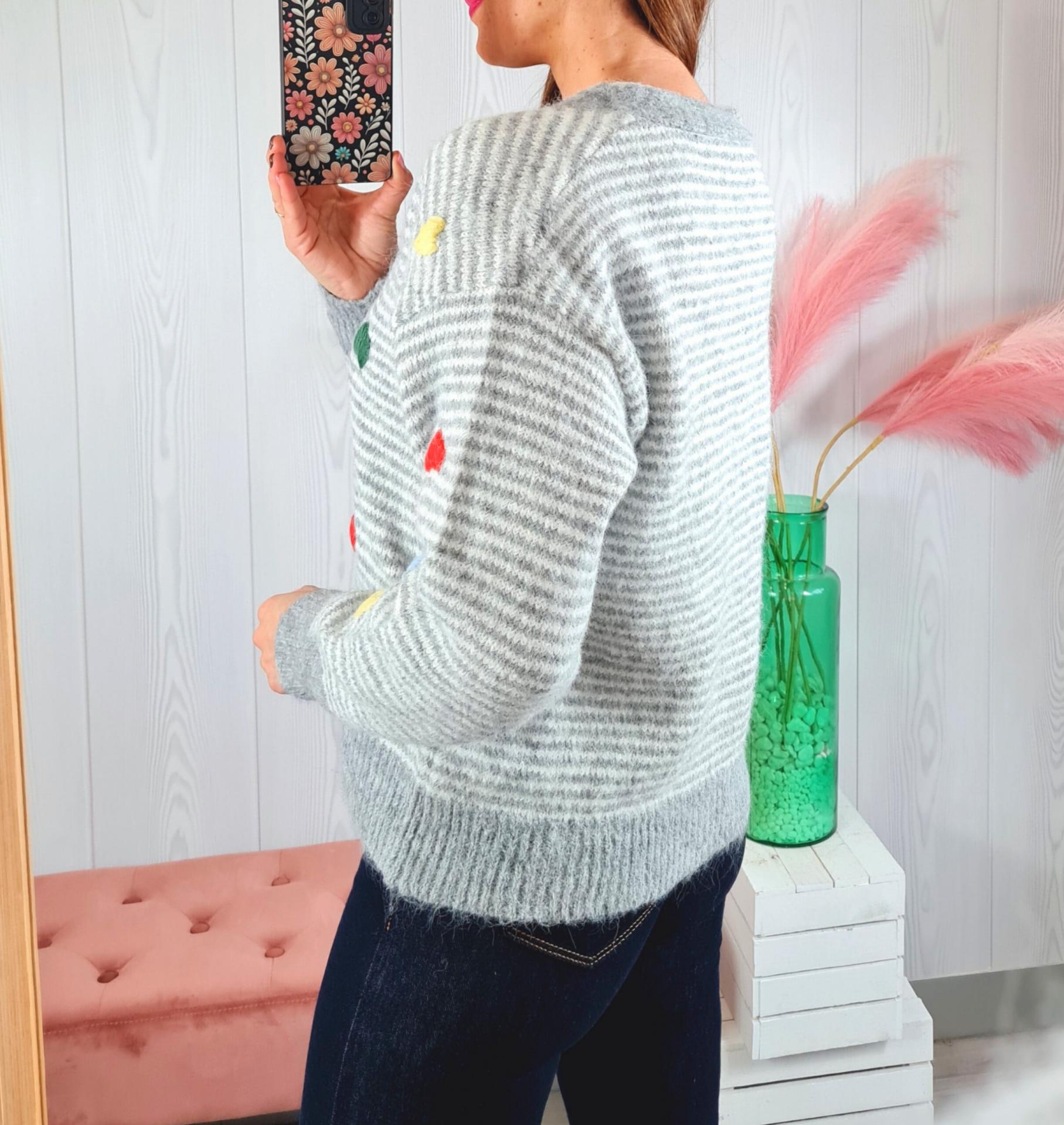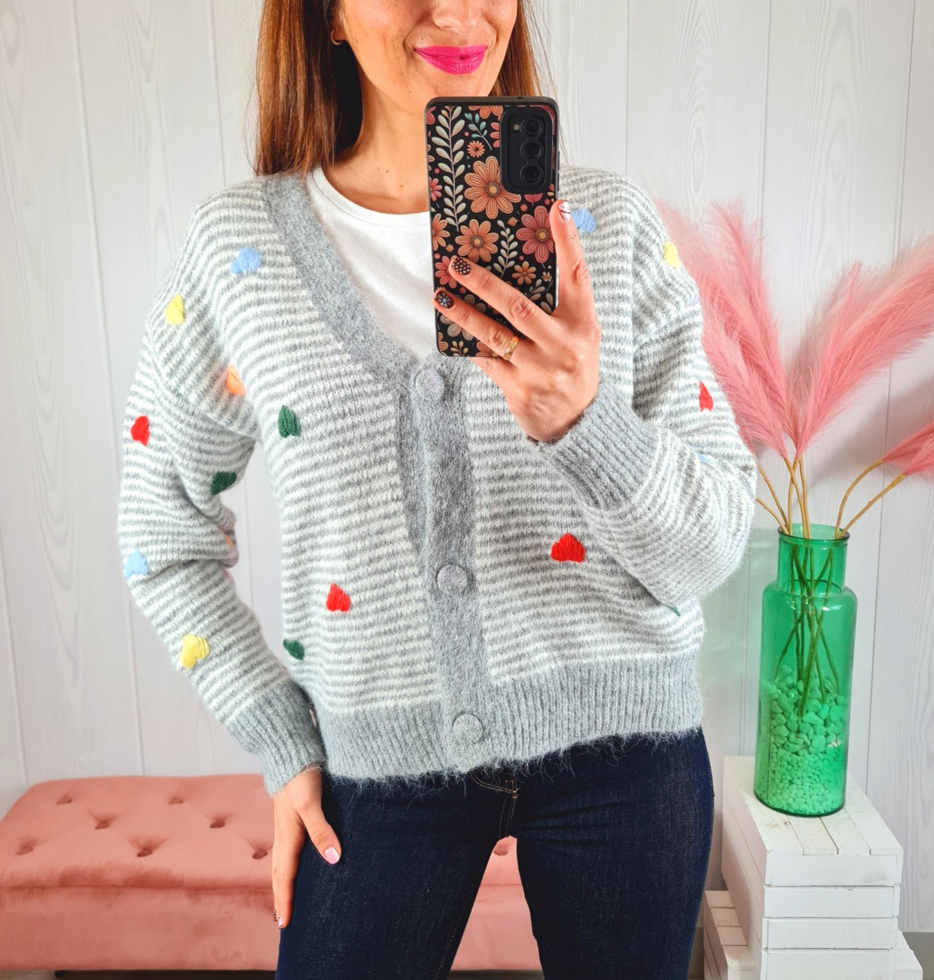 Rebeca de punto a rayas grises y blancas con corazones de colores de adorno. Tiene cuello de pico, manga larga y abotonadura delantera.