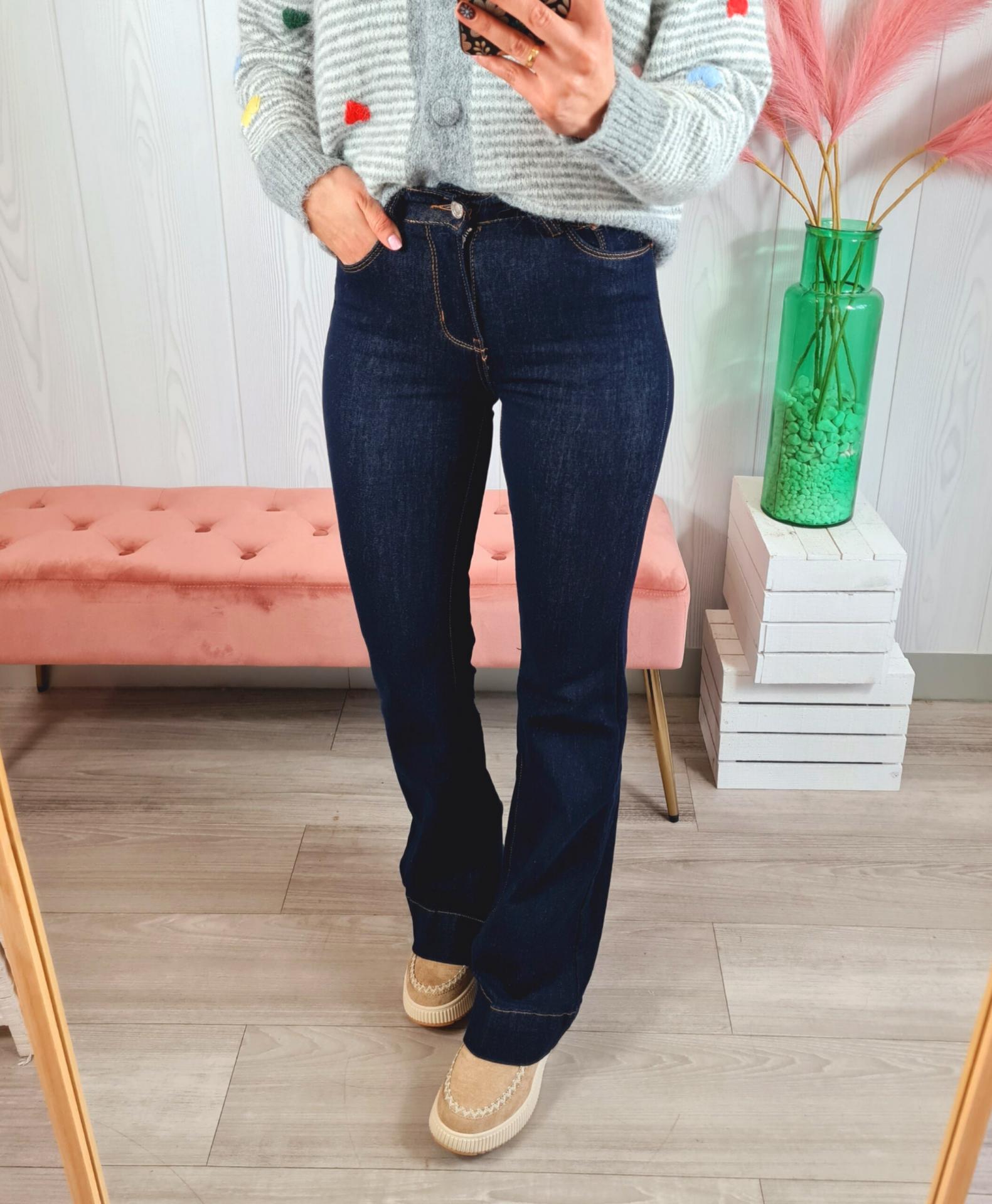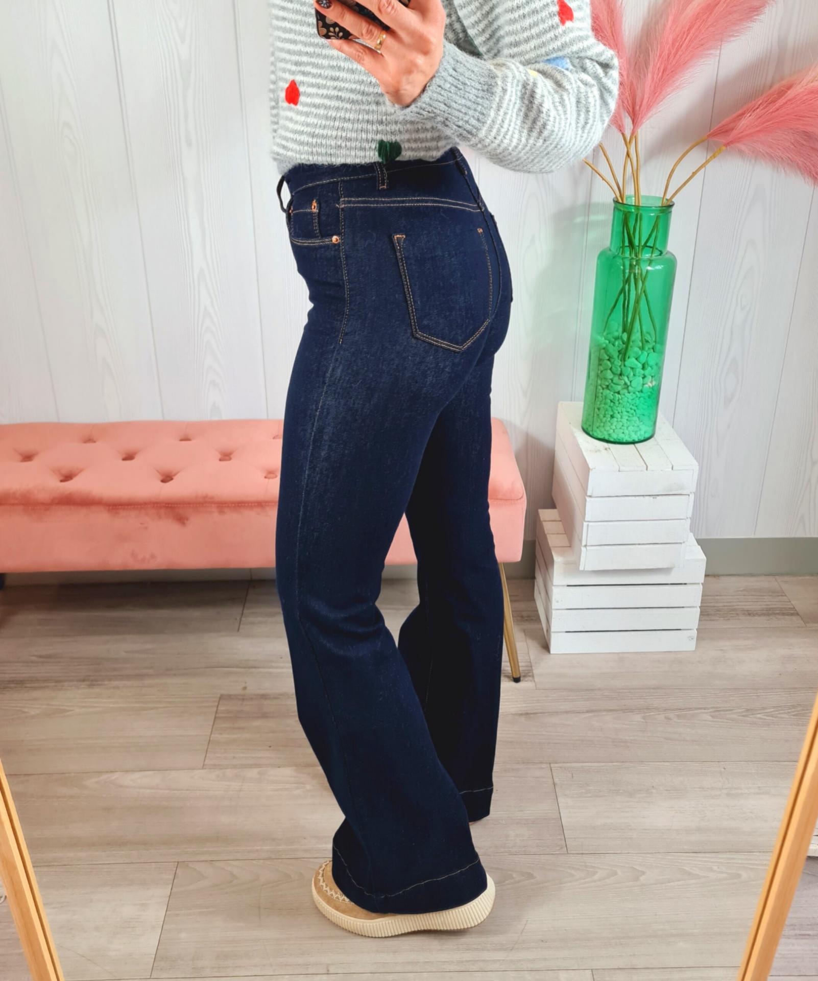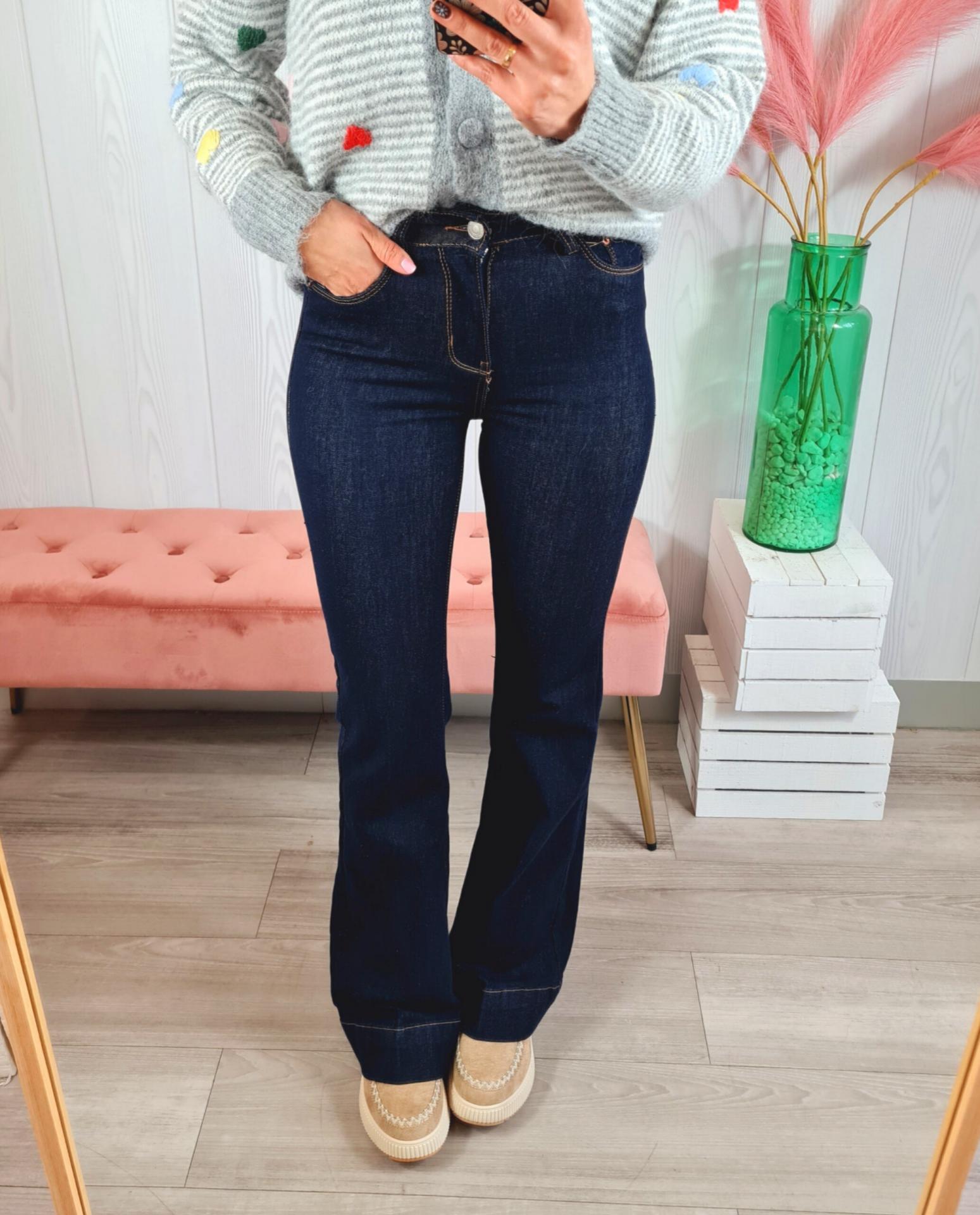 Pantalón vaquero oscuro con bajo acampanado. Tiene cierre con botón y cremallera.