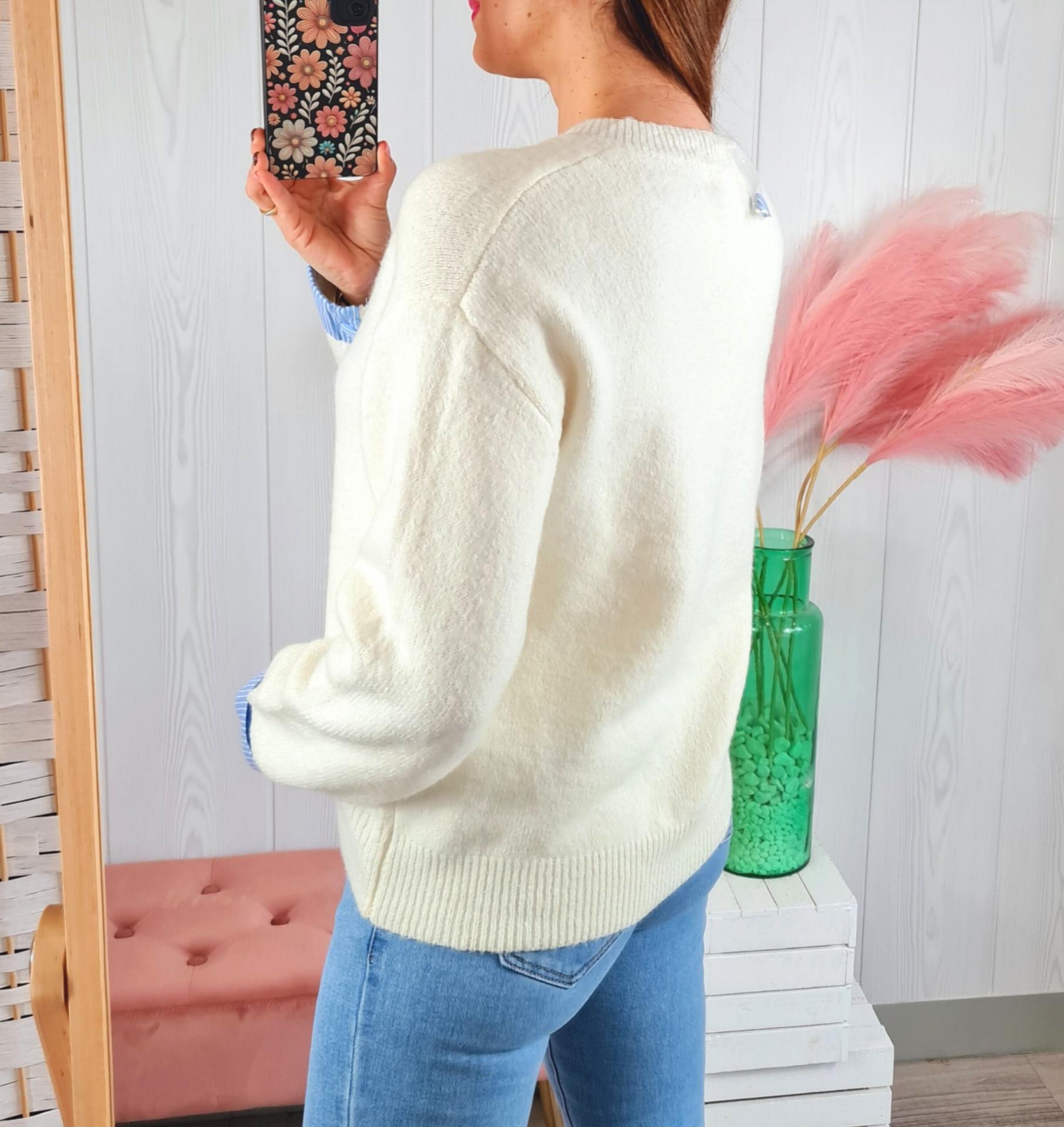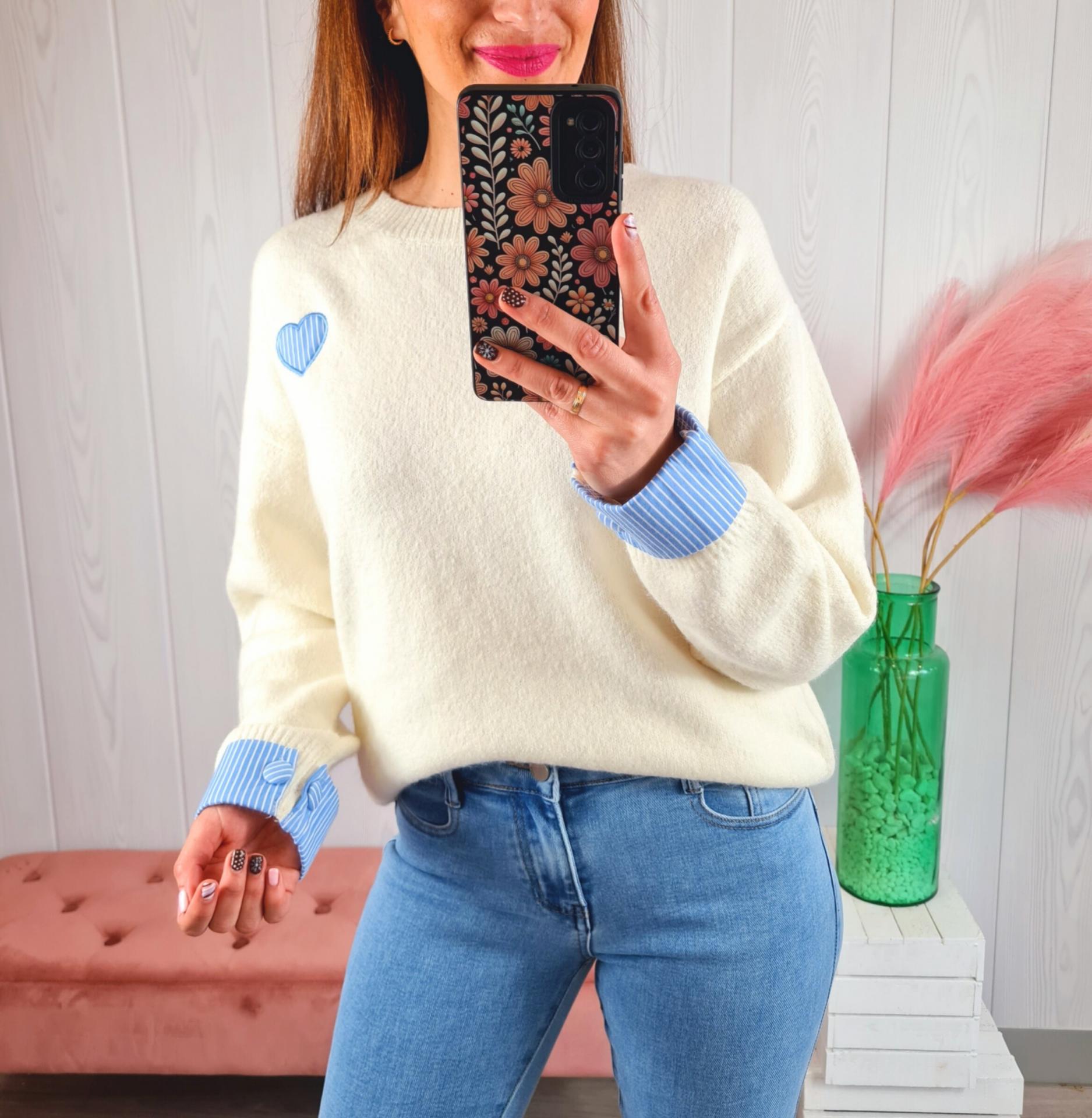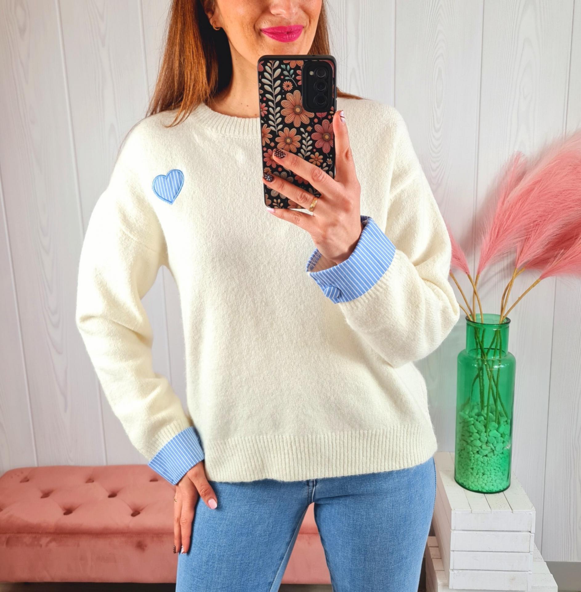 Jersey de color blanco con corazón azul de adorno en el pecho, manga larga con puños de camisa y cuello redondo.