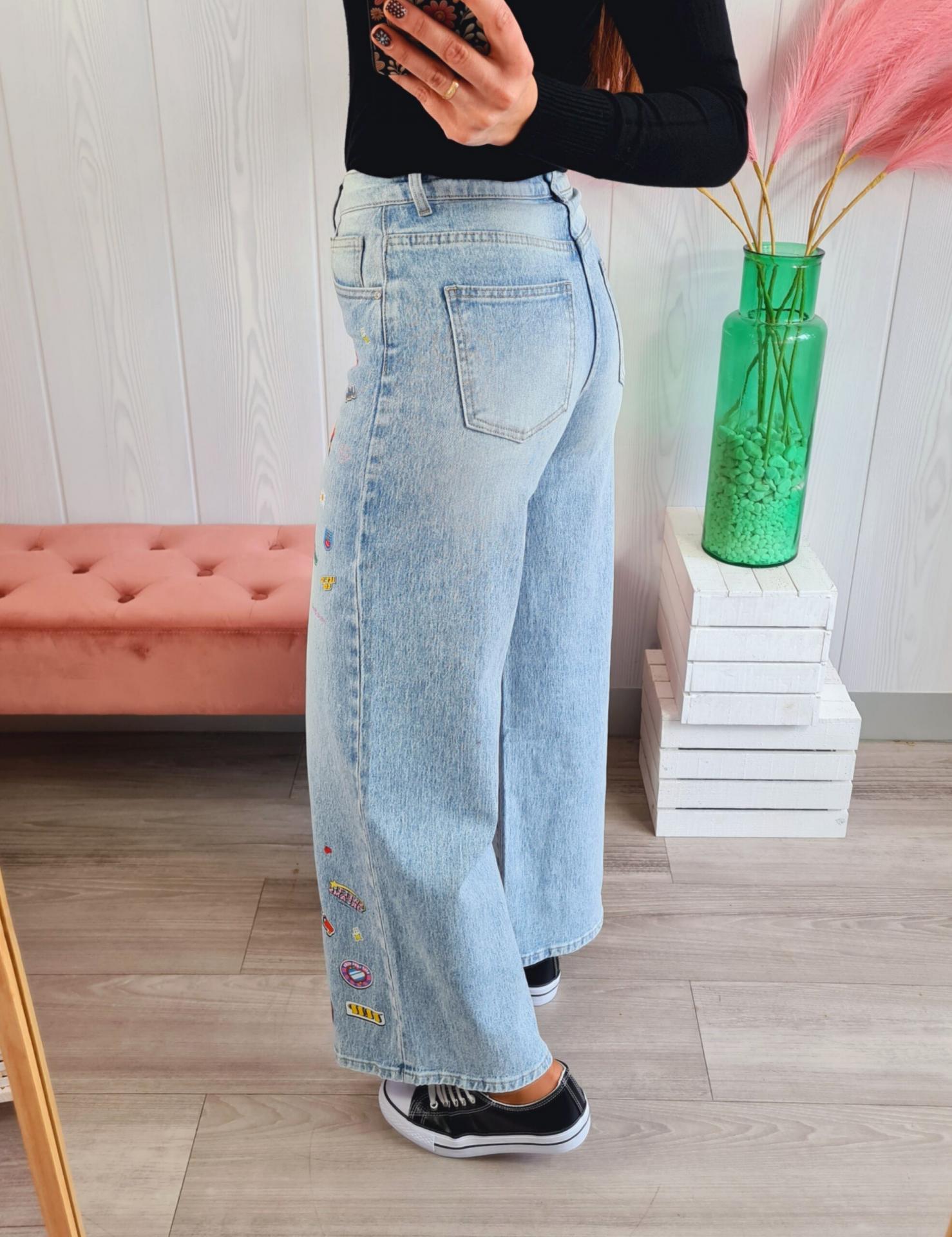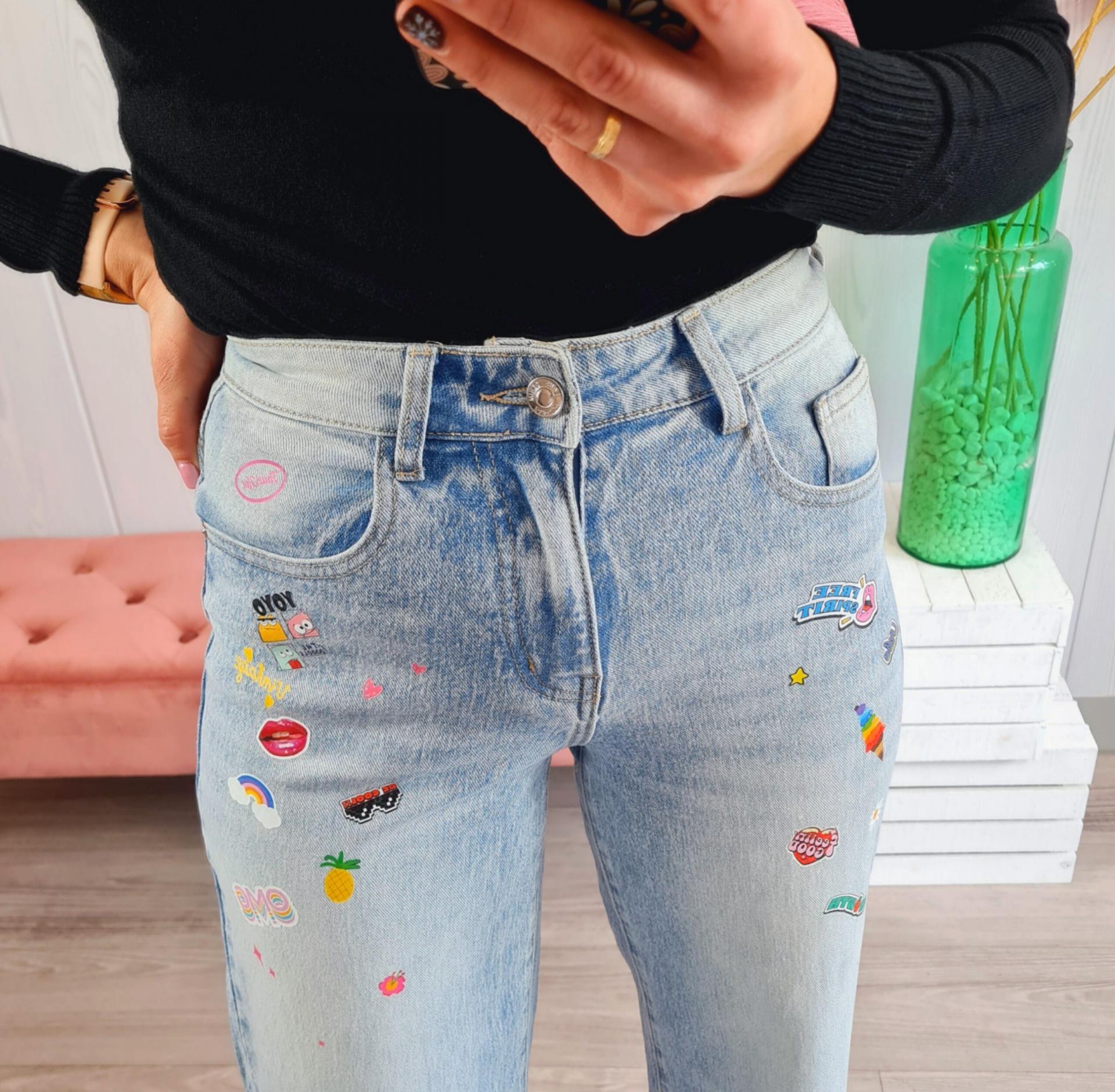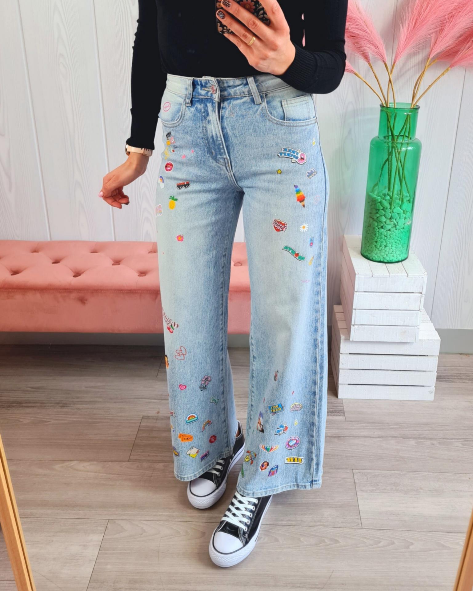 Pantalón vaquero de color clarito con estampado impreso de dibujos. Tiene cierre con botón y cremallera.