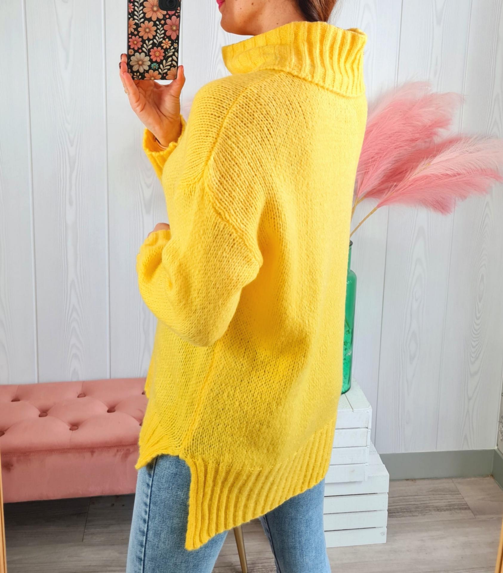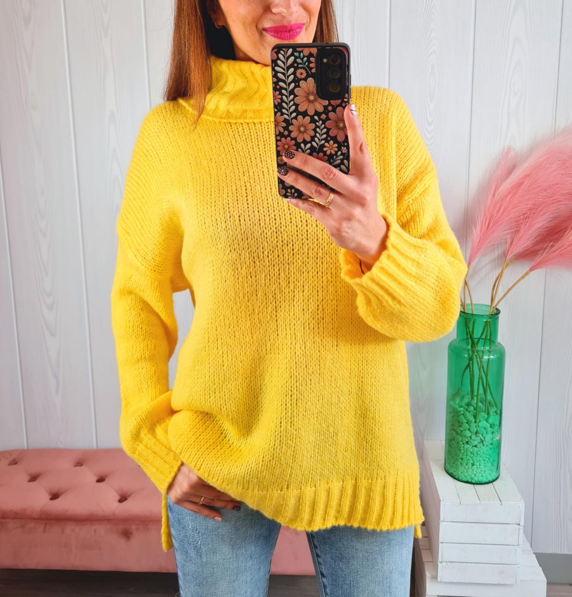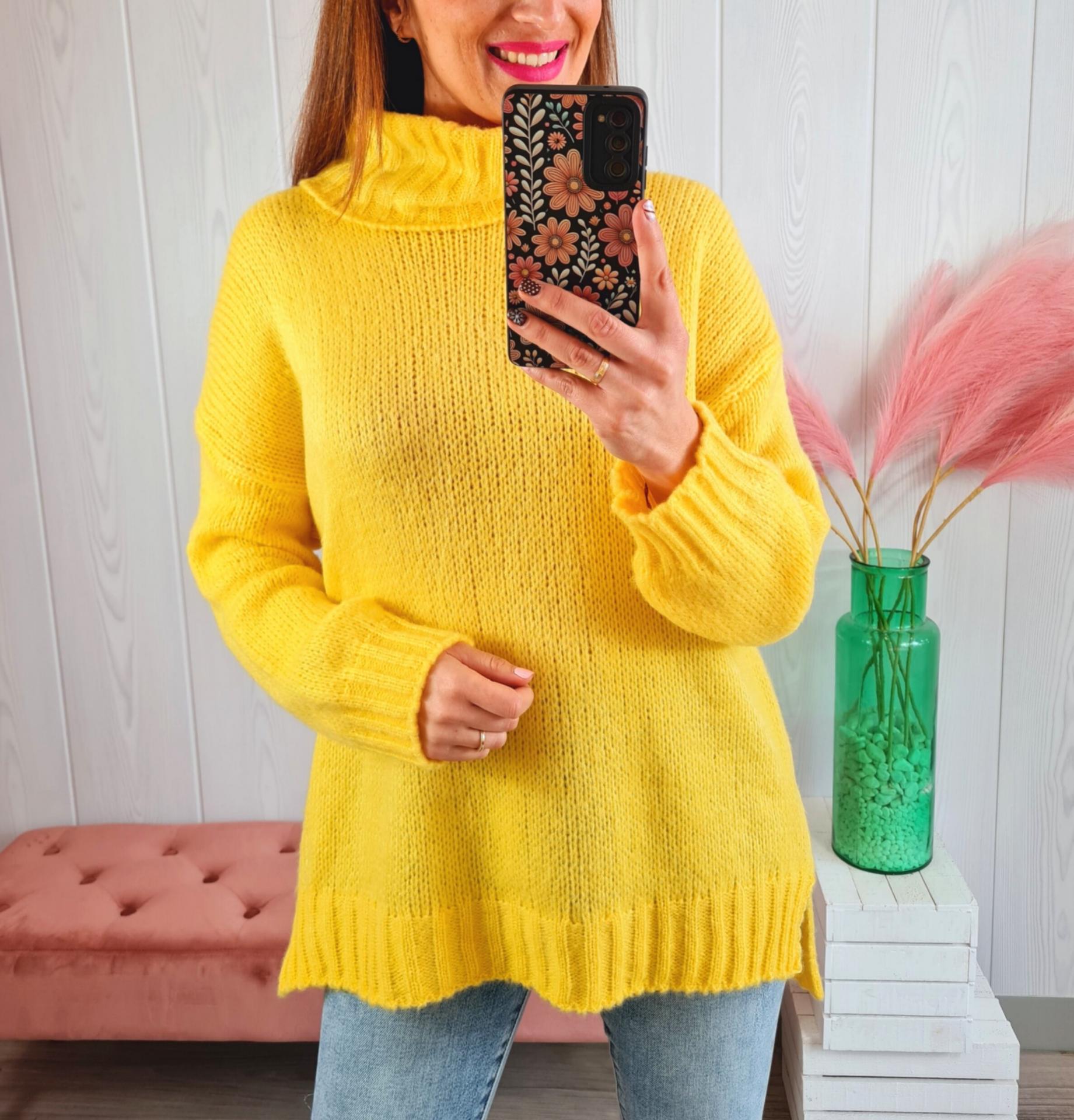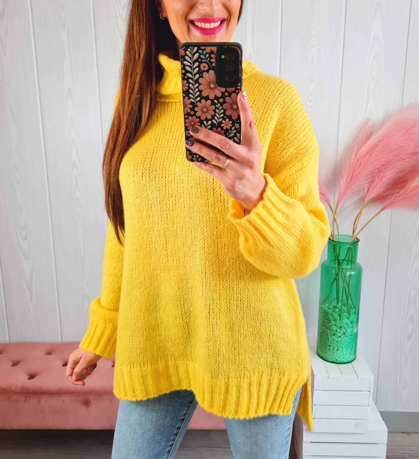 Jersey de color amarillo, cuello cisne y manga larga.