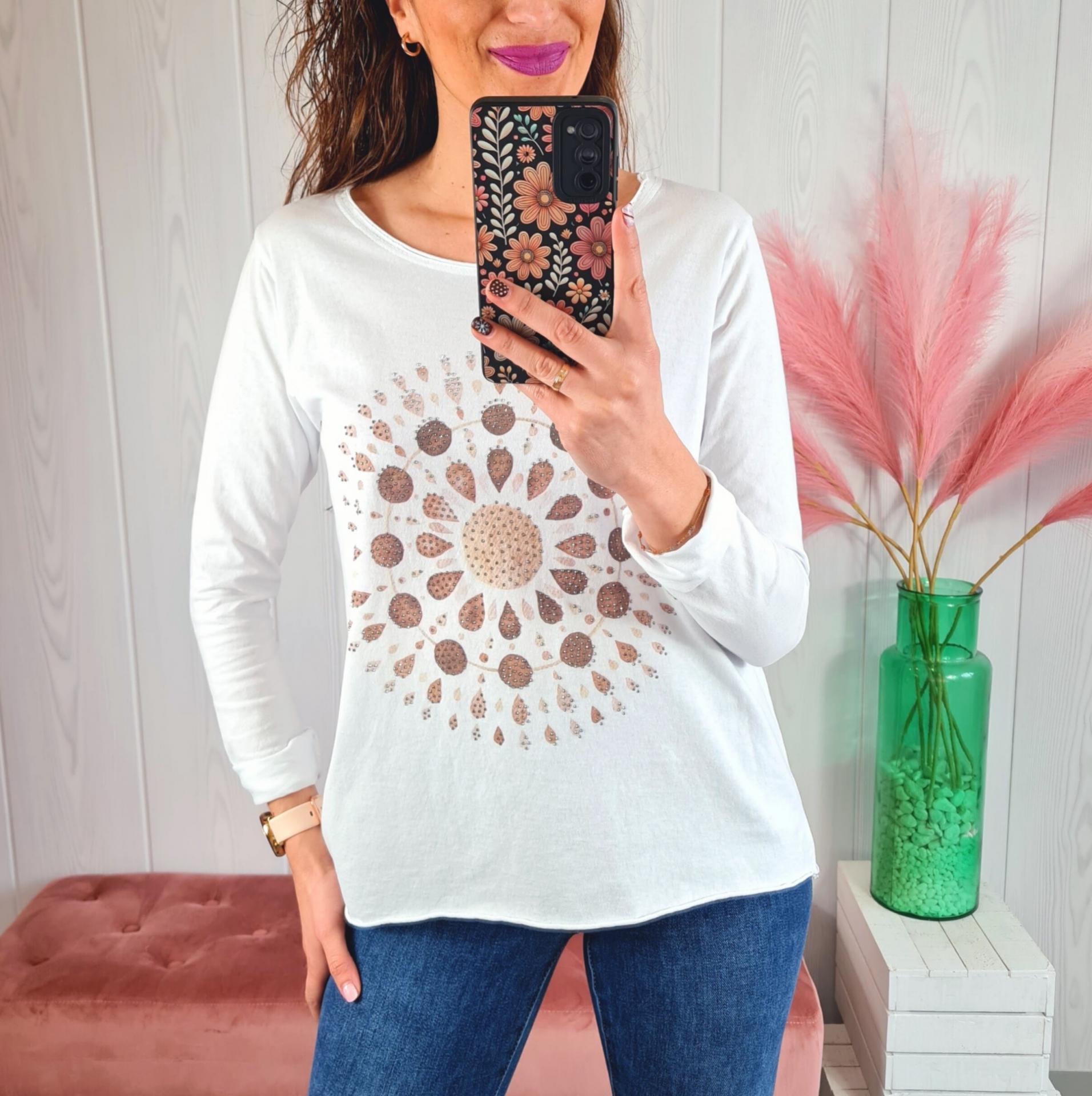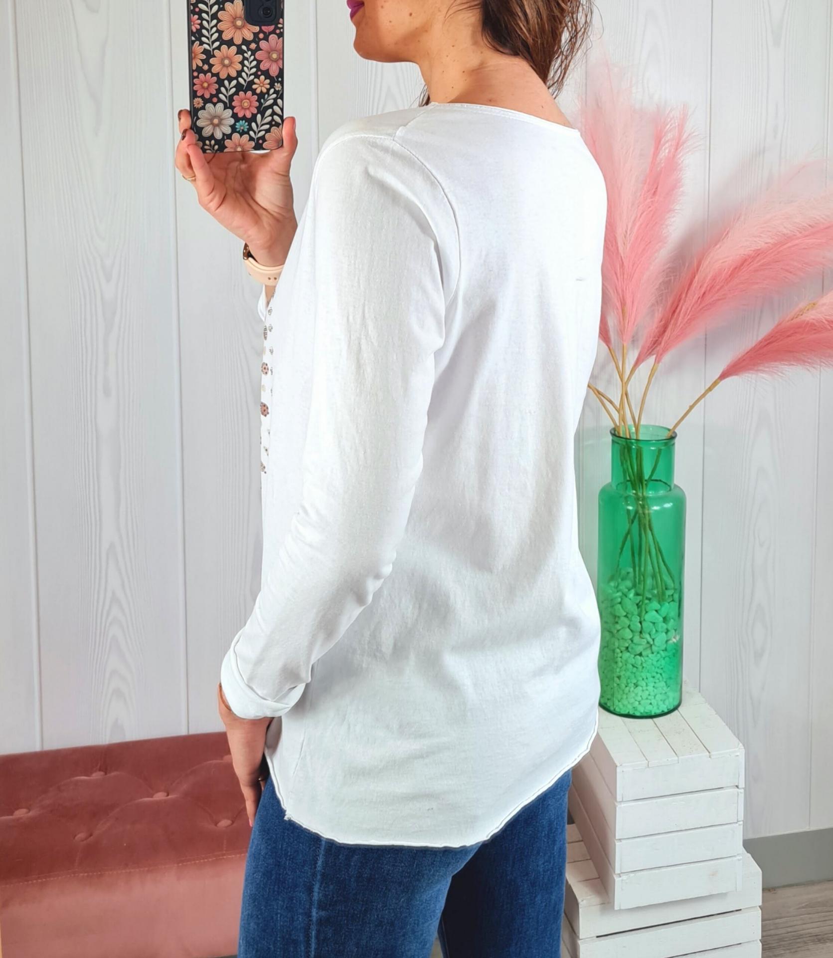 Camiseta blanca con estampado impreso en el pecho con tachas de adorno, manga larga y cuello redondo.