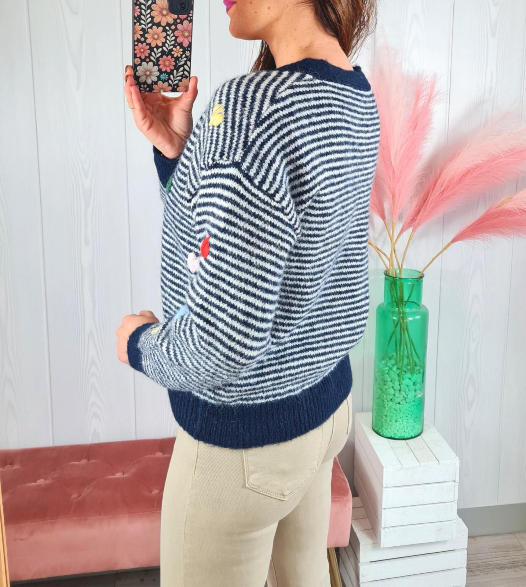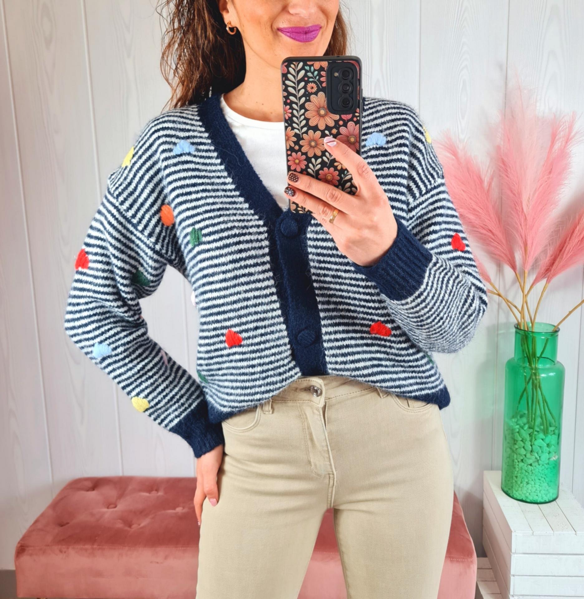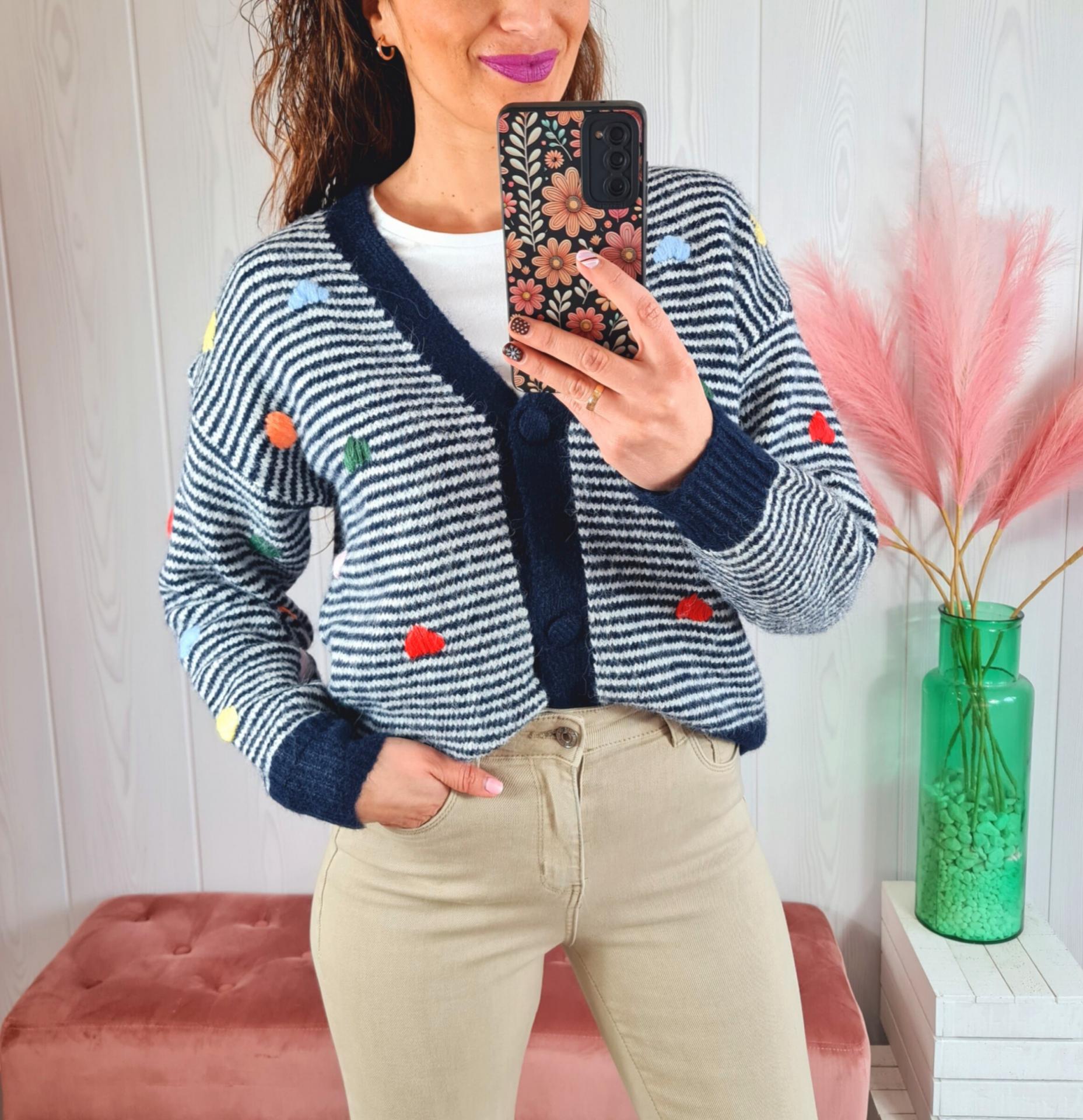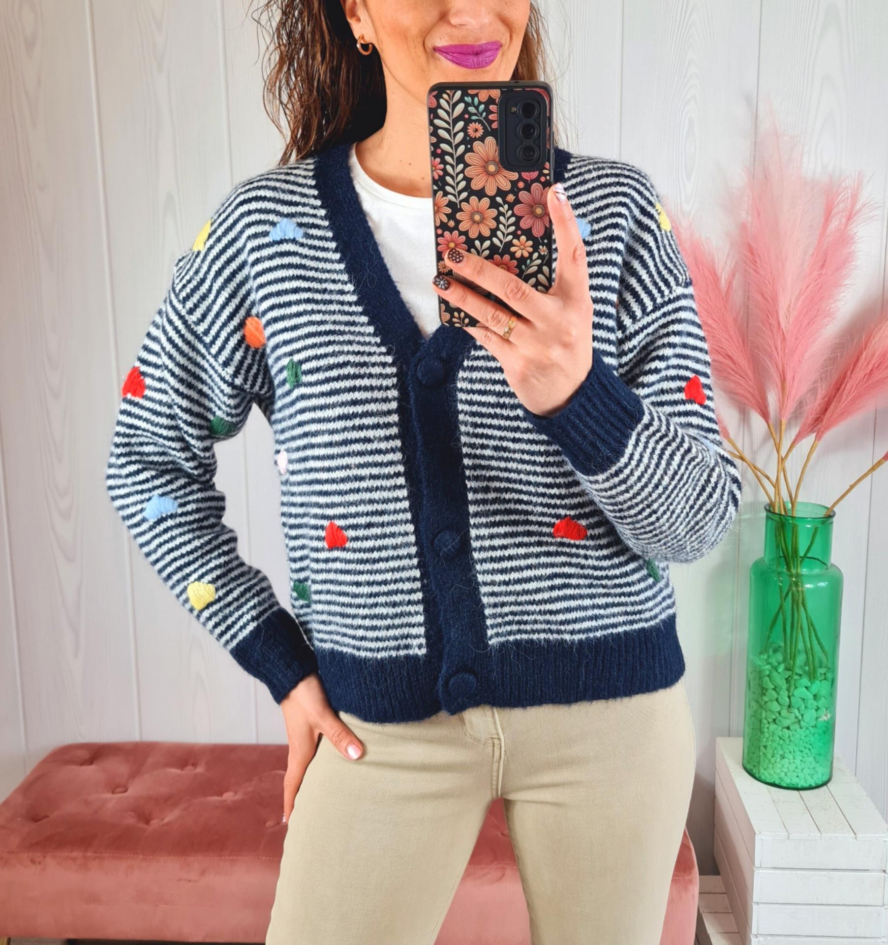 Rebeca de punto a rayas azul marino y blancas con corazones de colores de adorno. Tiene cuello de pico, manga larga y abotonadura delantera.