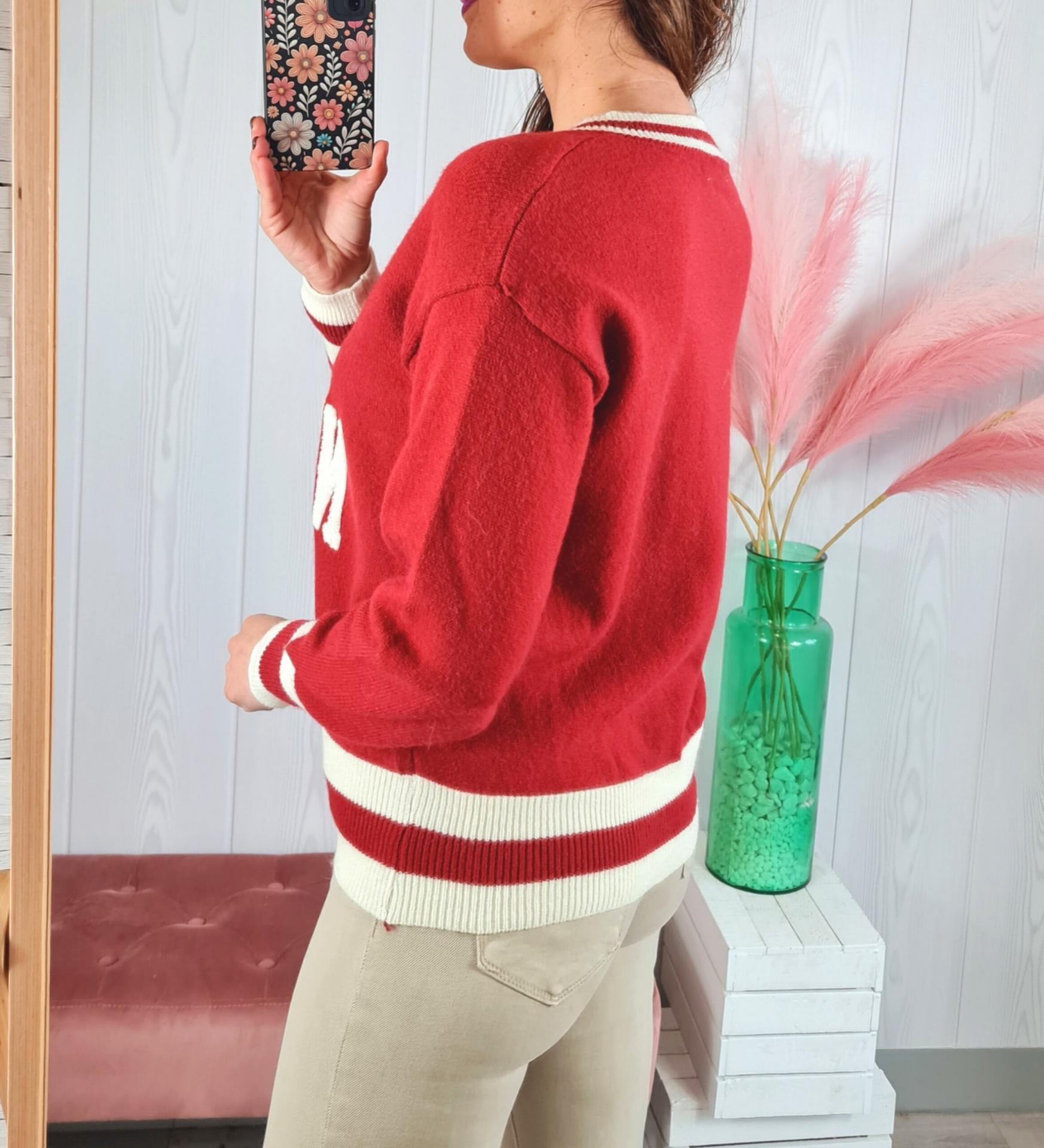 Jersey de color granate con estampado en el pecho en color blanco, cuello de pico y manga larga.
