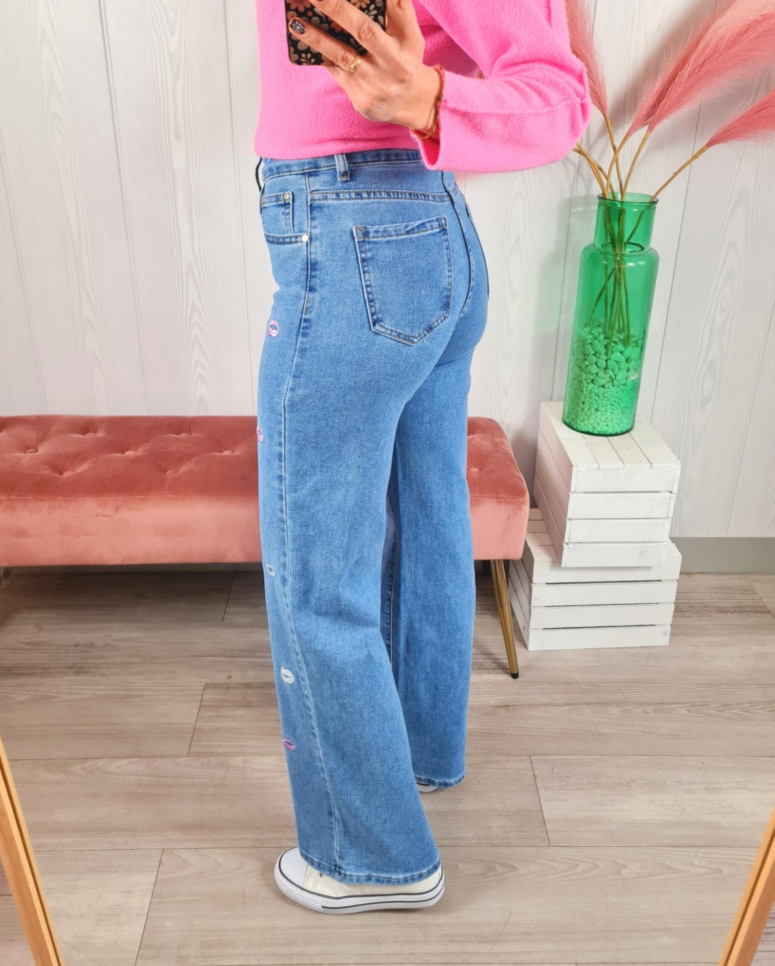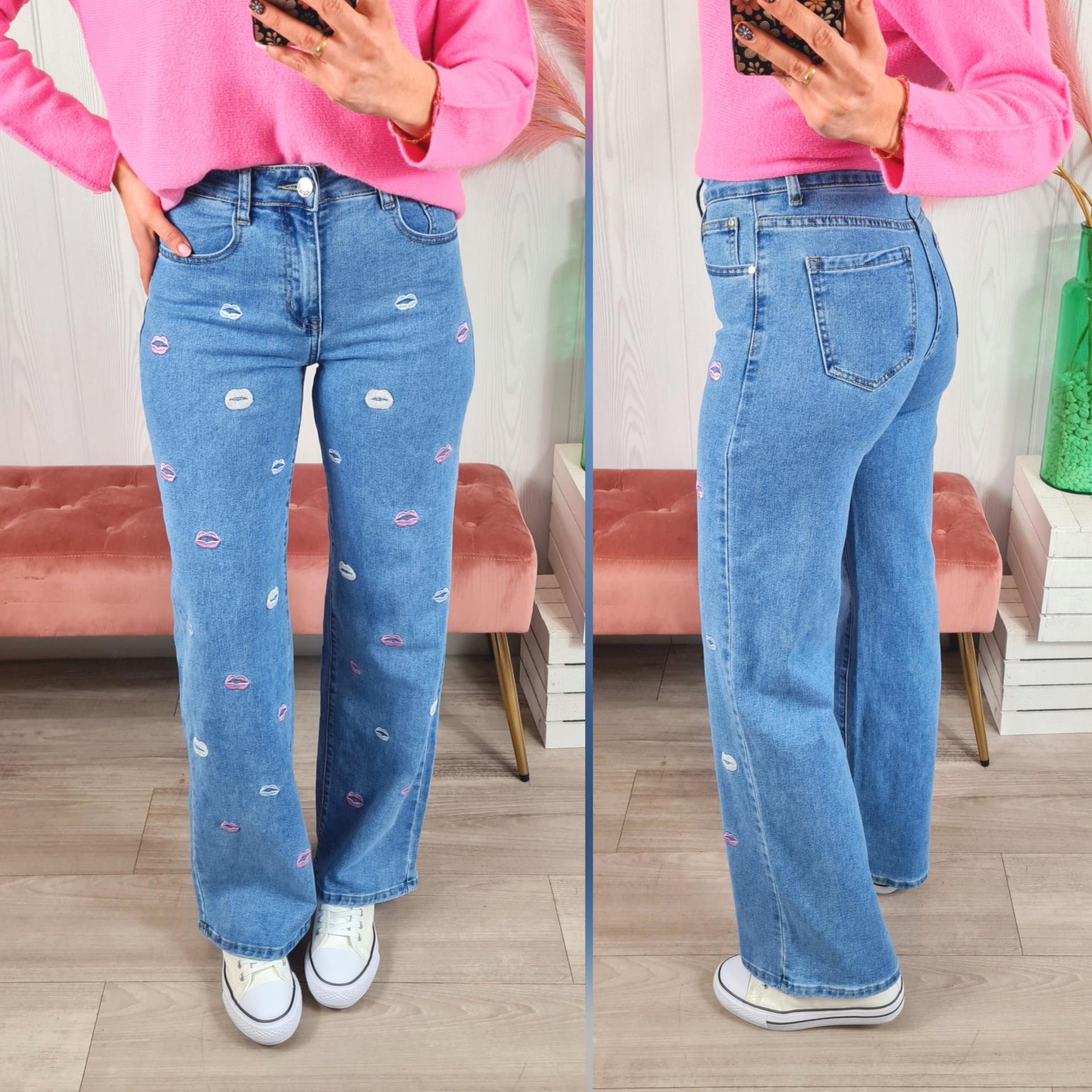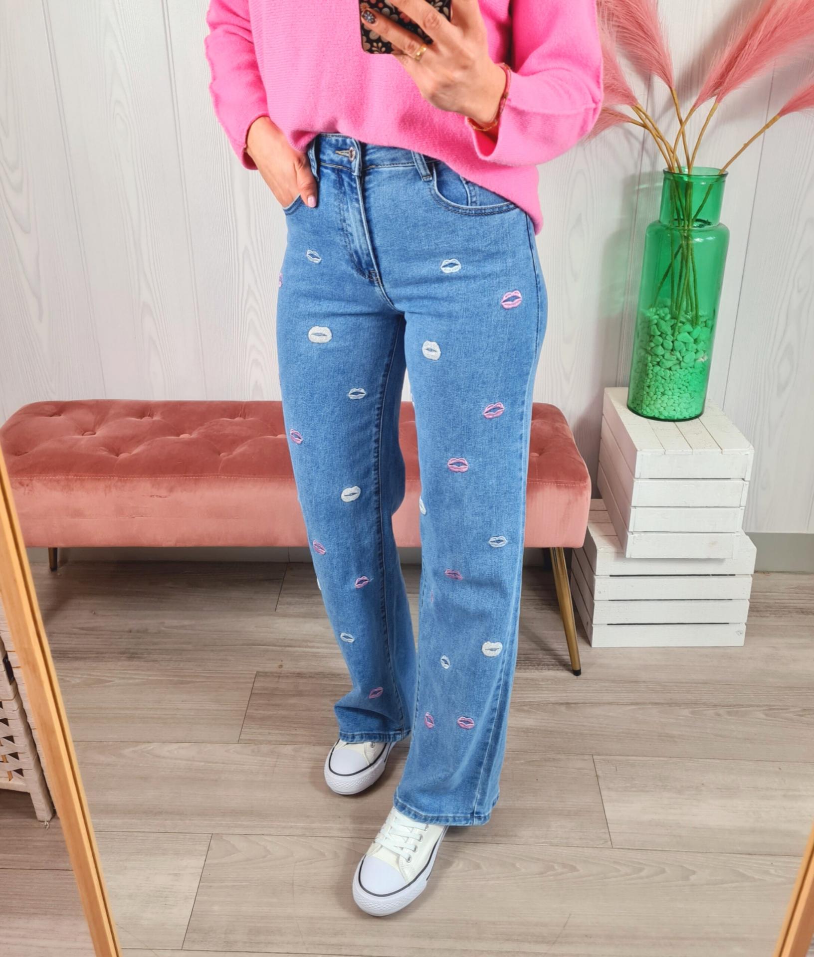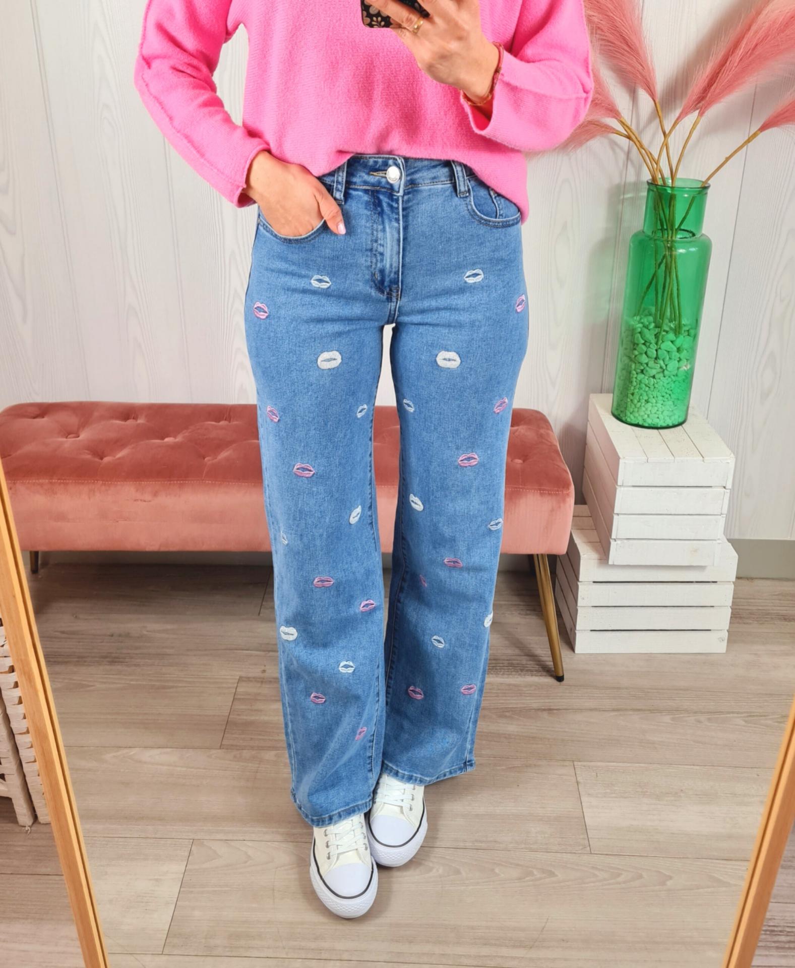 Pantalón vaquero de color clarito con estampado de labios en color blanco y rosa. Tiene cierre con botón y cremallera.