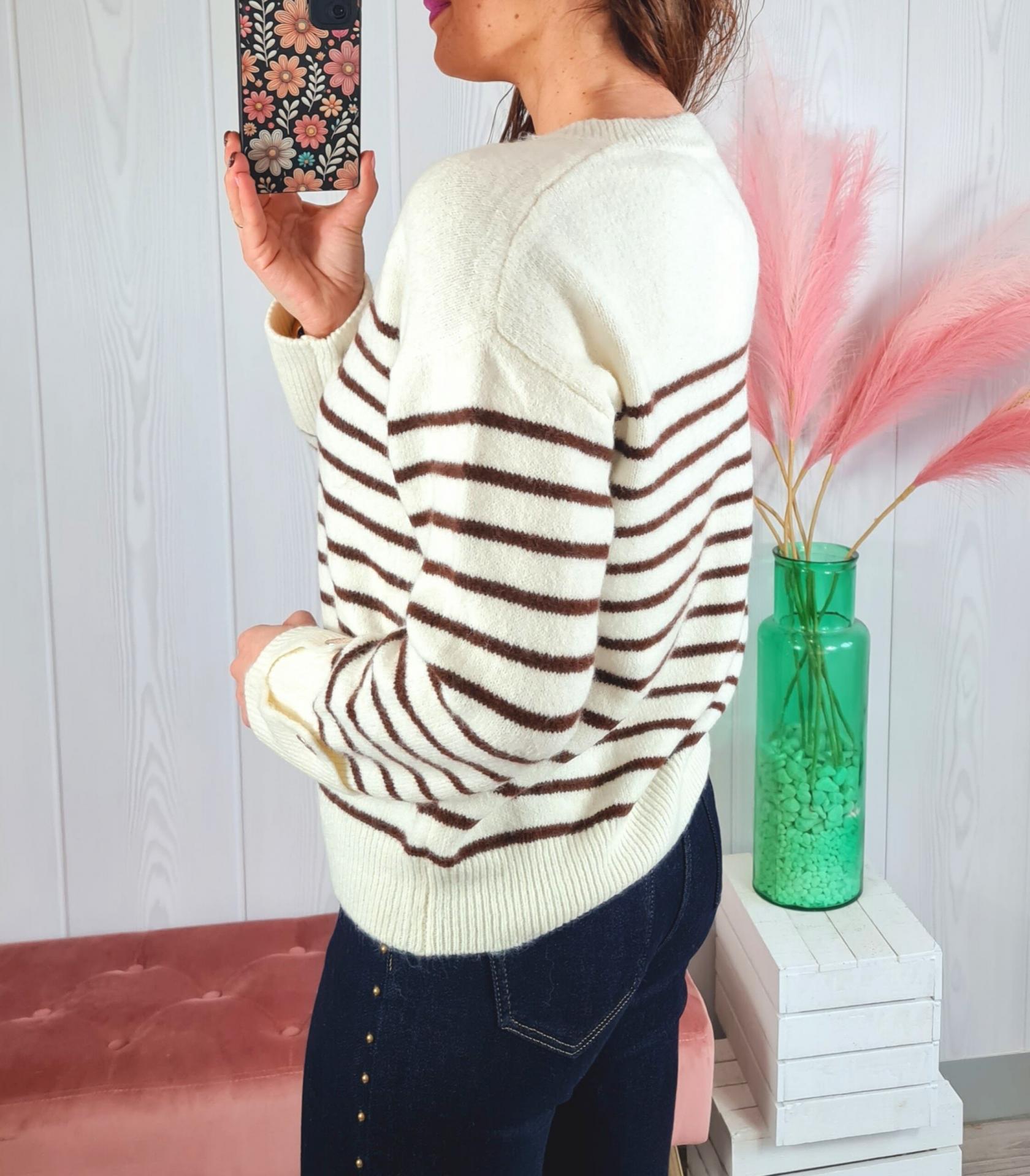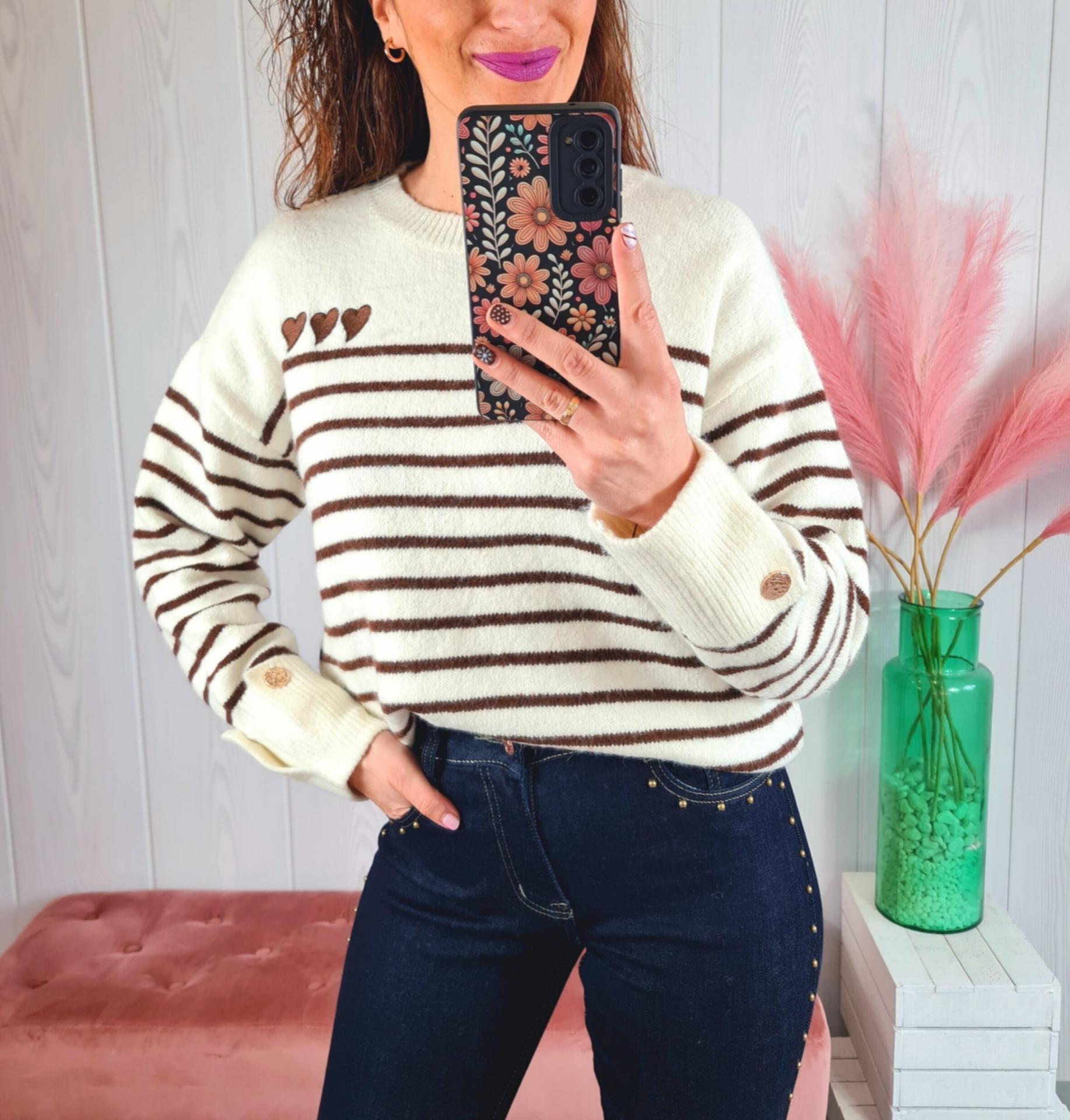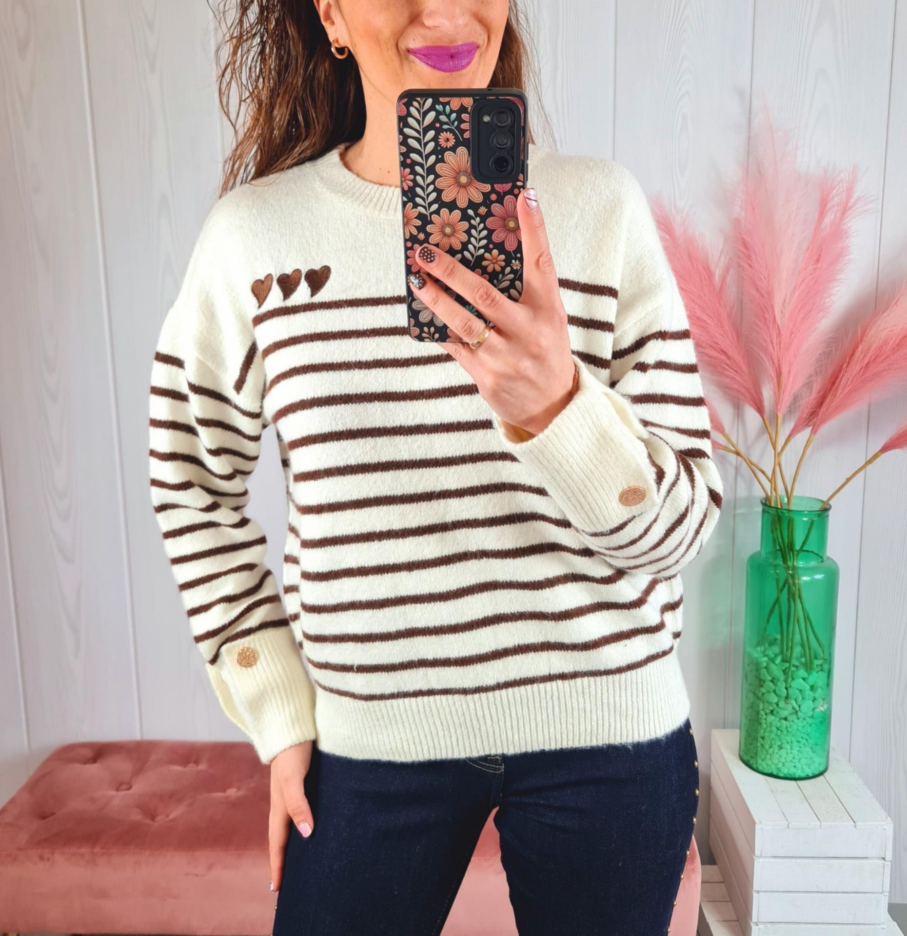 Jersey en color blanco con rayas marrones y corazones de adorno en el pecho. Tiene cuello redondo y manga larga.