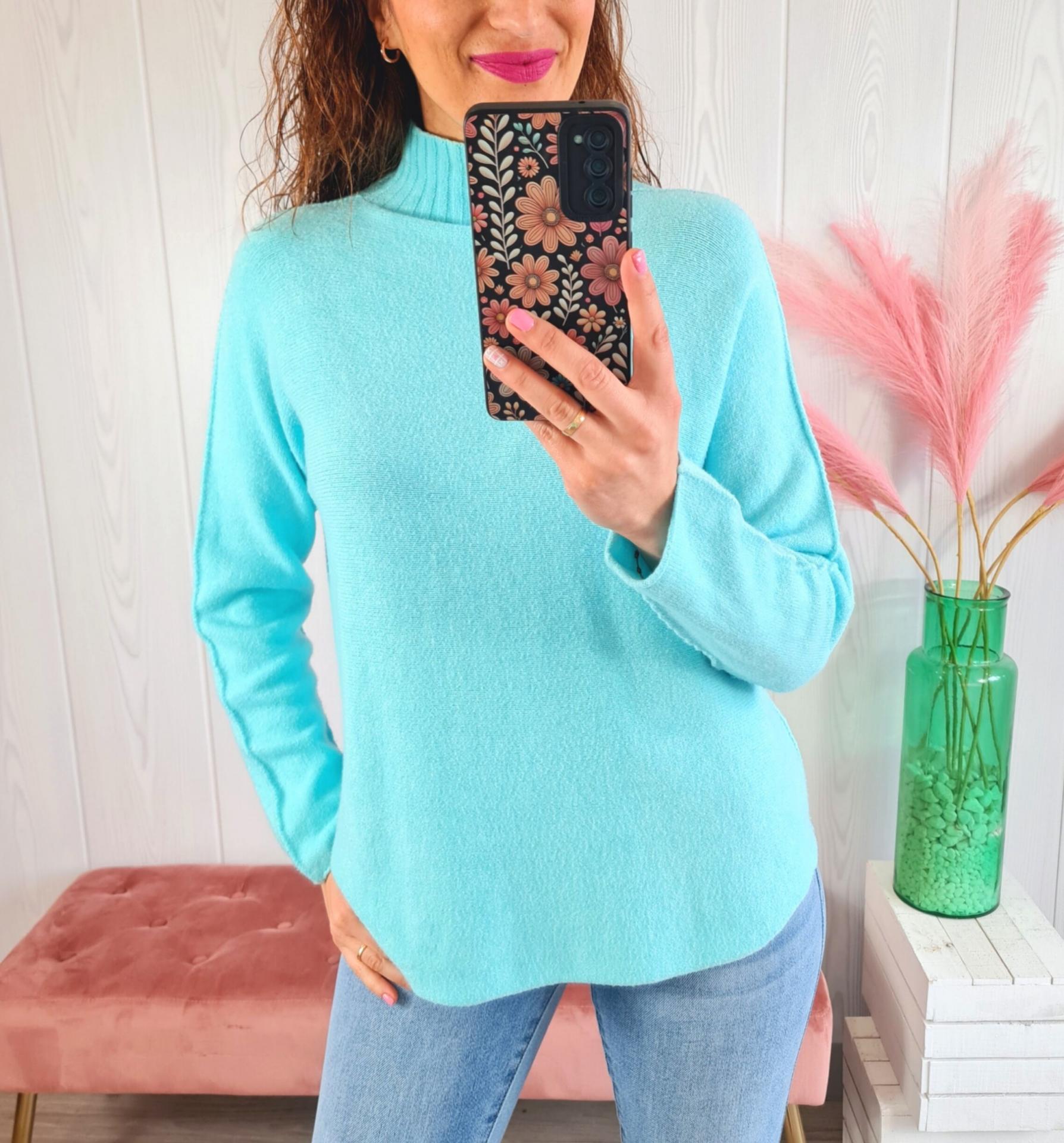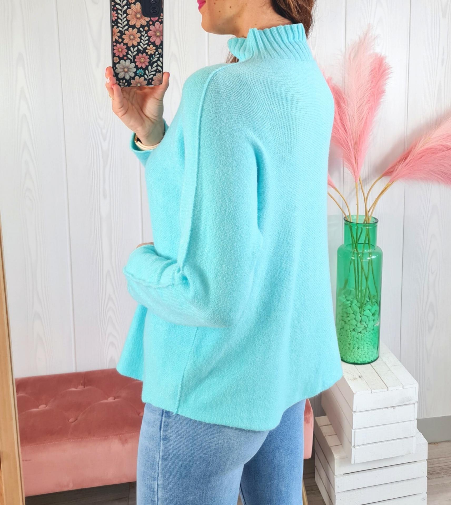 Jersey de color aguamarina liso, con cuello subido y manga larga.