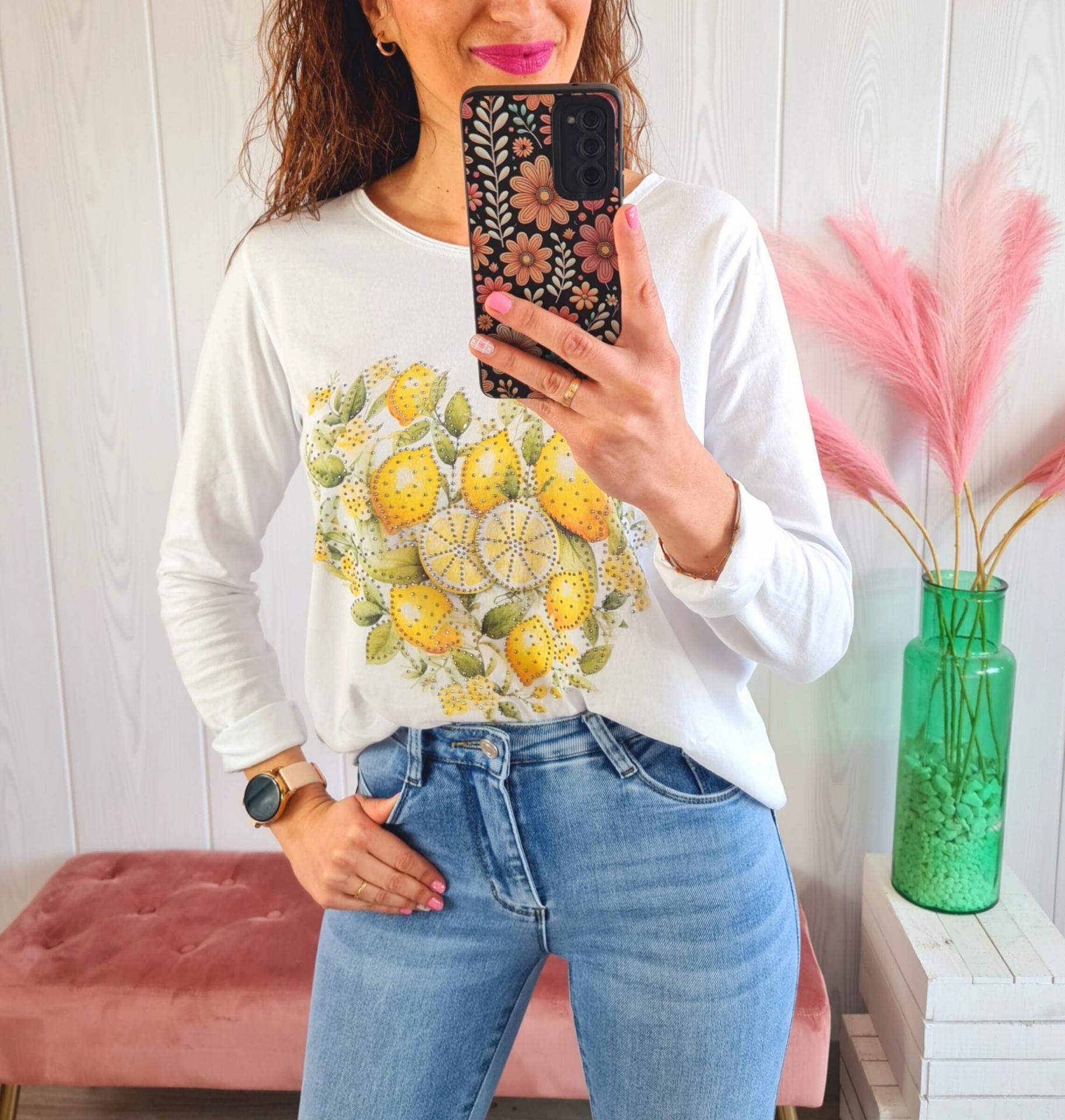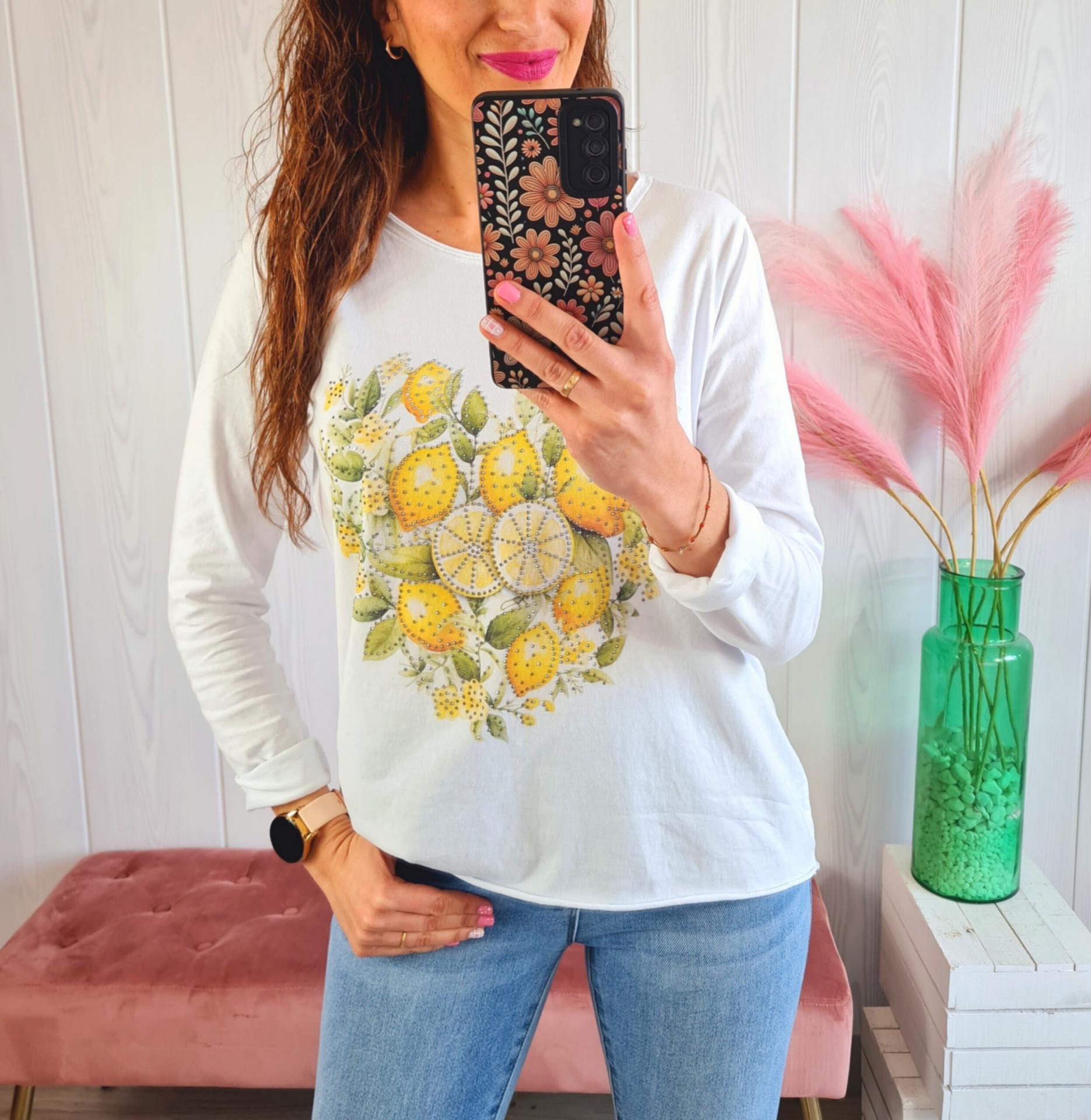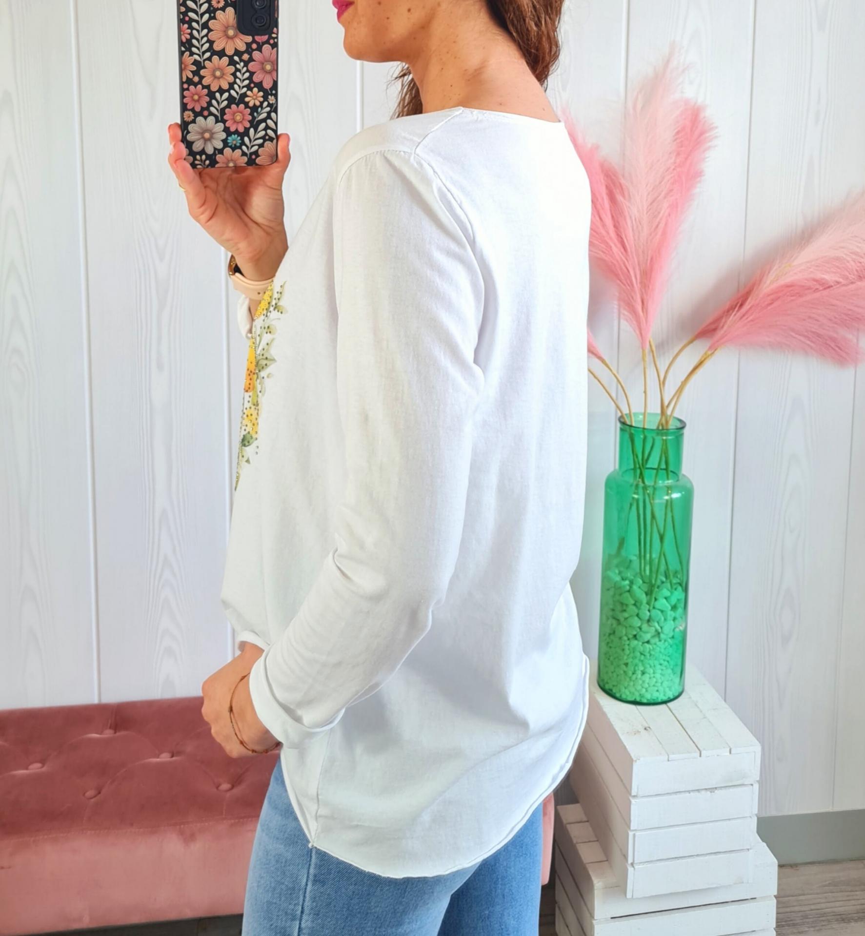 Camiseta blanca con estampado impreso en el pecho con tachas de adorno, manga larga y cuello redondo.