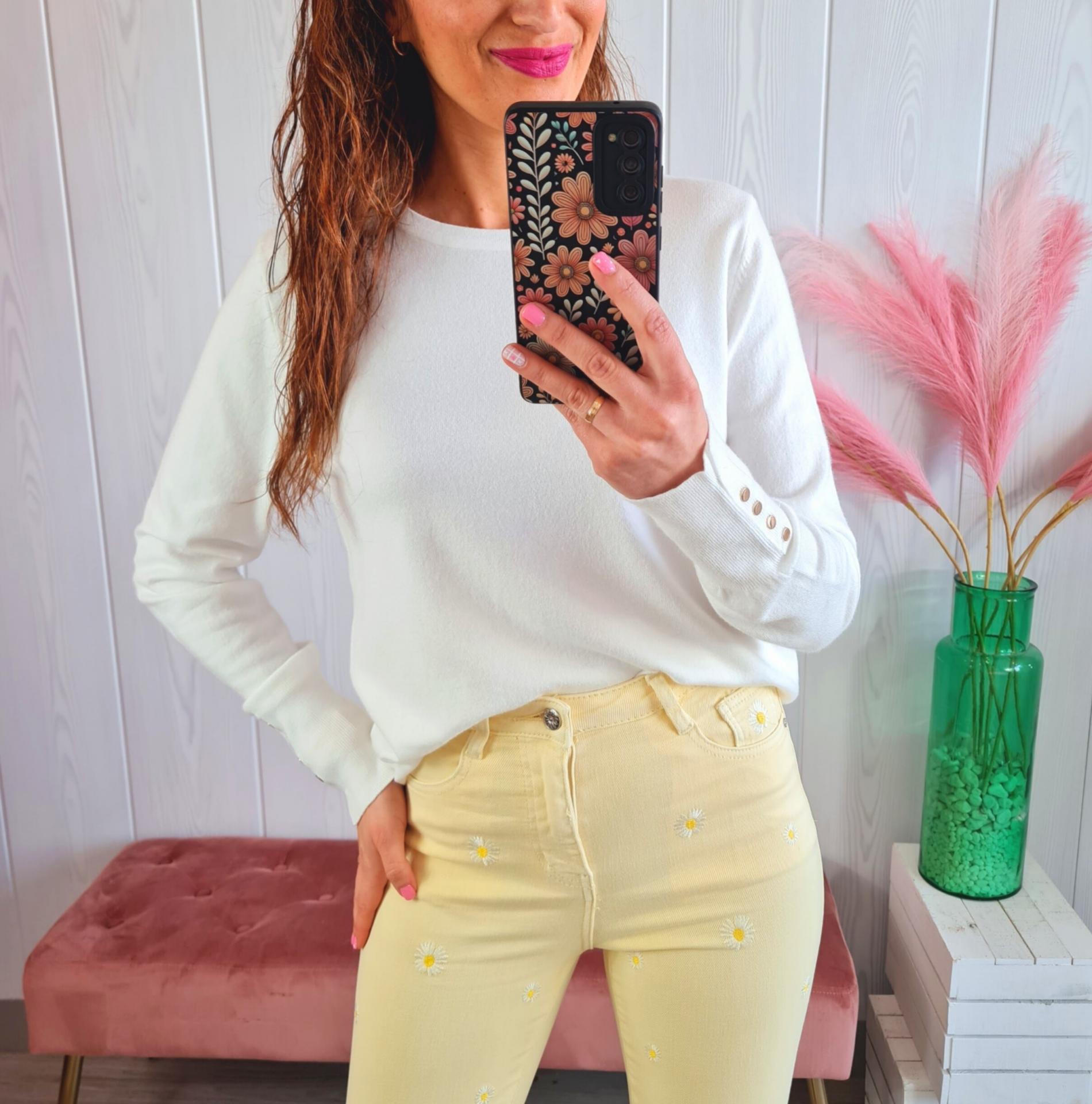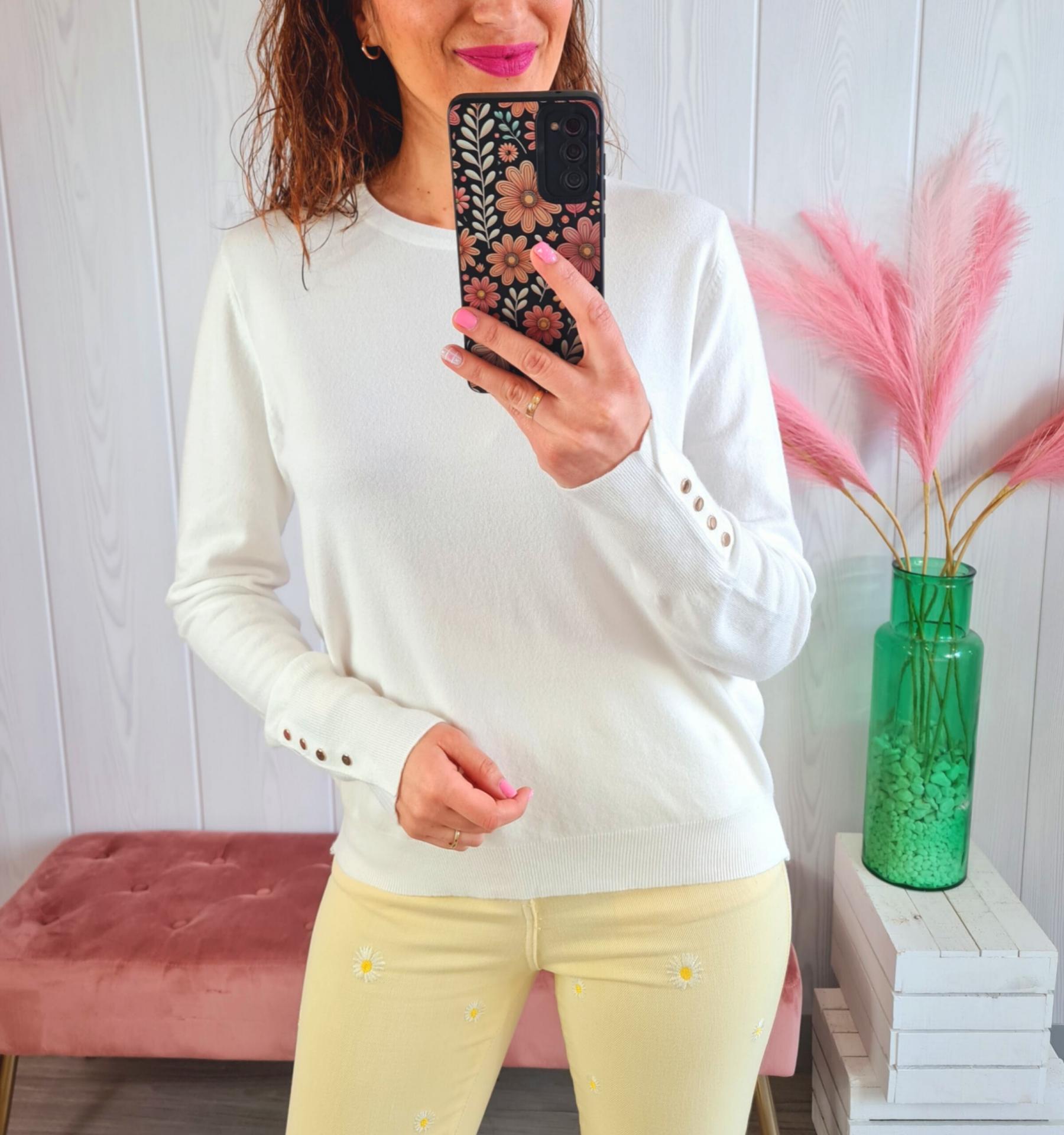 Jersey de color blanco con cuello redondo y manga larga. Tiene botones de adorno en los puños.
