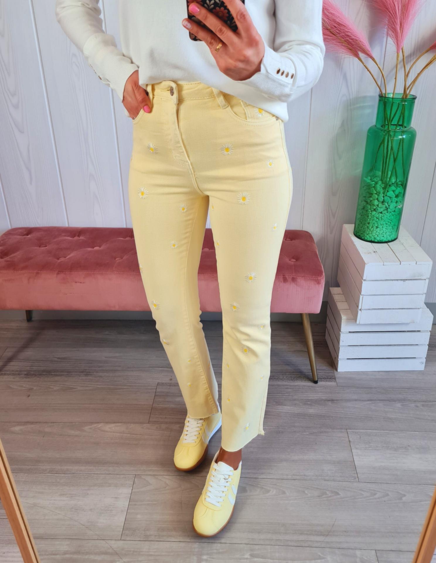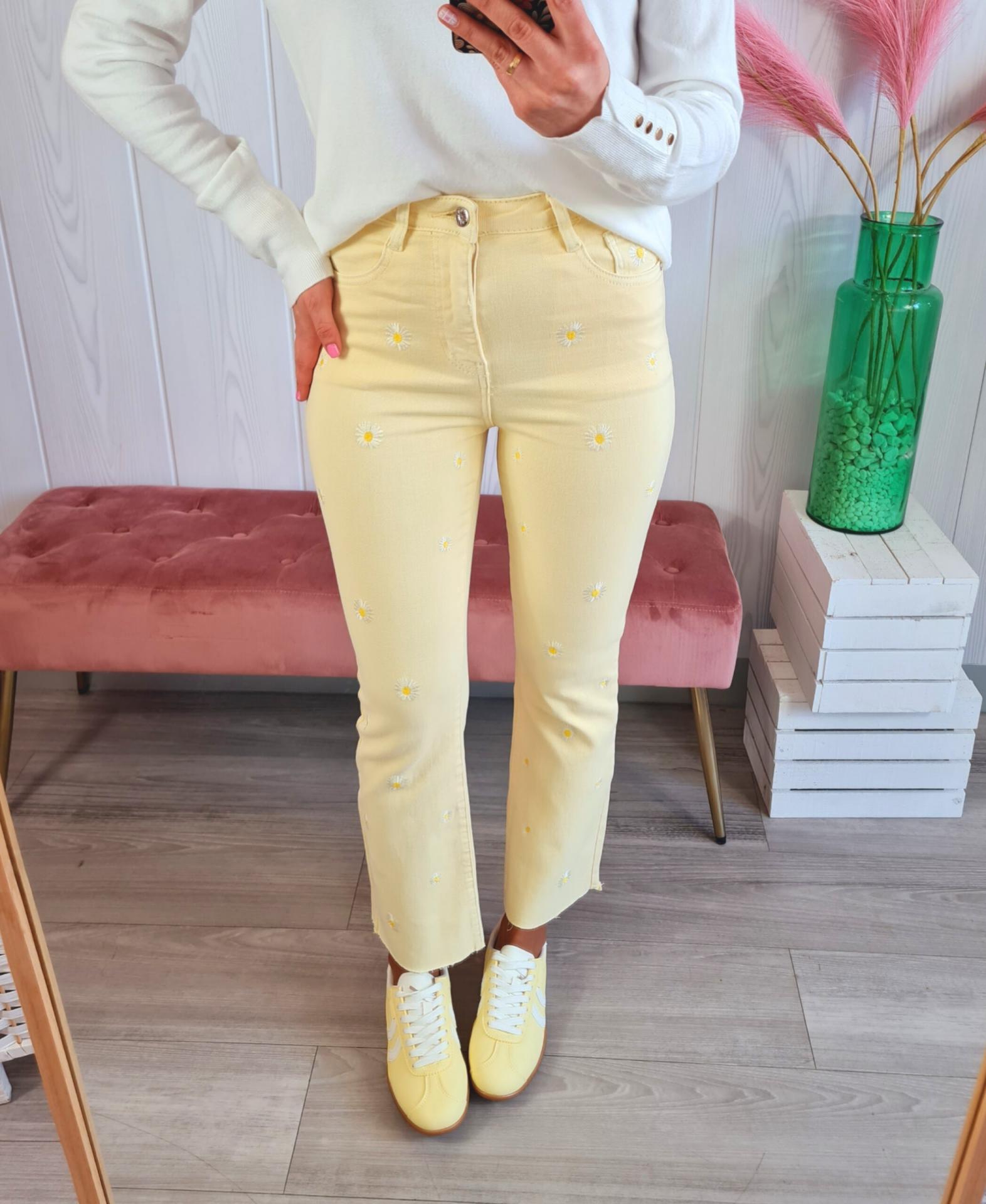Pantalón vaquero de estilo cropped en amarillo con estampado de margaritas. Tiene cierre con botón y cremallera y el bajo desflecado.