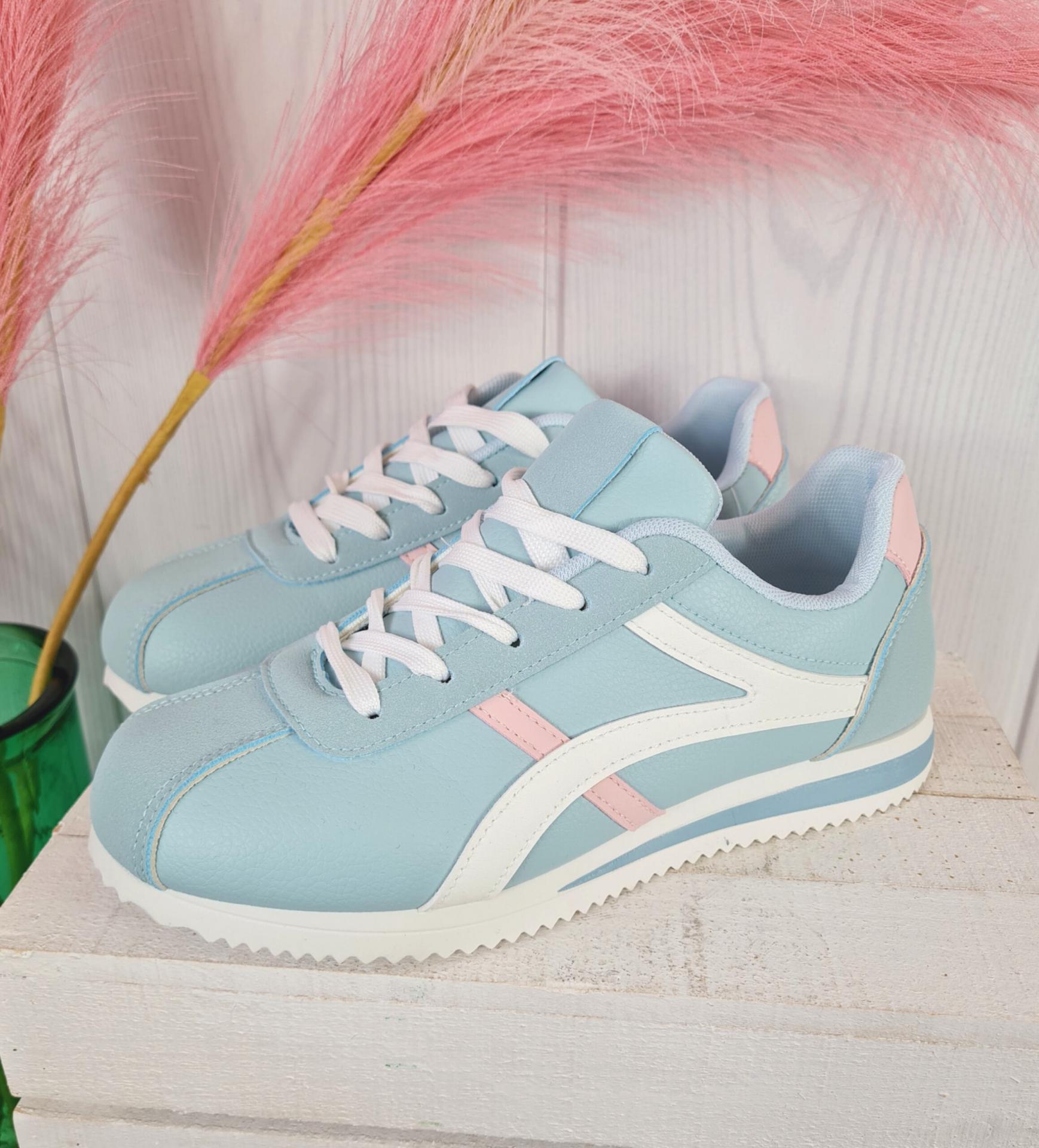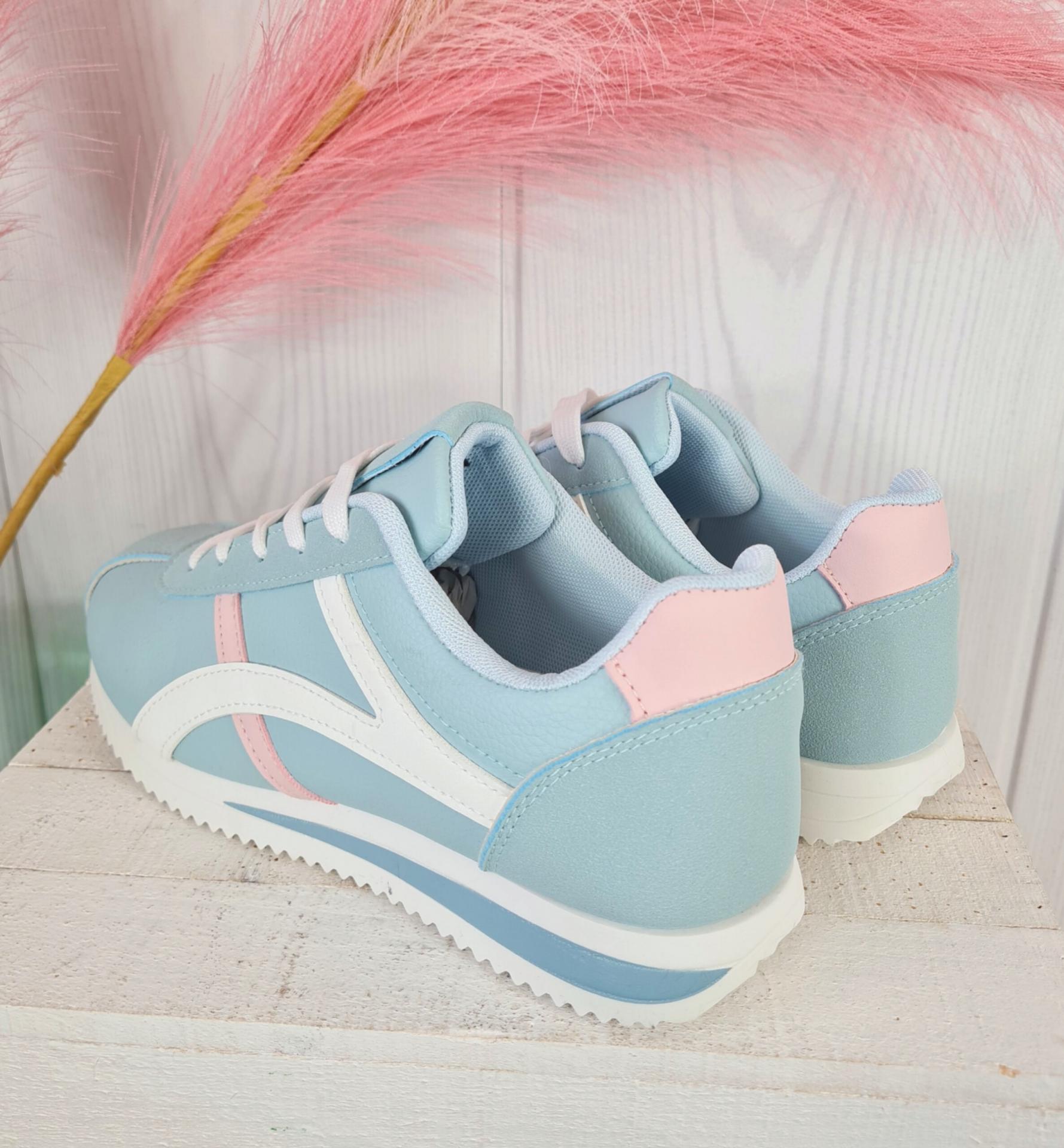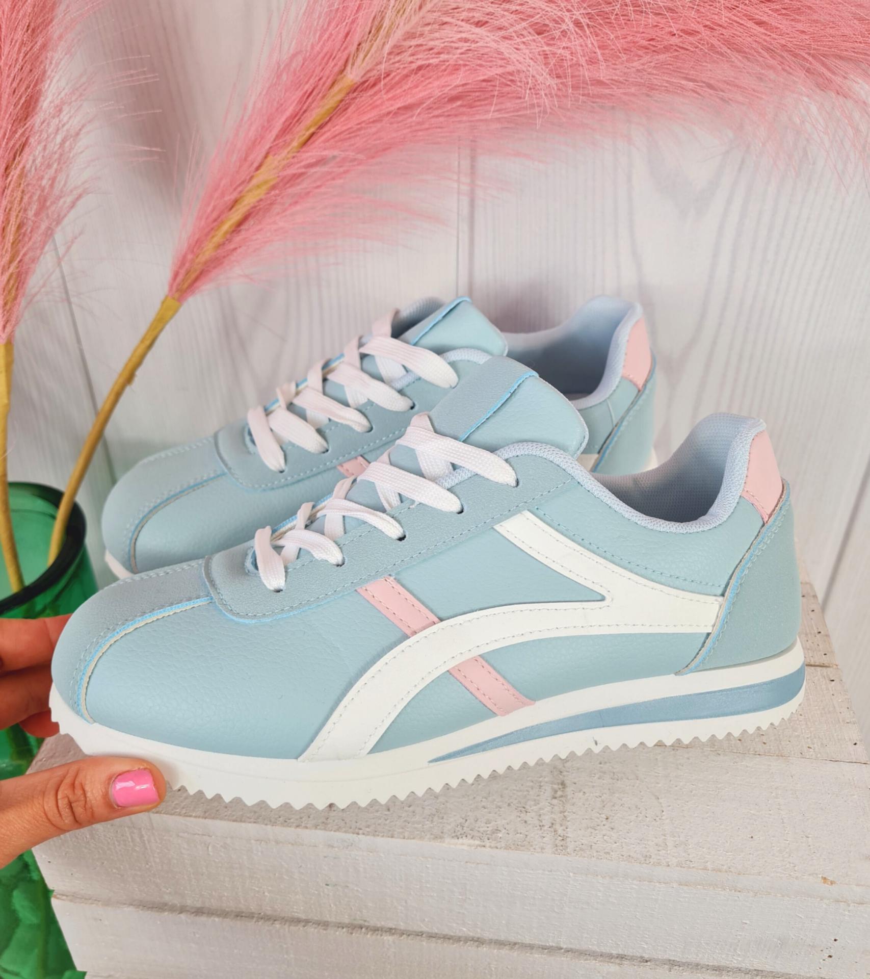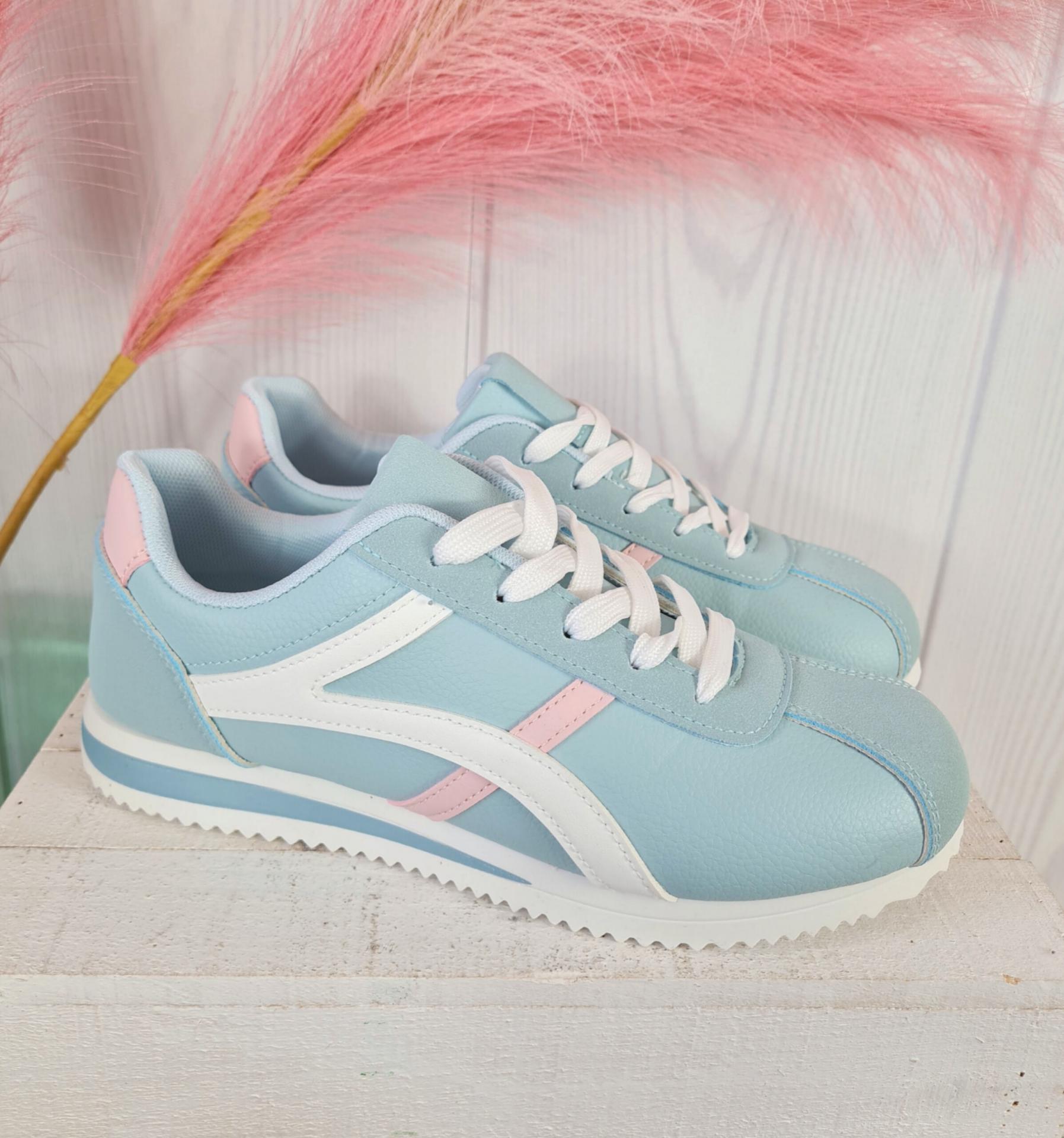 Zapatillas en color azul verdoso combinadas con blanco y rosa.