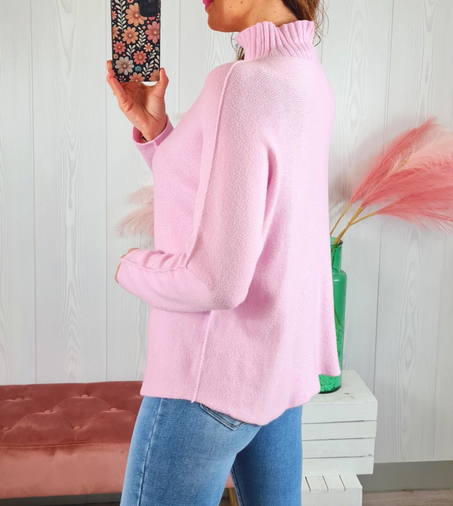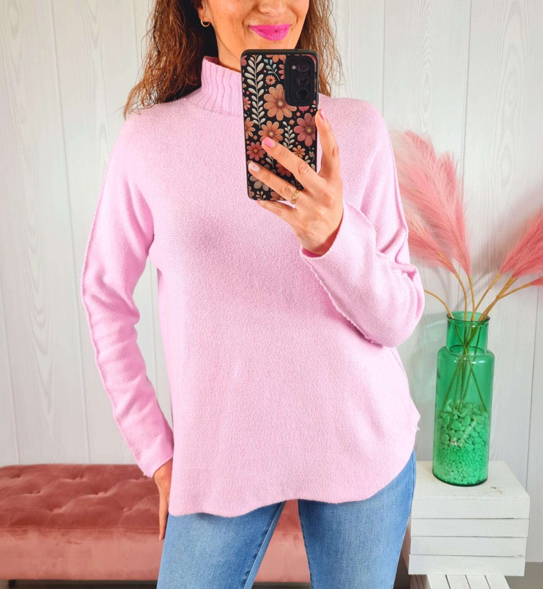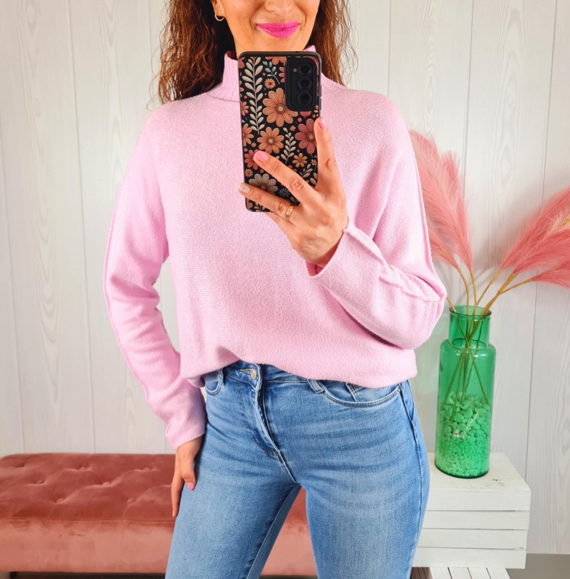Jersey de color rosita liso, con cuello subido y manga larga.