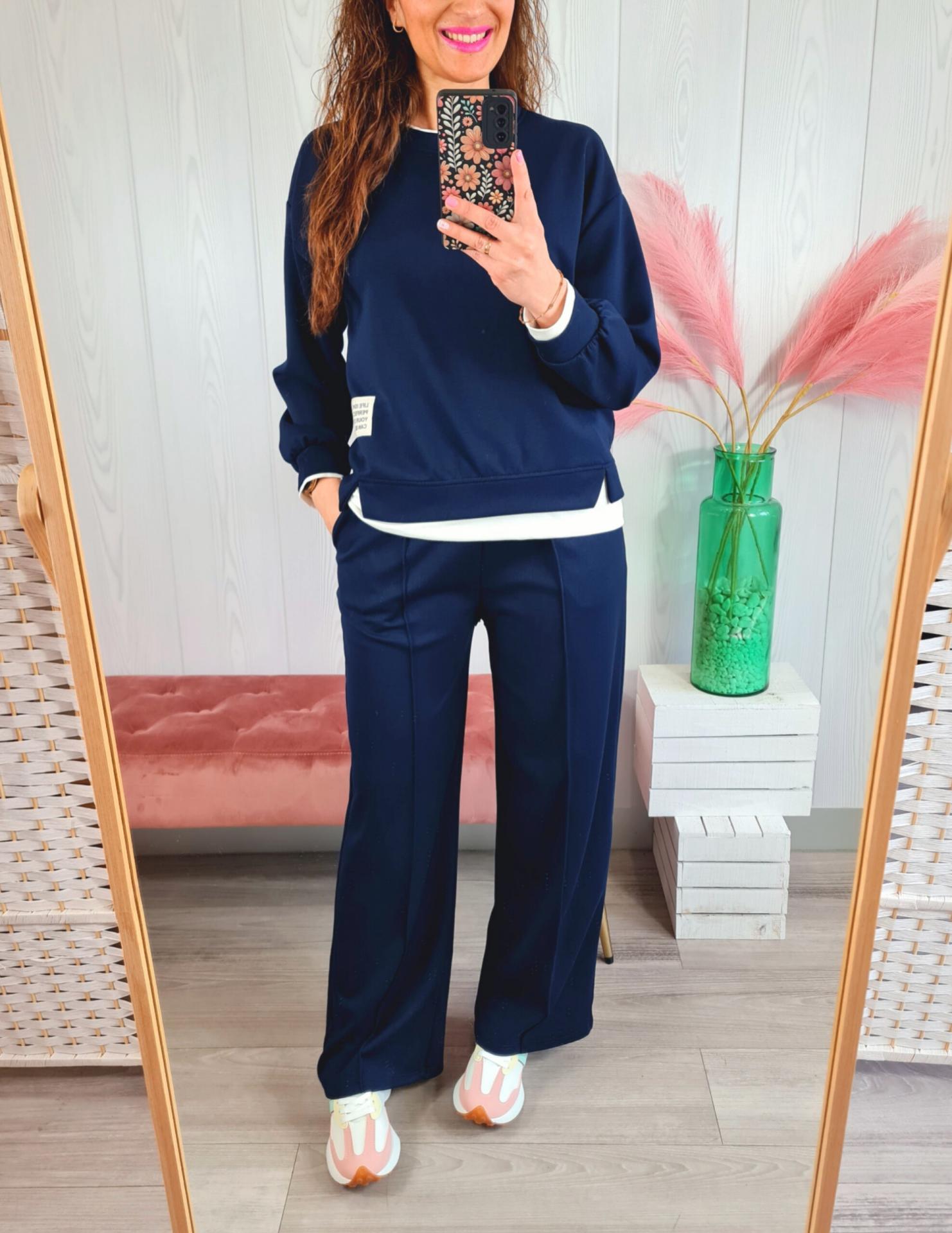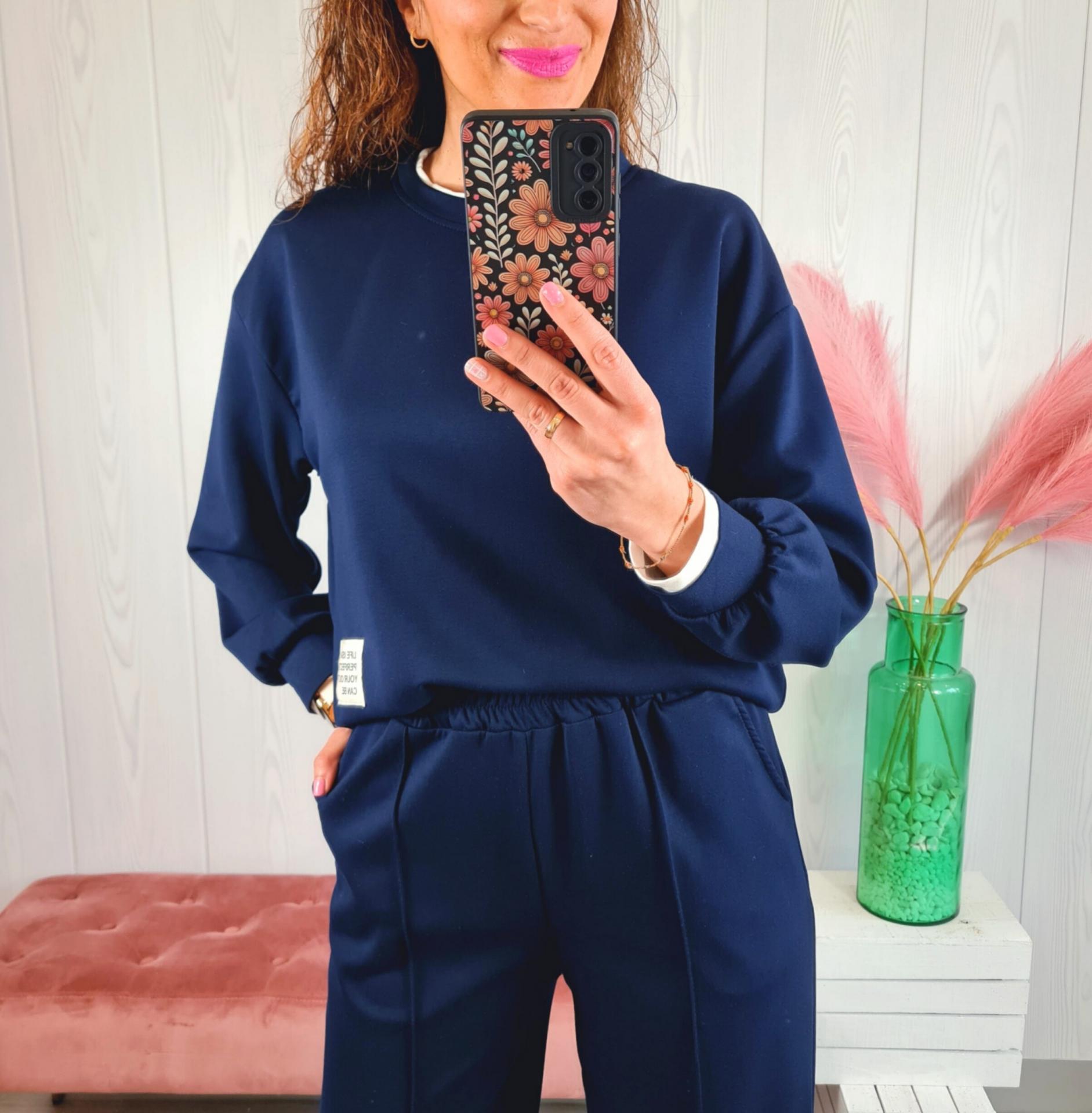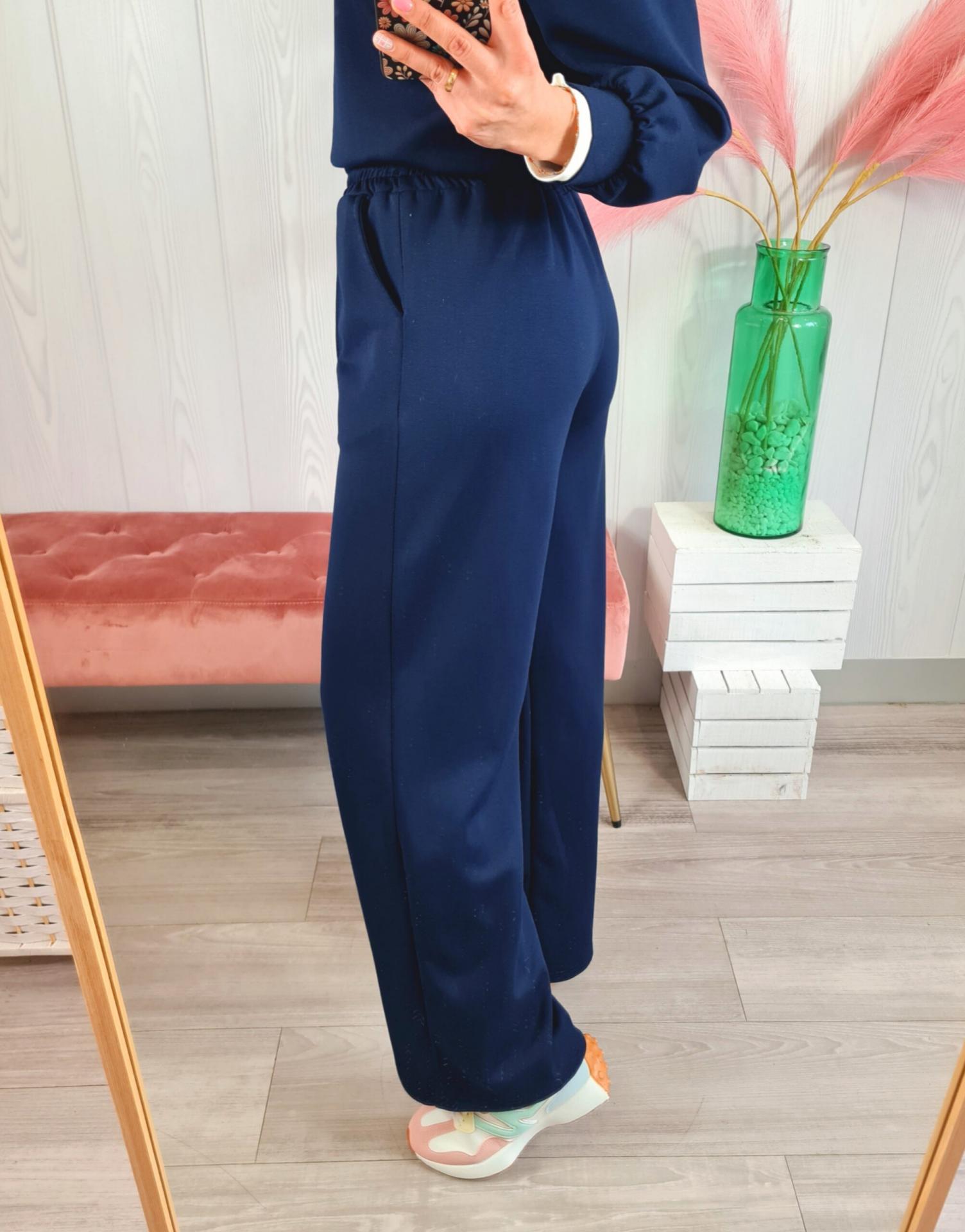 Conjunto de sudadera y pantalón de chándal de color azul marino. Tiene cuello redondo, manga larga y bolsillos laterales.
