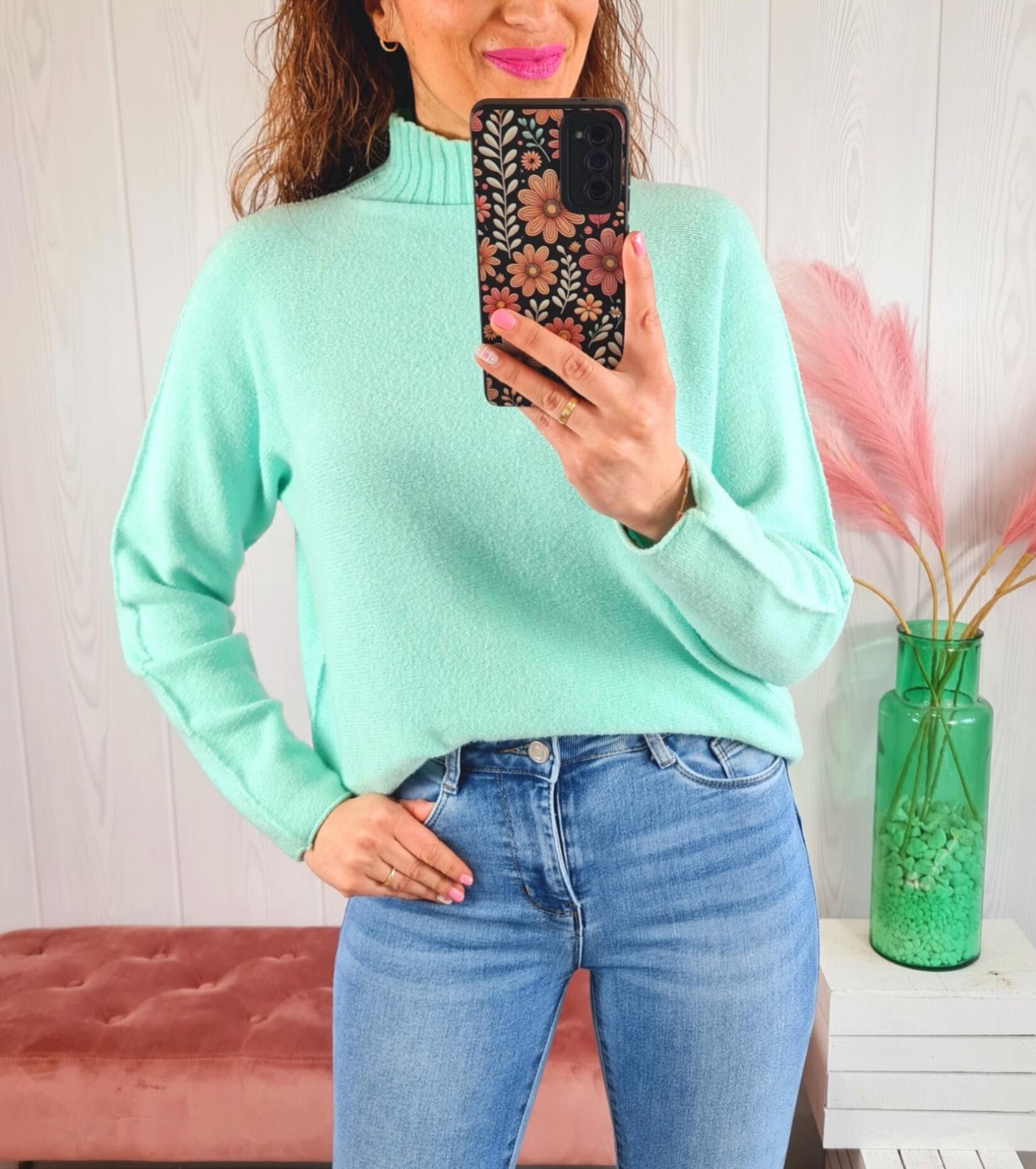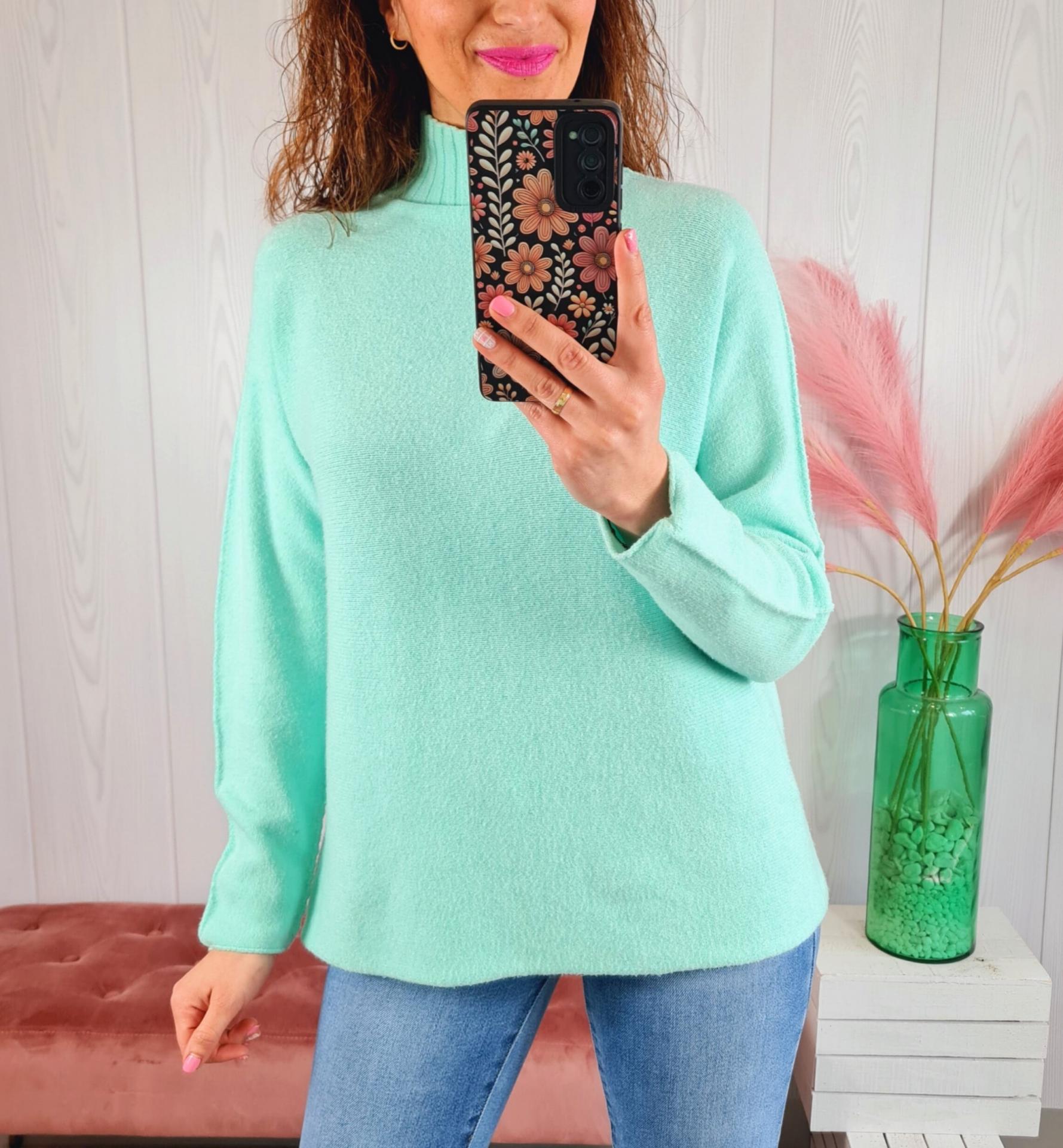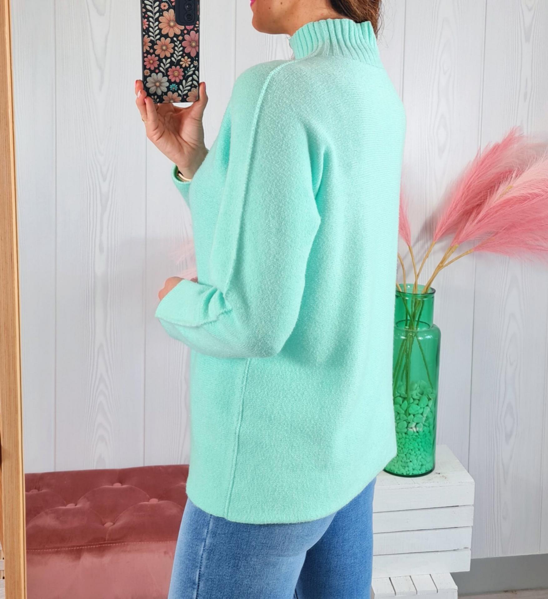 Jersey de color aguamarina liso, con cuello subido y manga larga.