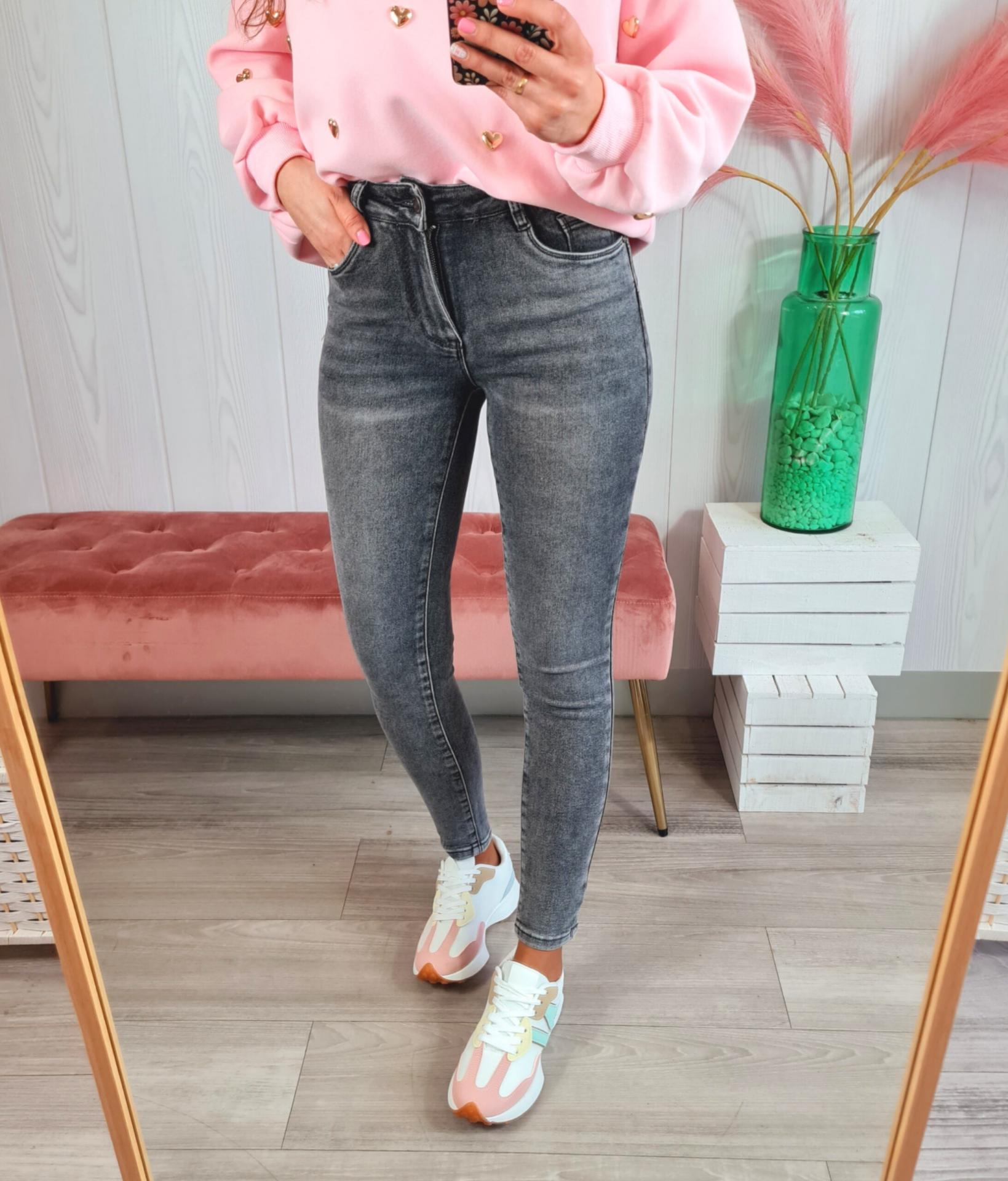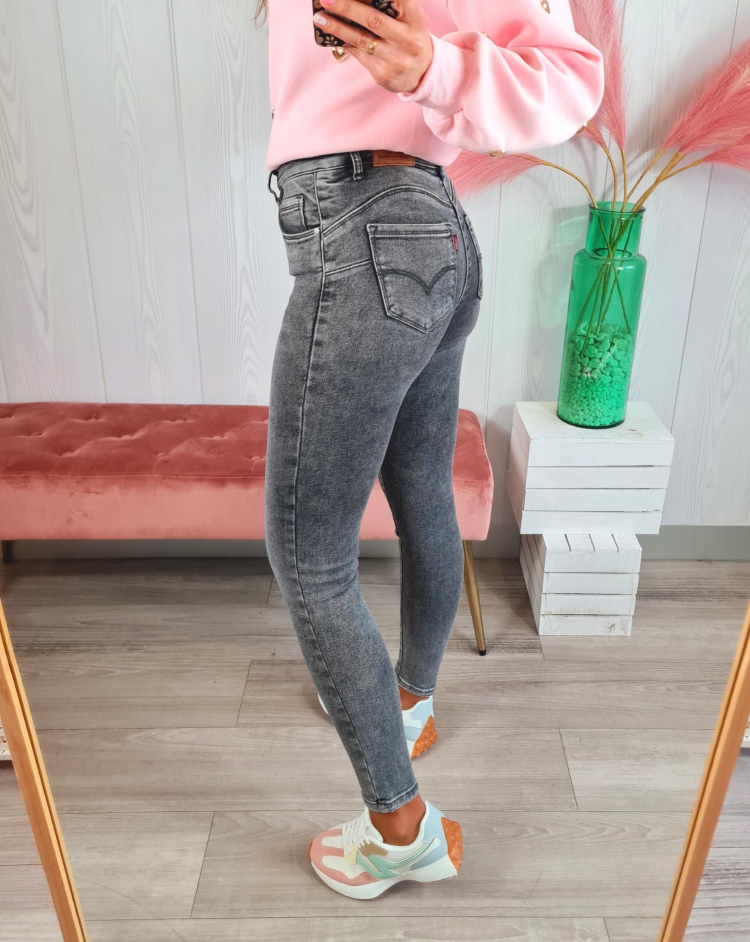 Pantalón vaquero skinny de color gris. Tiene cierre con botón y cremallera y un refuerzo interior para disimular la tripita.