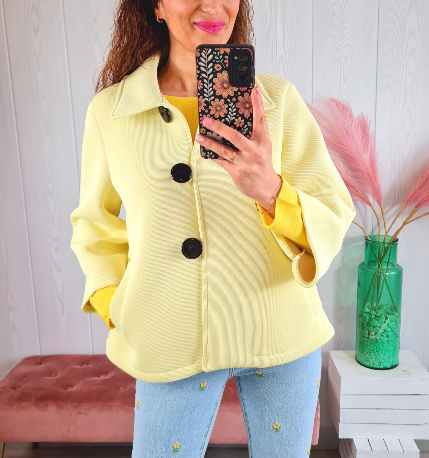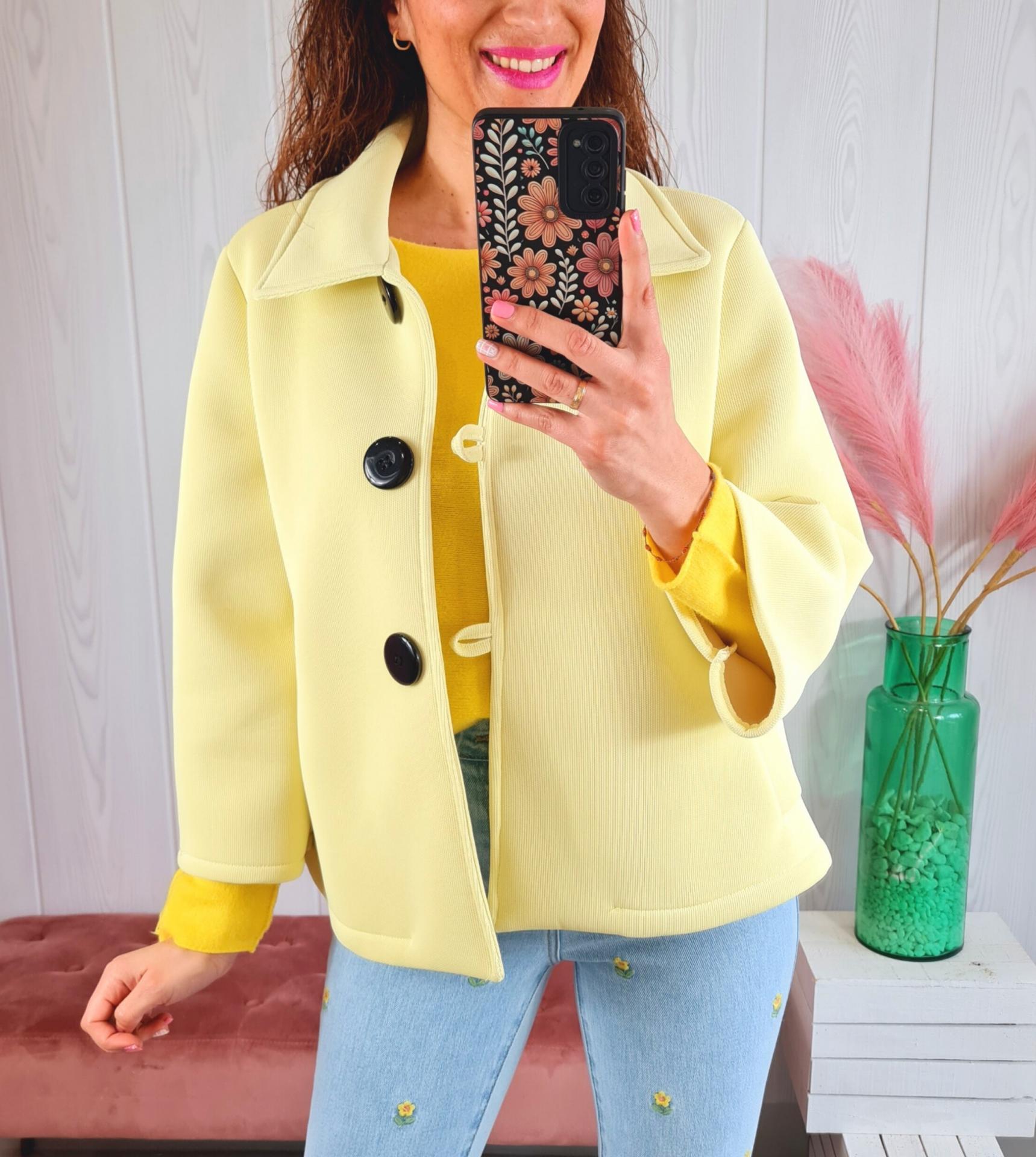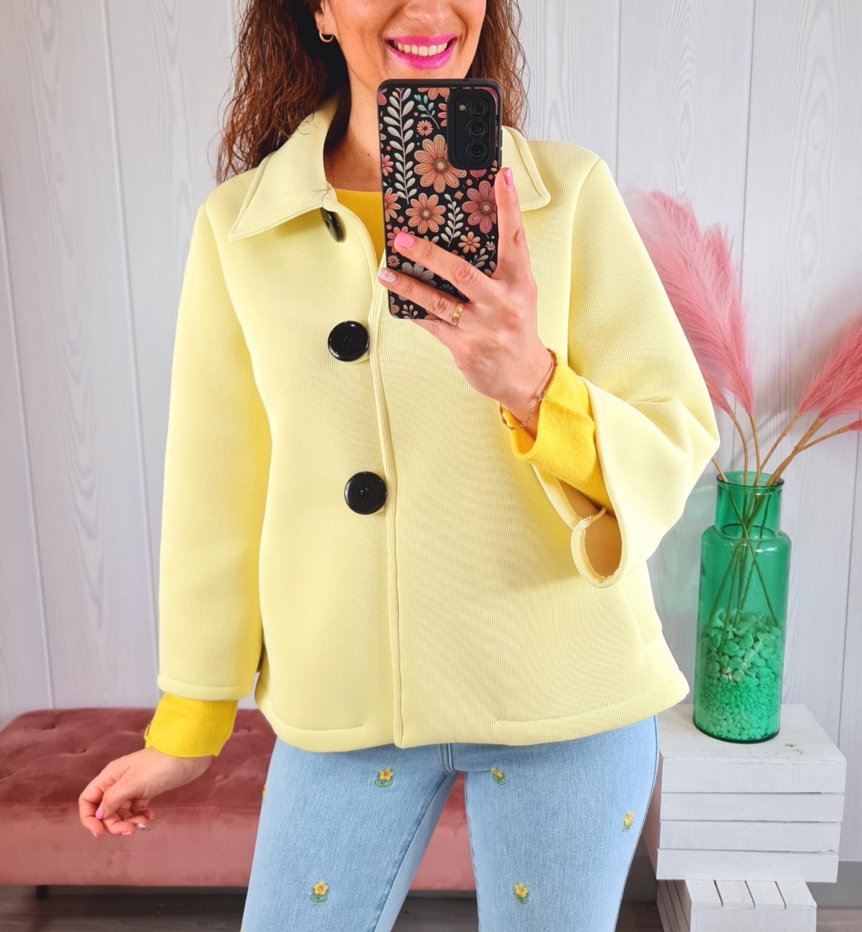 Chaqueta de neopreno en color amarillo, cerrada con tres botones negro, mangas semi-cortas acampanadas y cuello de camisa.