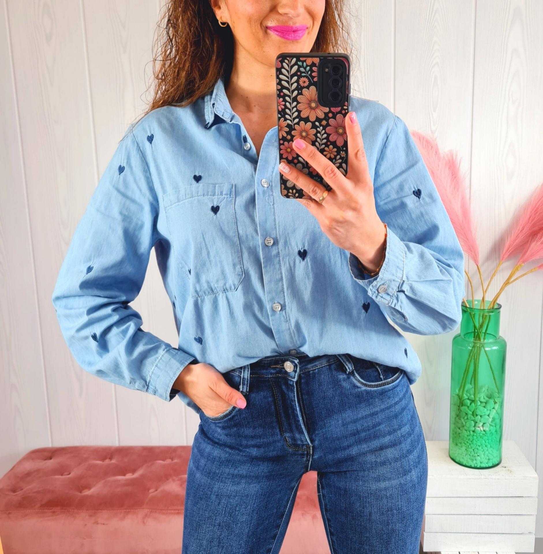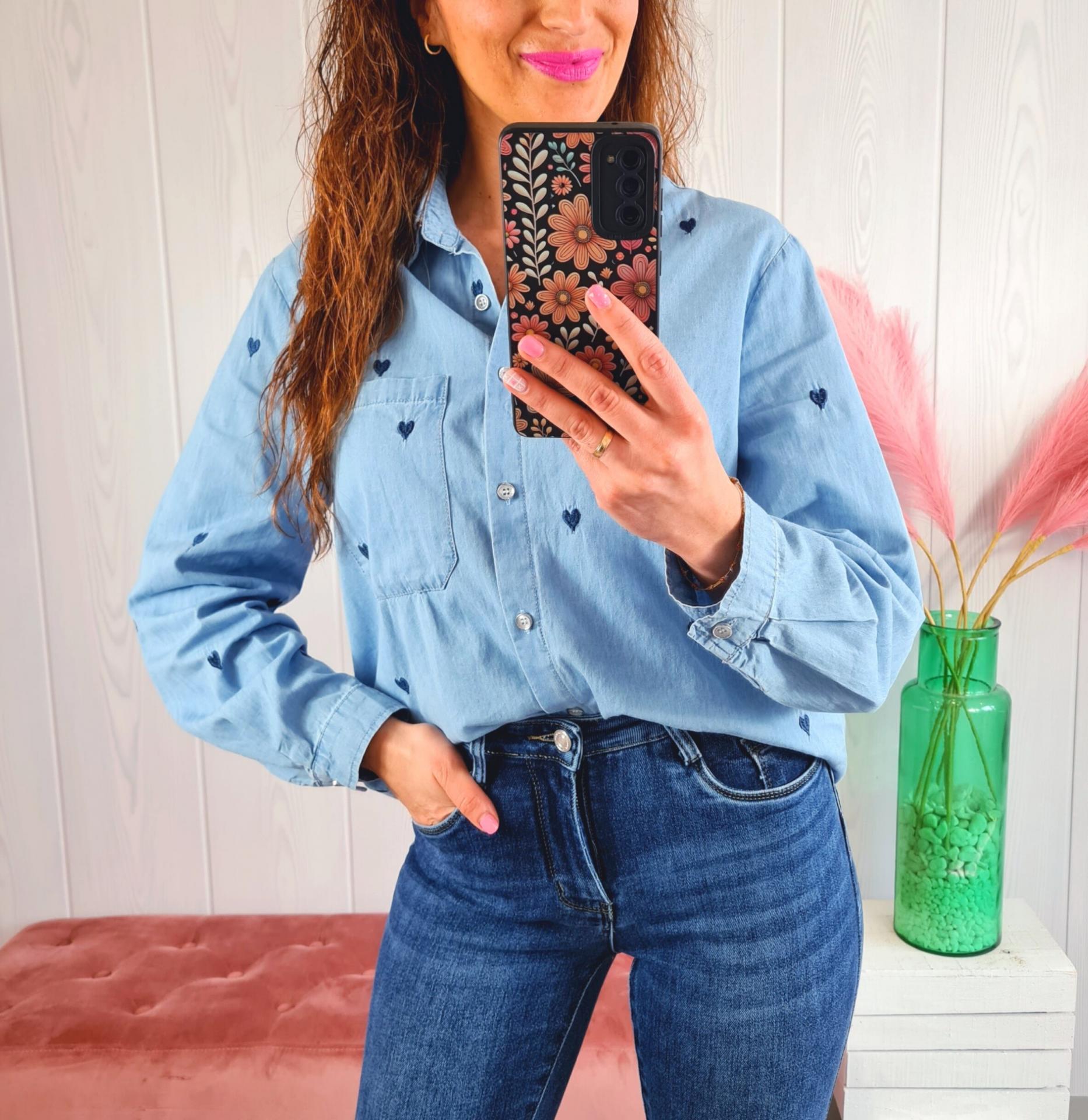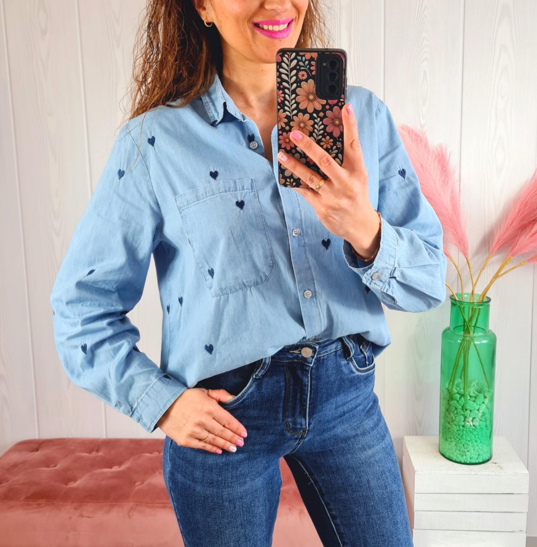Camisa vaquera estilo oversize con corazones bordados en color azul marino. Cierre con botones.