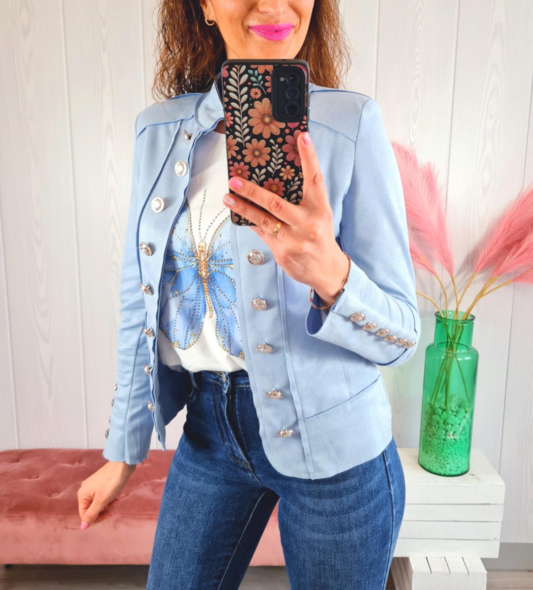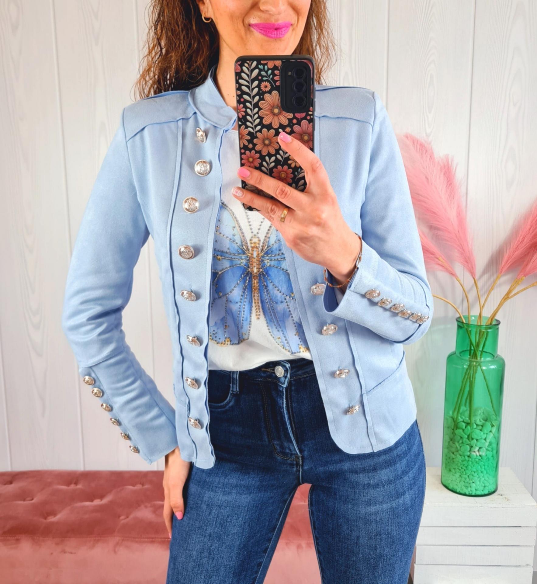 Chaqueta militar de ante, en color azul. Tiene manga larga, falsos bolsillos y hombreras.