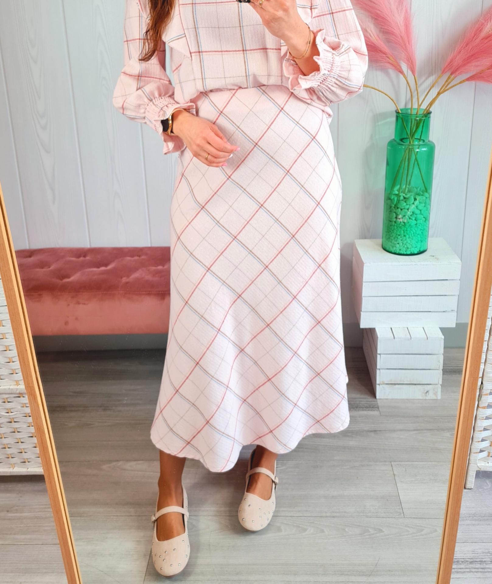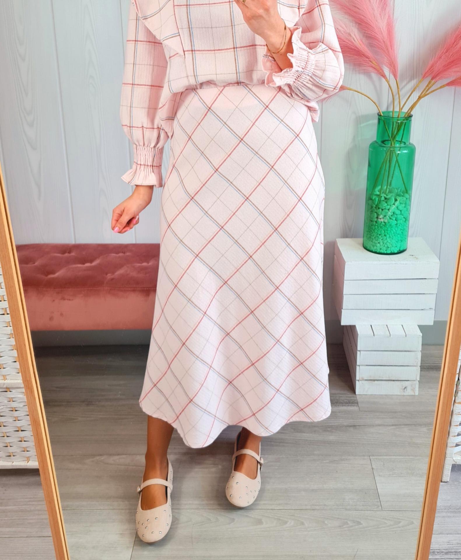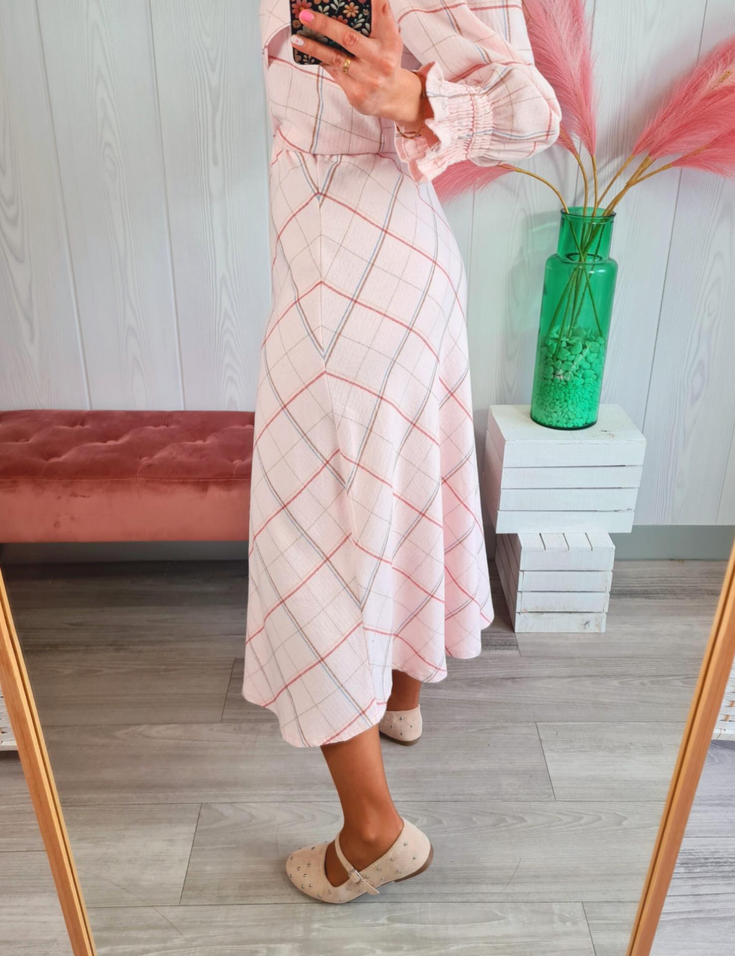 Falda midi de cuadros en color rosa. Tiene cinturilla elástica.