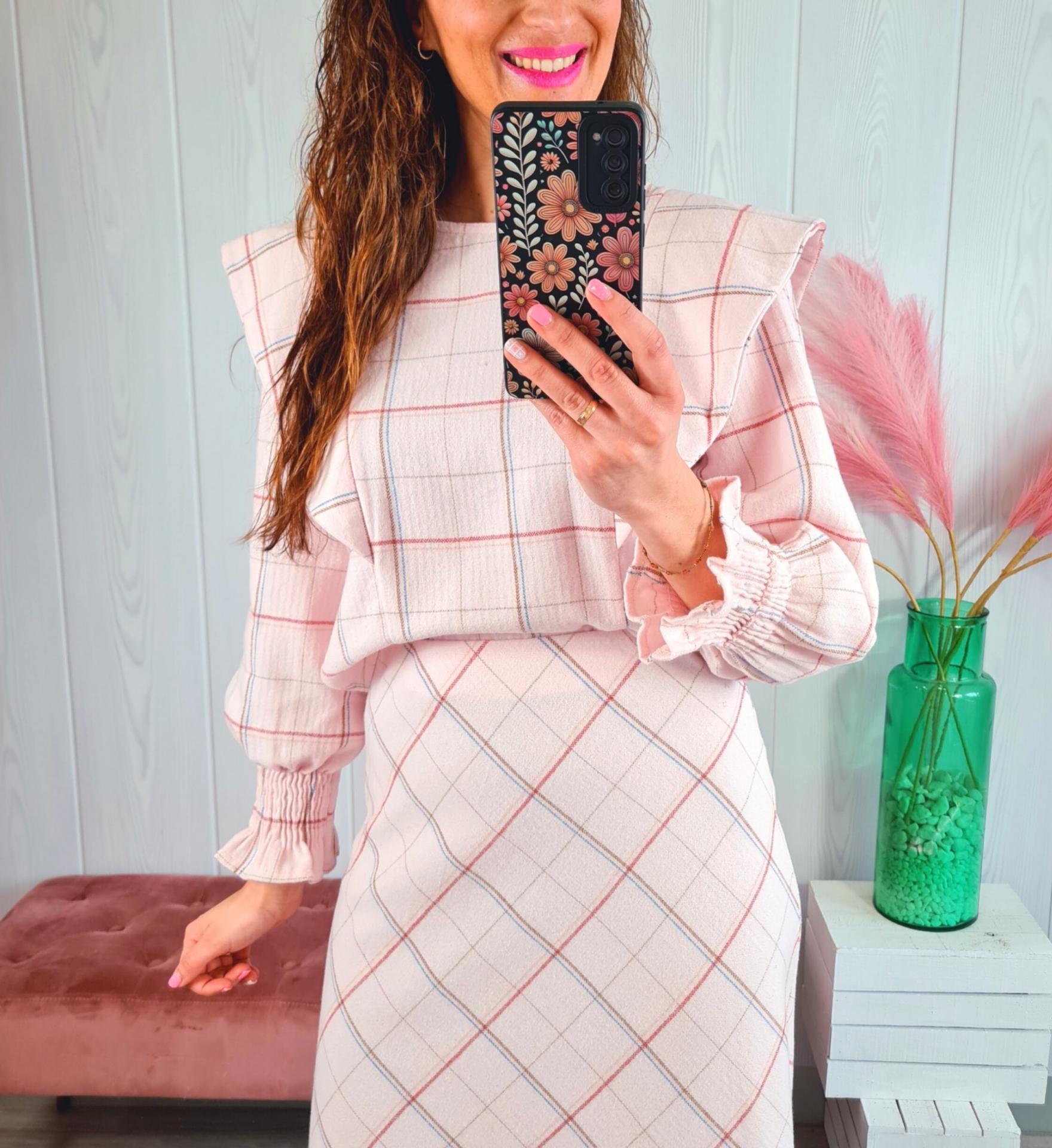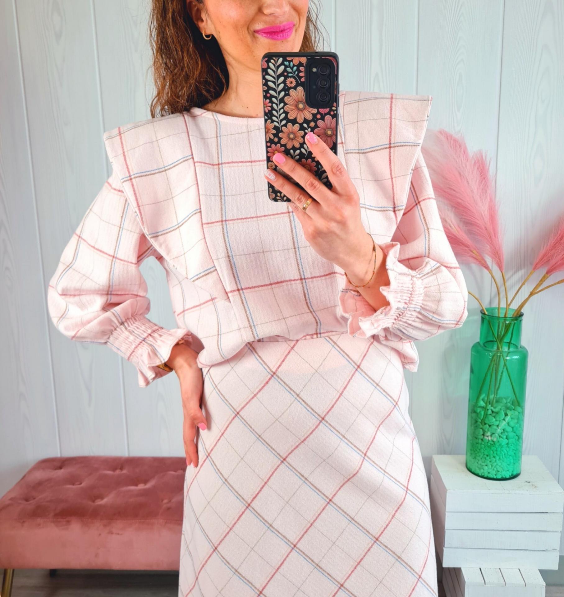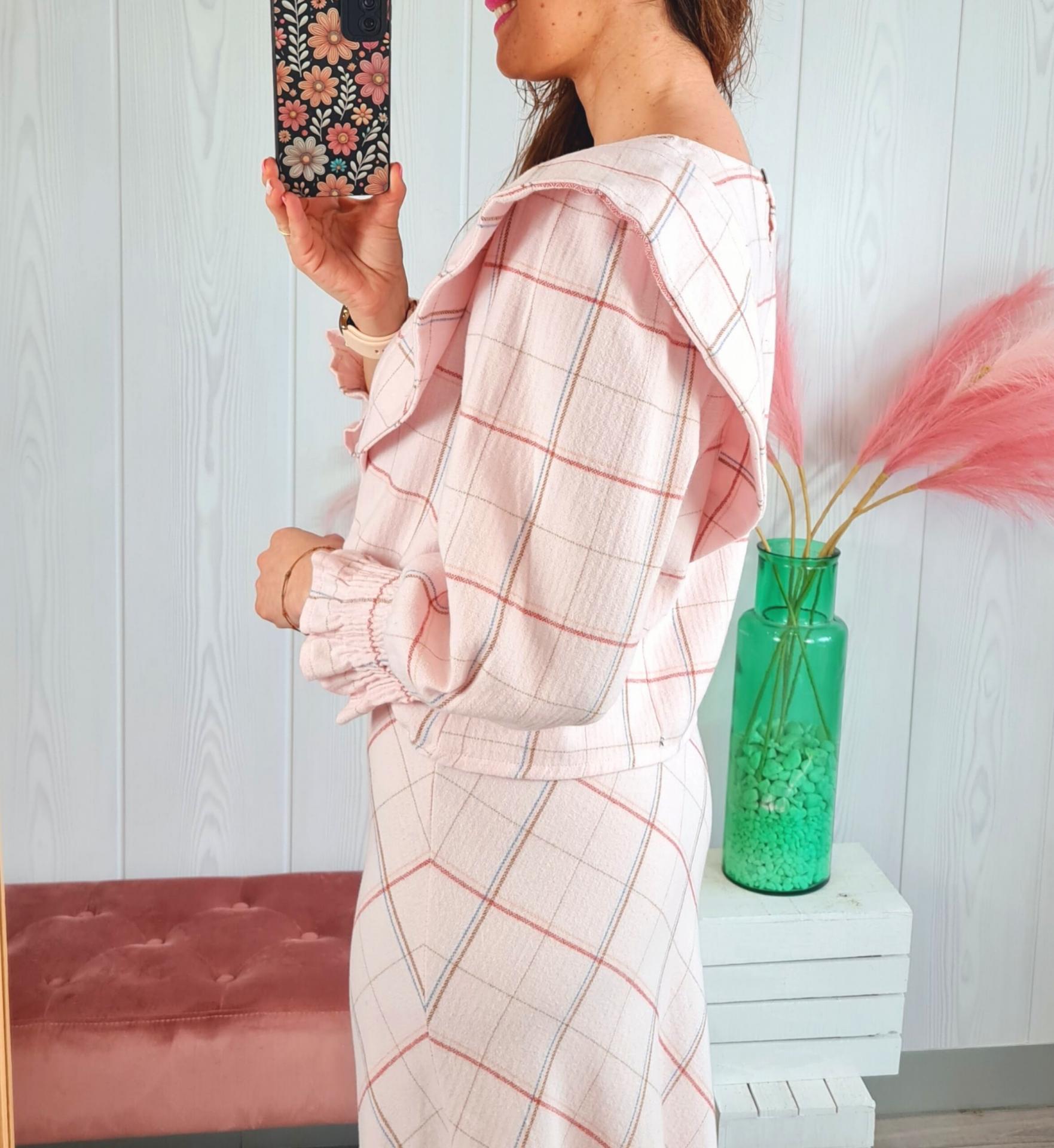 Camisa rosa de cuadros, cuello redondo, volantes en los hombros, y manga larga con puños elásticos. Se abrocha con un botón en la parte trasera del cuello.
