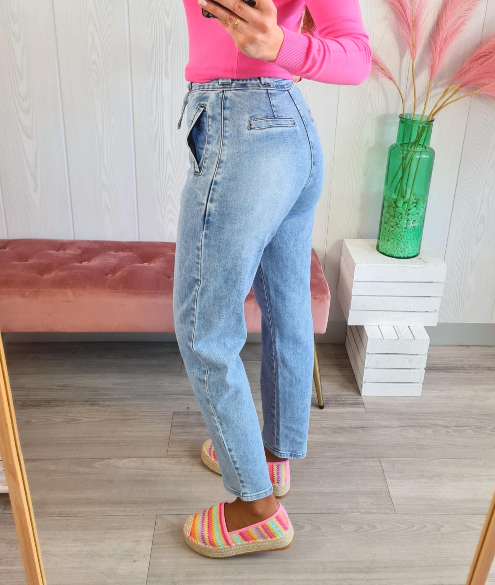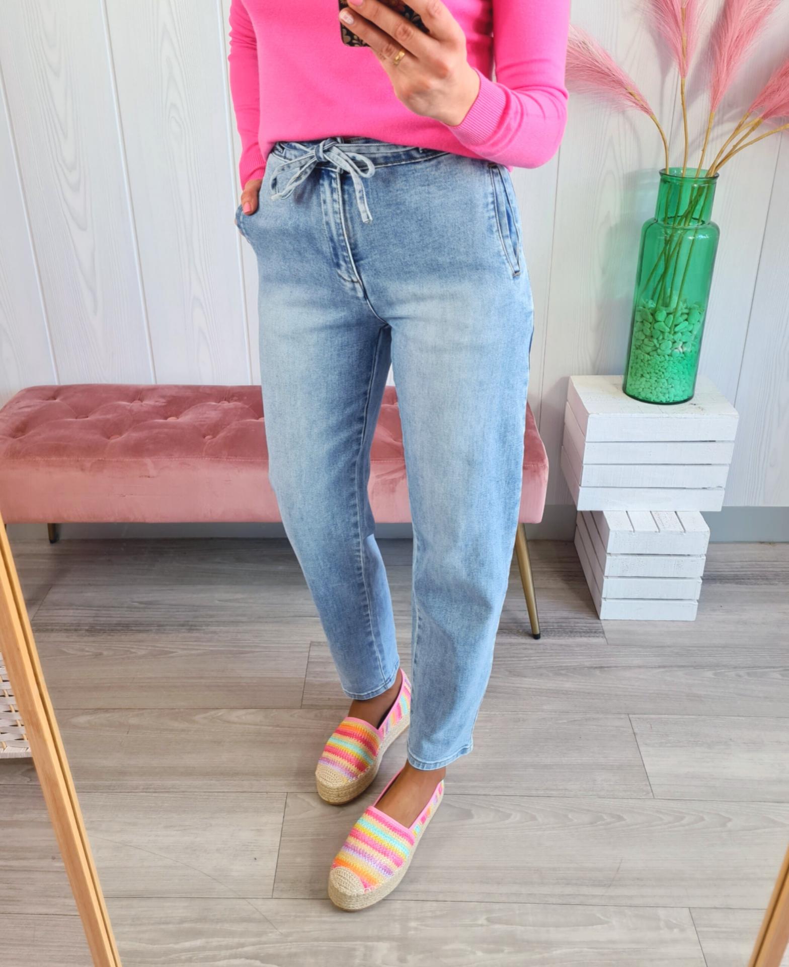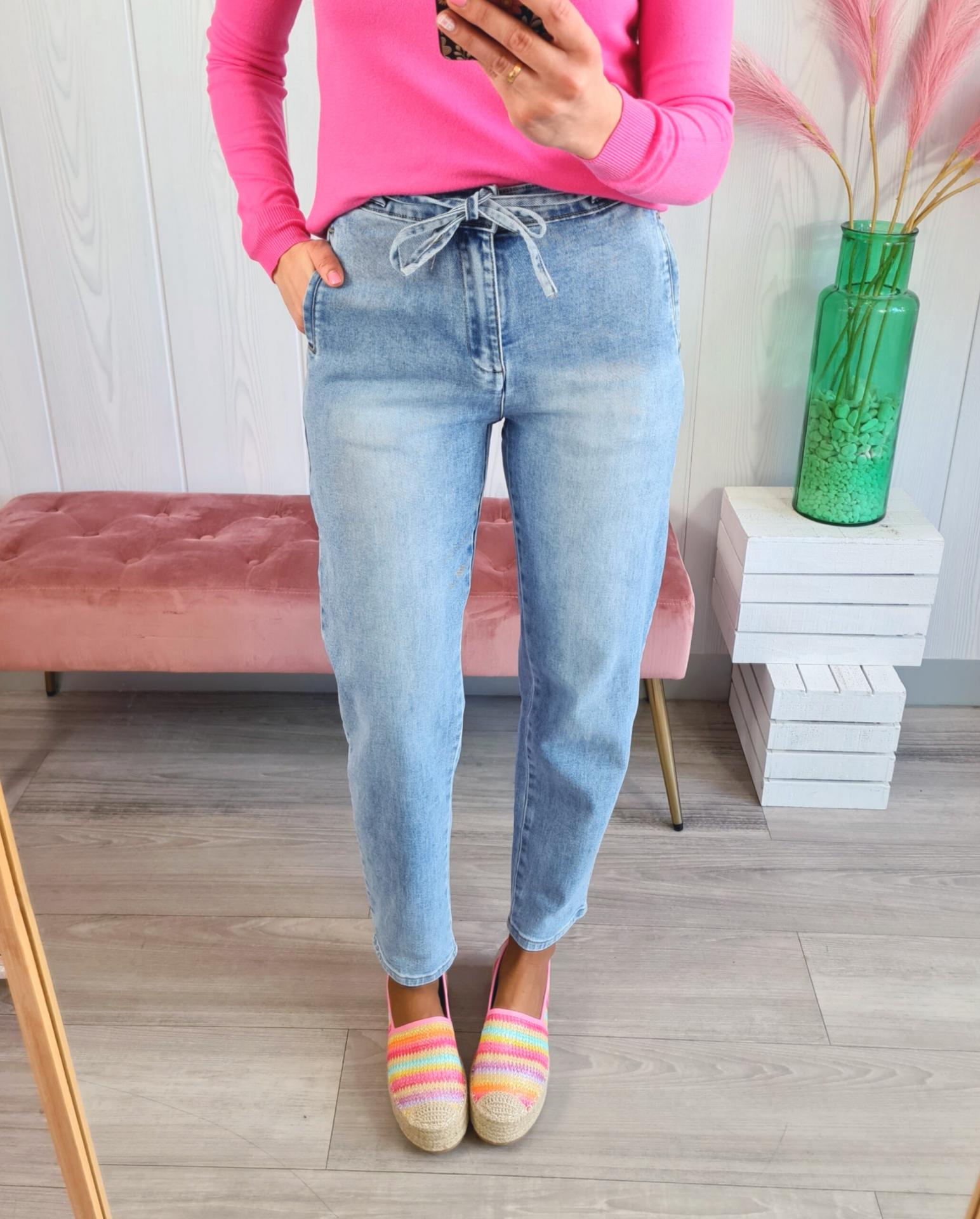 Pantalón vaquero estilo balloon, de color clarito, con lazada de adorno. Tiene cierre con botón y cremallera y bolsillos tipo chino.
