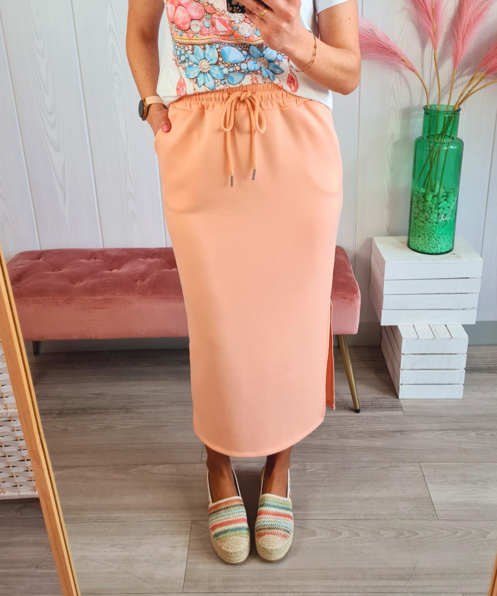Falda larga de color naranja con cinturilla elástica, bolsillos y aberturas laterales.