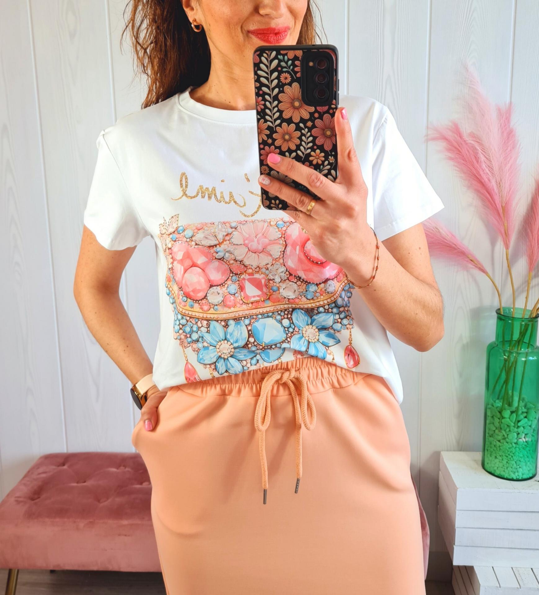 Camiseta de color blanco con estampado impreso en el pecho. Tiene cuello redondo y manga corta.